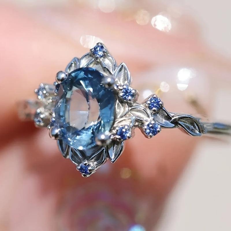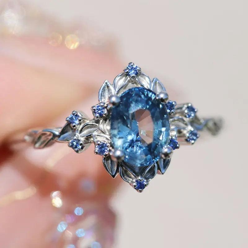 This women's wedding ring features a marine gemstone with floral-like side stones, perfect for engagements, anniversaries, or as a Christmas gift.