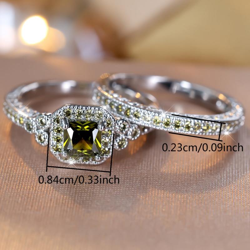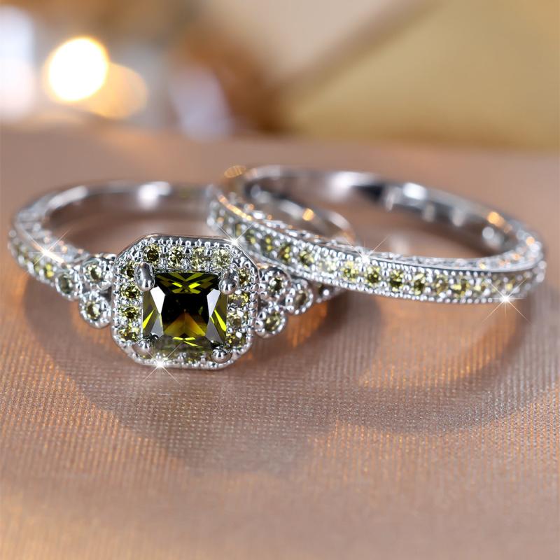 Elegant olive green synthetic zirconia ring set for couples, perfect for anniversary or special occasion. Made of high-quality synthetic materials with a light and fresh design.