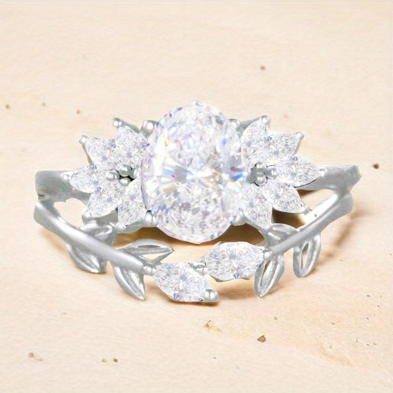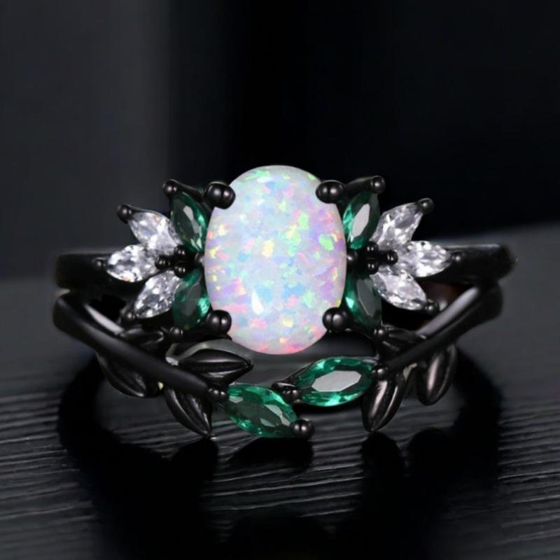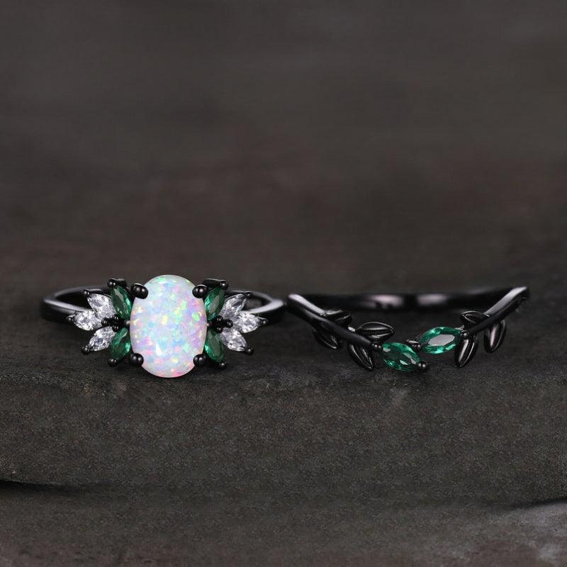 This 2-piece ring set features sparkling oval opal and cubic zirconia stones in a leaf design. Perfect for engagements, weddings, anniversaries, and as a Mother's birthstone gemstone ring.