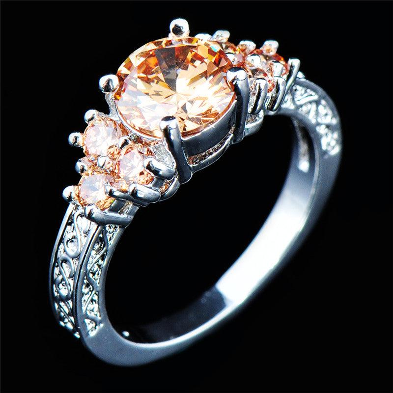 Gorgeous pink champagne cubic zirconia ring, perfect for weddings and engagements. Sparkling crystal CZ ring that adds a touch of elegance to your accessories collection.