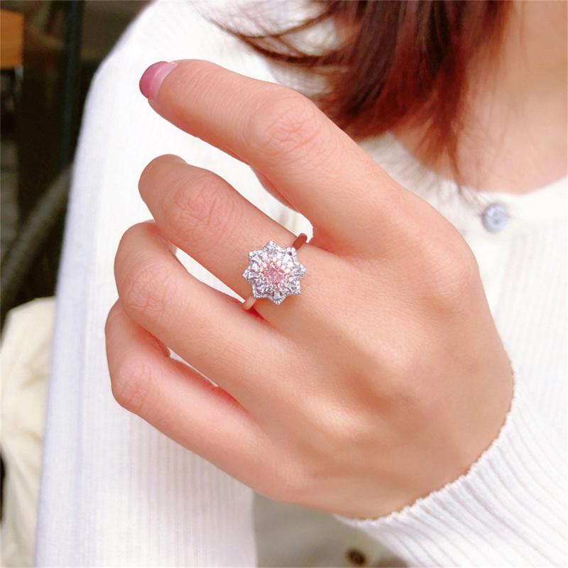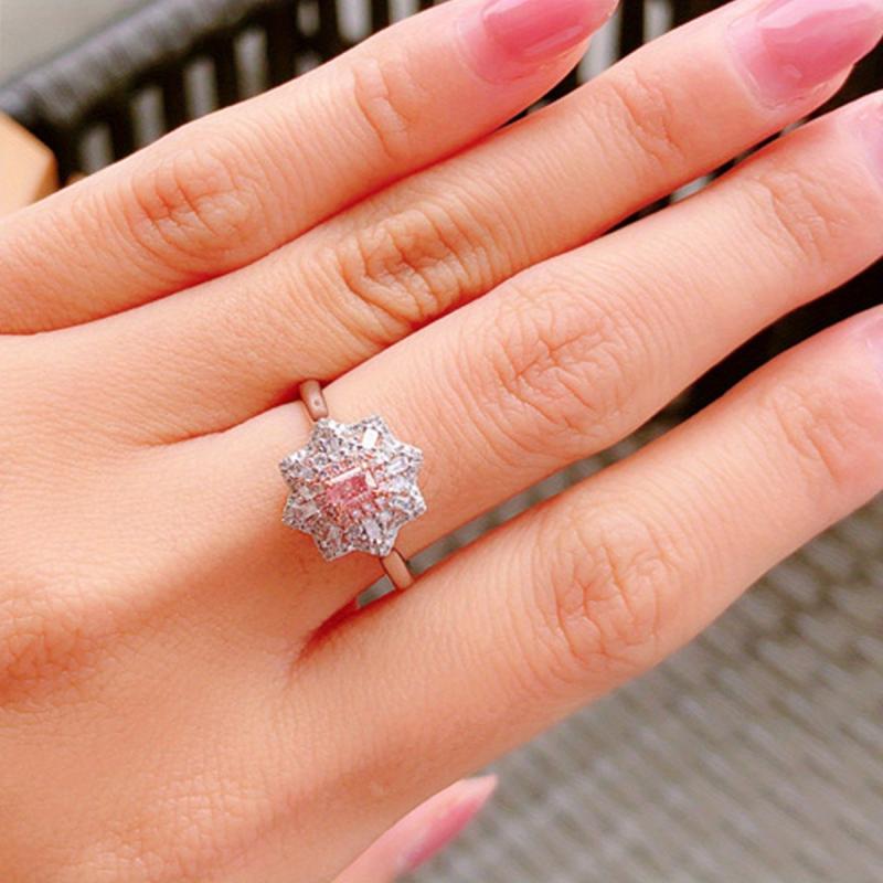 This beautiful ring features a prong-set pink zirconia in a sunflower design with a mix of silver and rose gold. Perfect for a promise ring or wedding band.