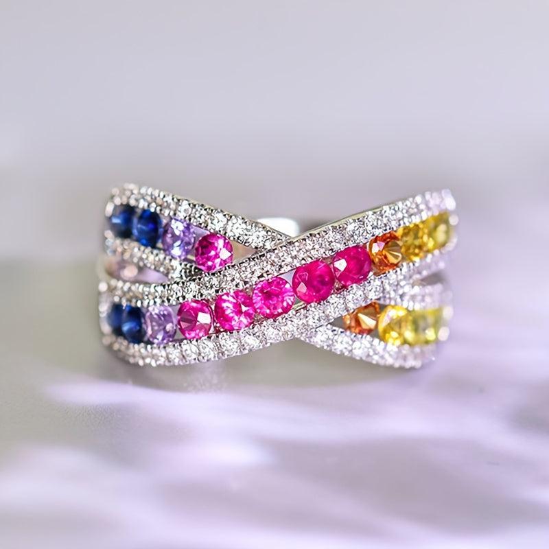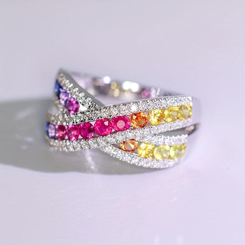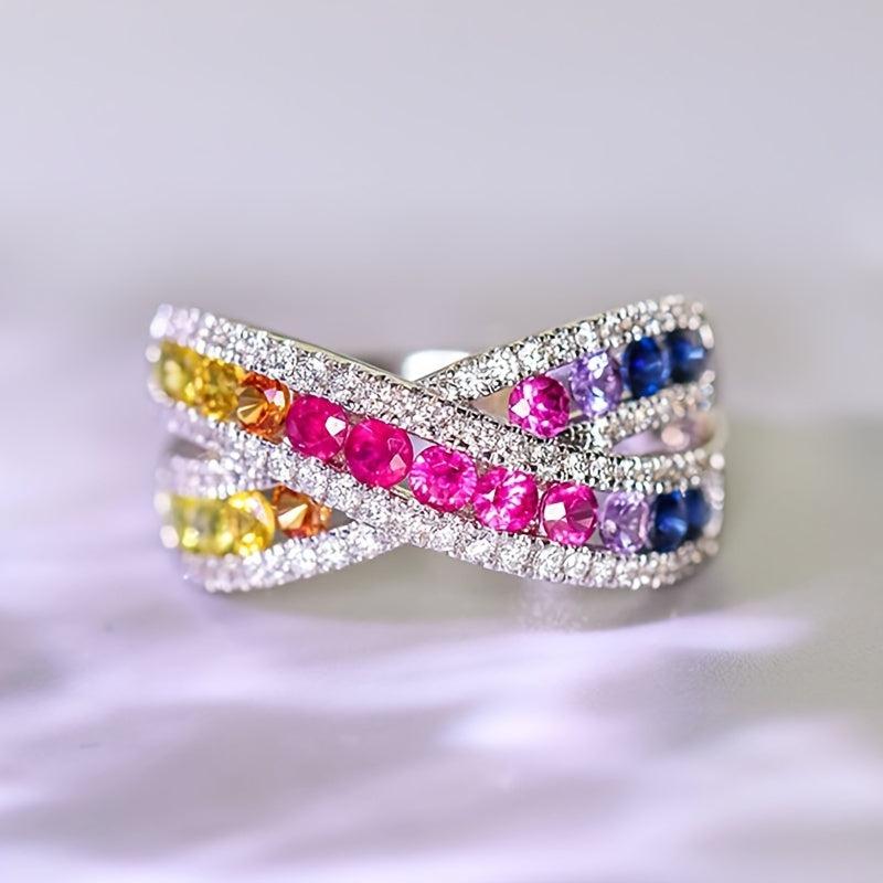 Make a statement with these stunning Rainbow CZ Cross Rings for women. Perfect for weddings, parties, or everyday wear. The silvery finish adds a touch of elegance to your outfit.