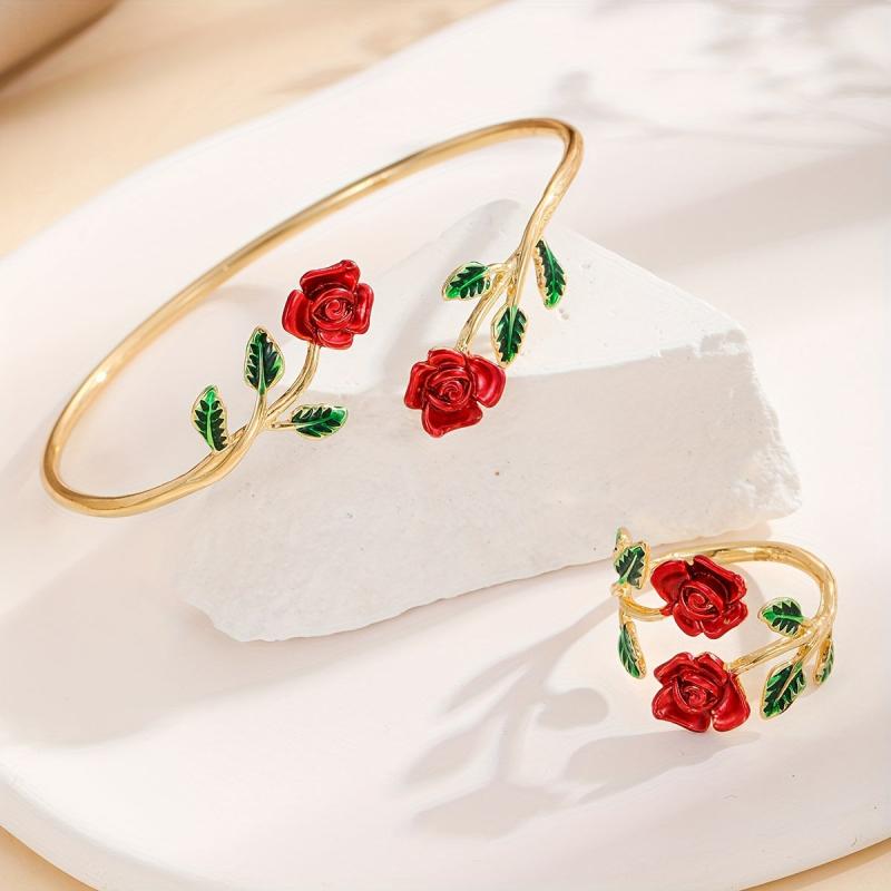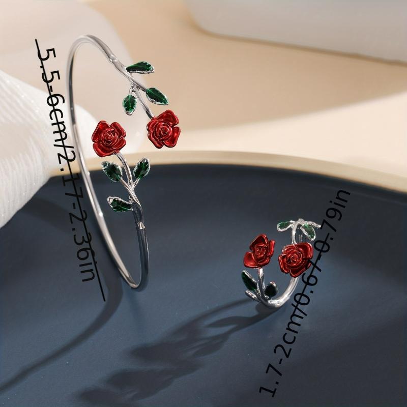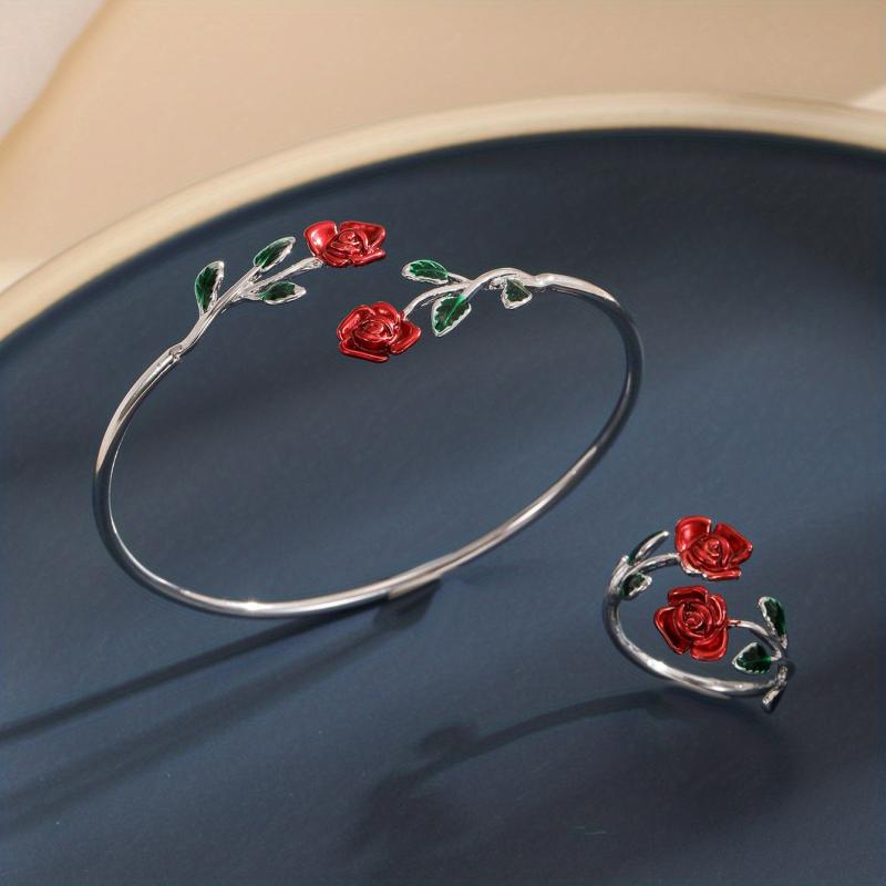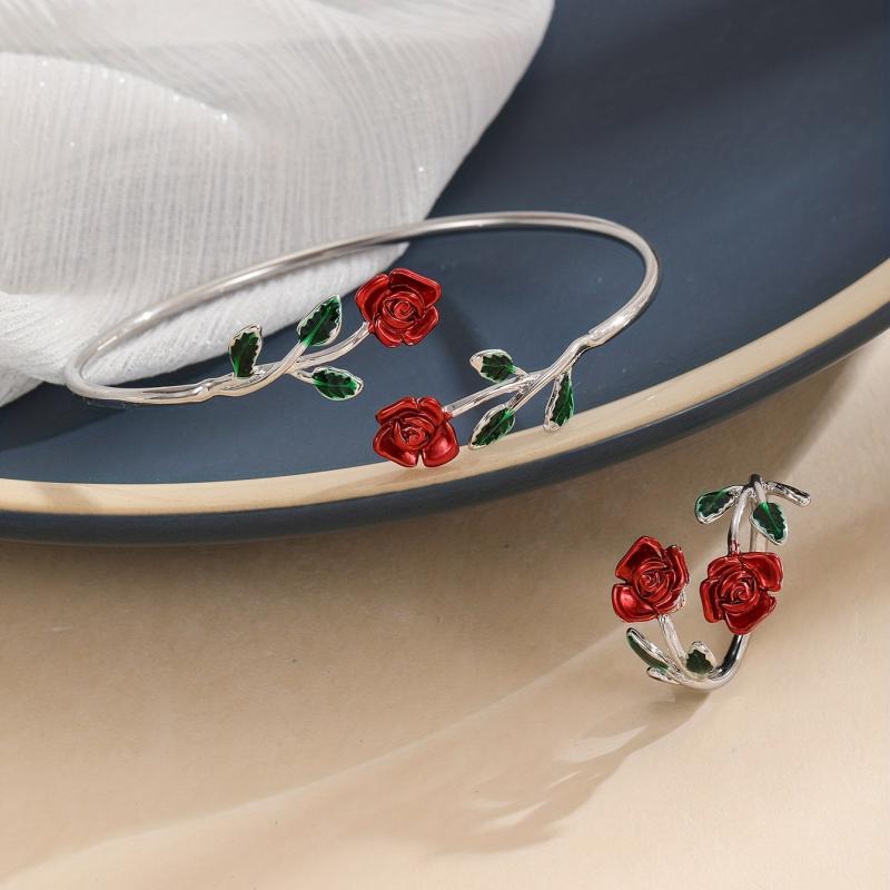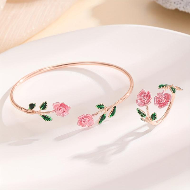 This elegant set features a rose flower bangle and ring, perfect for adding a touch of nature-inspired beauty to any outfit. It makes a thoughtful gift for women who appreciate floral accessories.