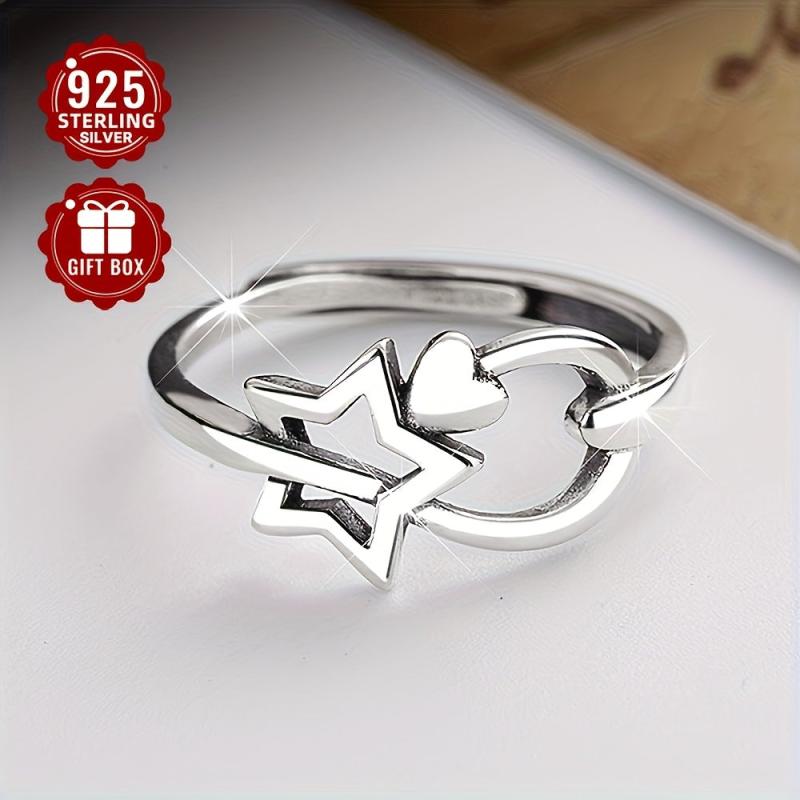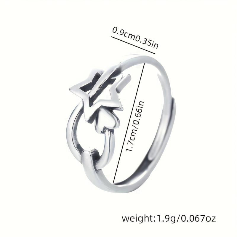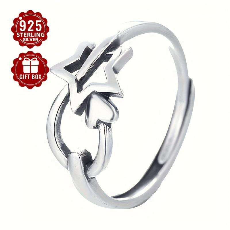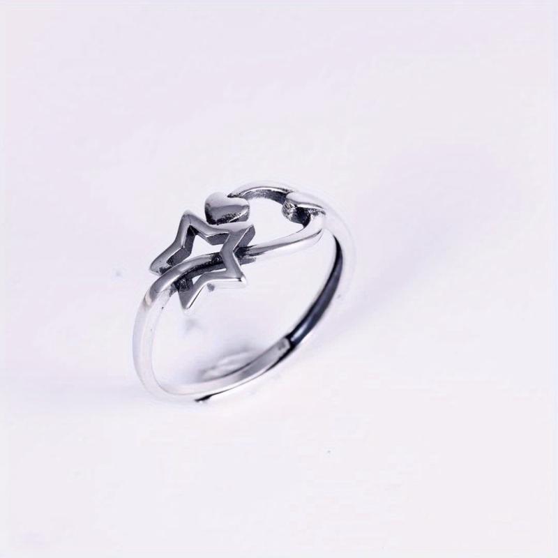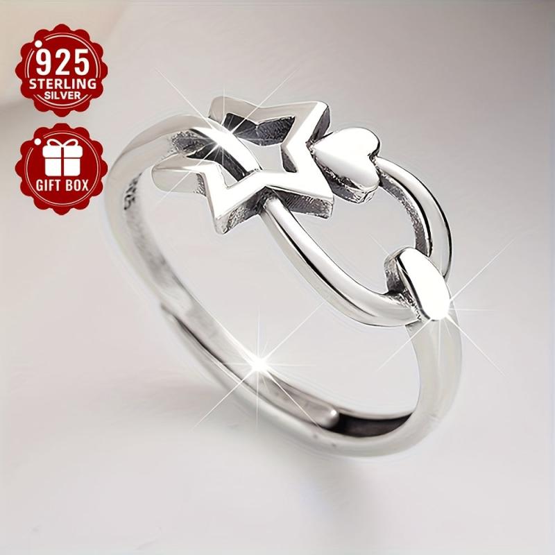 Elegant S925 pure silver open ring with vintage design featuring a hollow five-pointed star. Adjusts to fit all sizes, suitable for daily wear or special events.