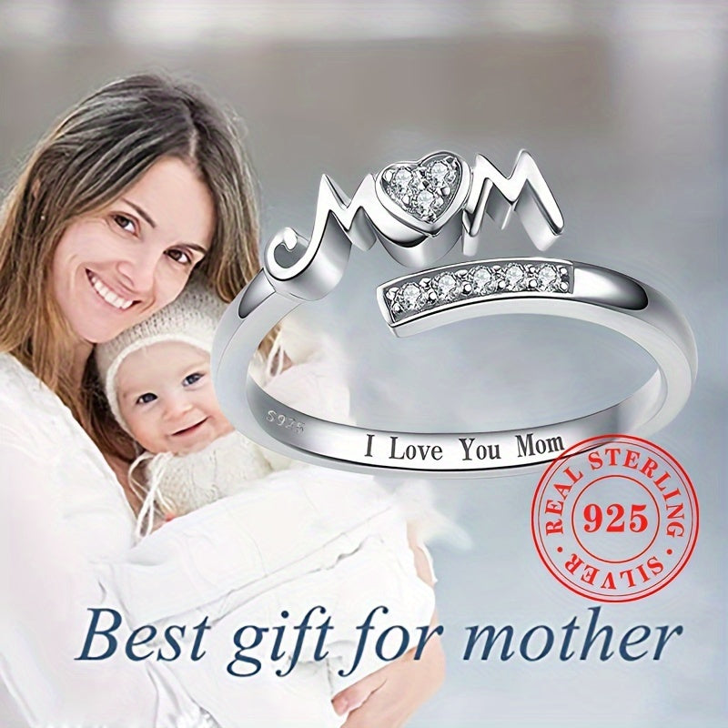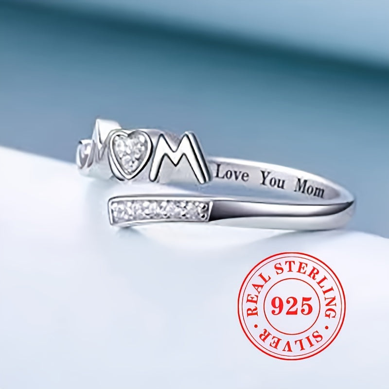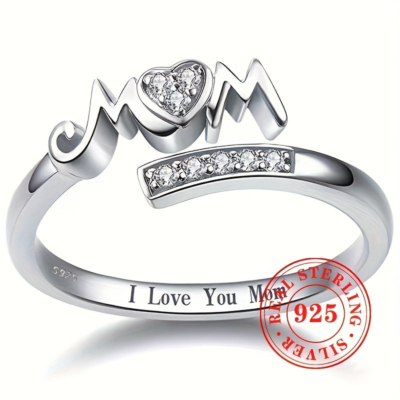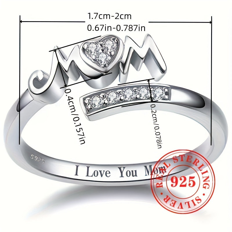 Show your love for Mom with this elegant adjustable ring made of 1.7g of S925 sterling silver and synthetic zirconia. The heart-shaped design features the letters 'MOM' for a heartfelt touch.