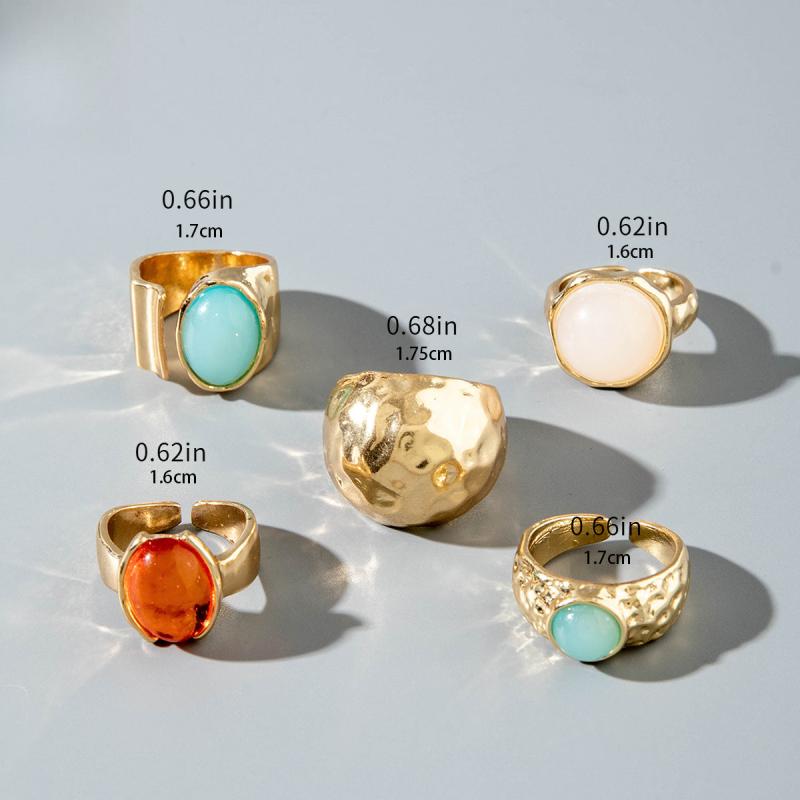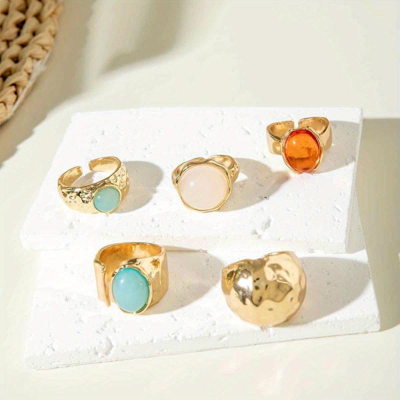 This set includes 5 vintage-inspired rings featuring geometric and irregular designs. They are made of alloy with a KC golden plating and plastic mosaic details. Perfect for daily wear or as a gift for a special someone.