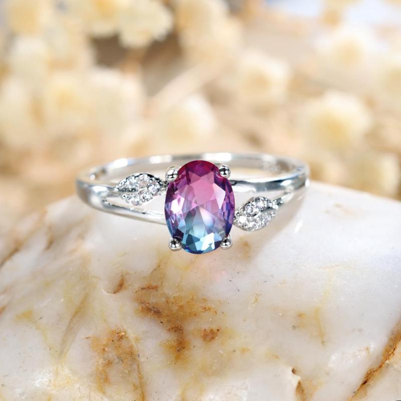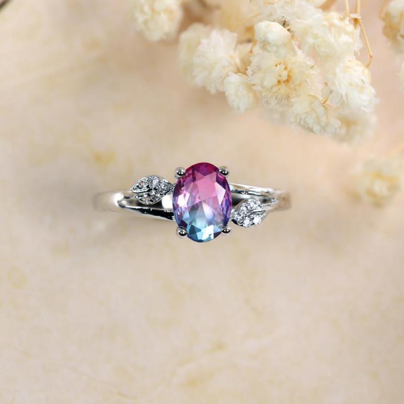 This stunning ring features a silvery finish with an oval cut rose red and blue stone set in a leaf style design, symbolizing love and engagement.