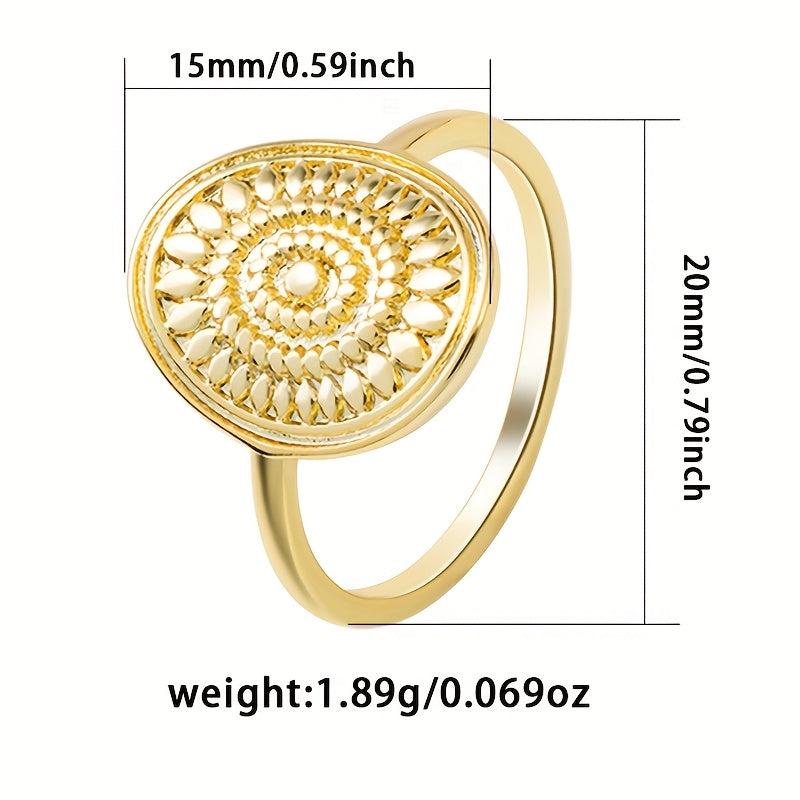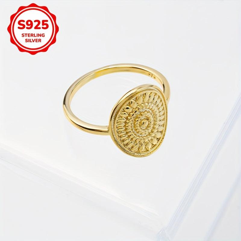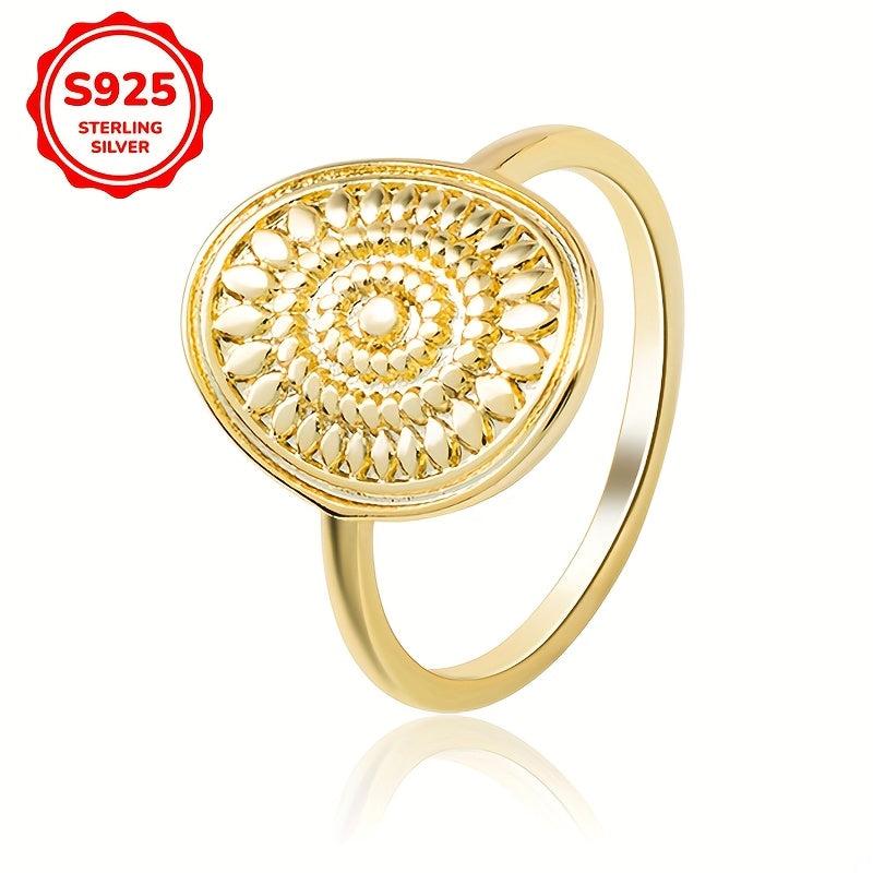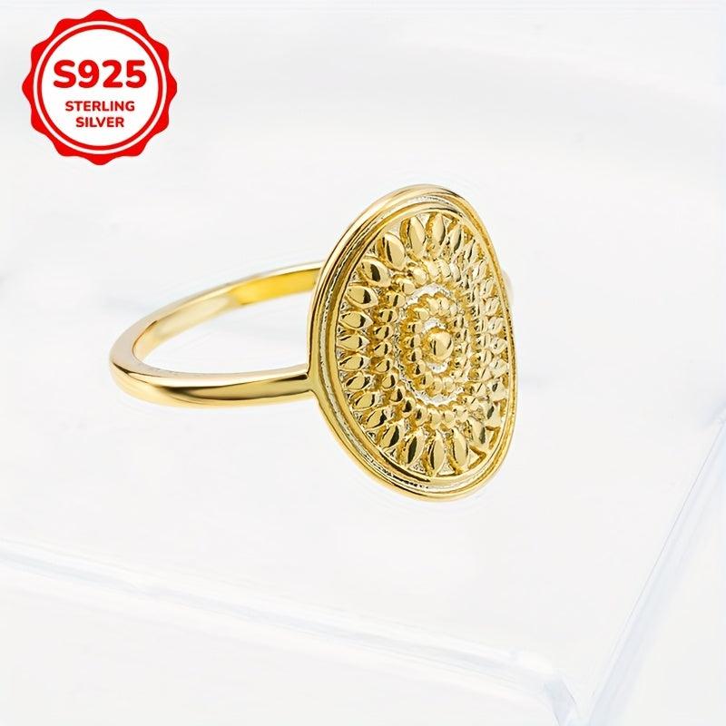 This boho vintage style ring features a sunflower pattern, crafted from 925 sterling silver with a golden plated wide band design. It weighs 1.89g and is perfect for daily wear. Ideal gift option included.
