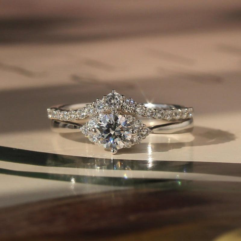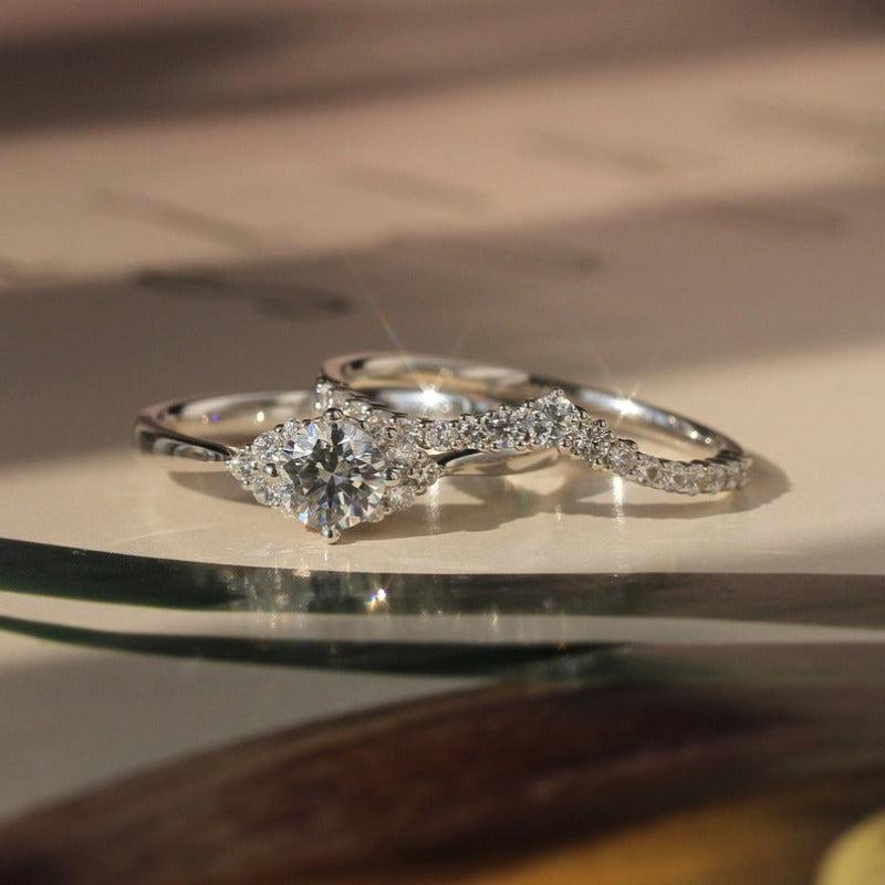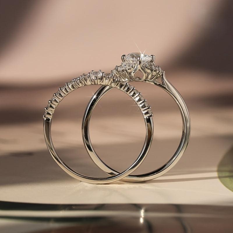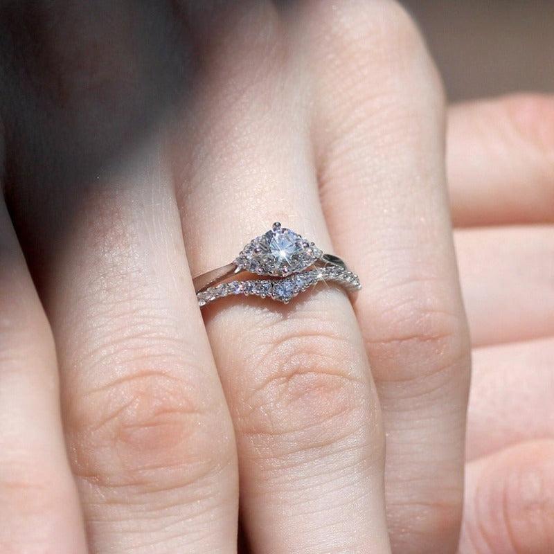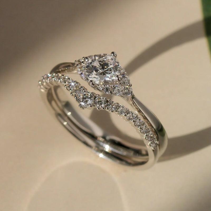 This dazzling 2-piece set features a V-shaped engagement ring with rhinestone pave set band paired with a matching band for a stylish and elegant look. Perfect for engagements, weddings, or promise rings.