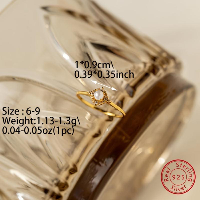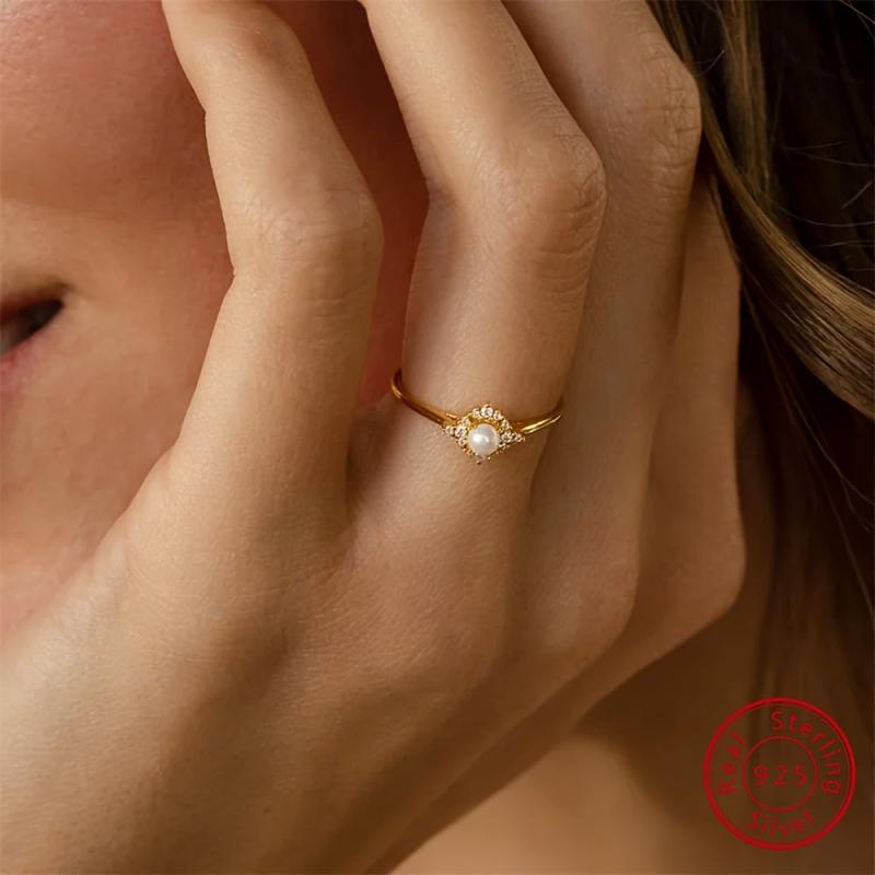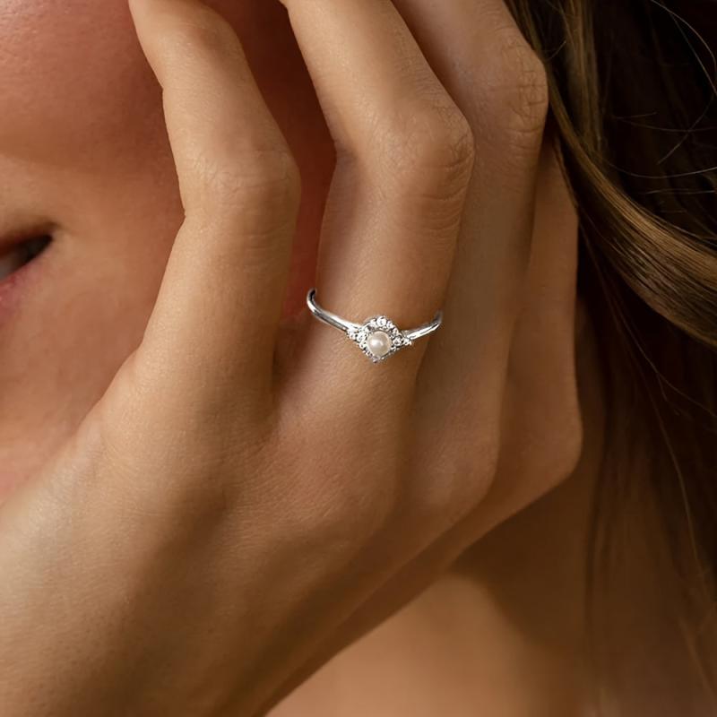 This lightweight ring features synthetic zirconia and shell pearl in a geometric design. Ideal for daily wear or as a Valentine's gift.
