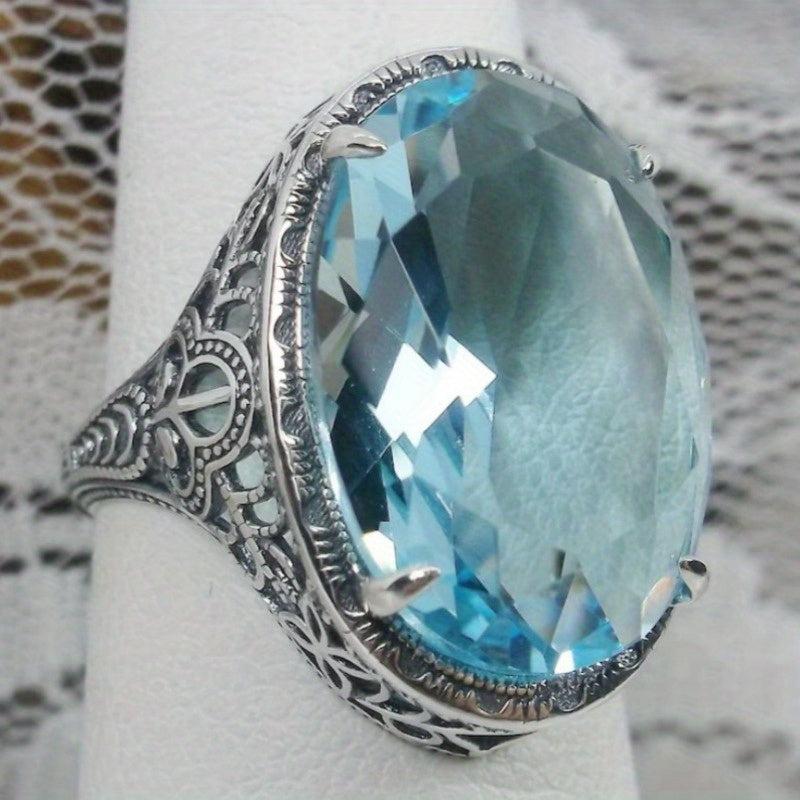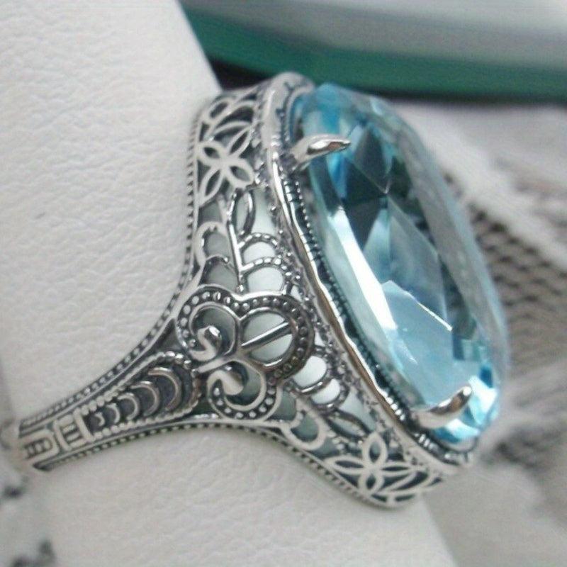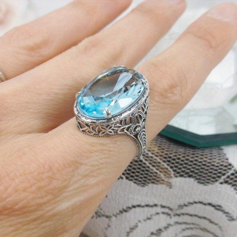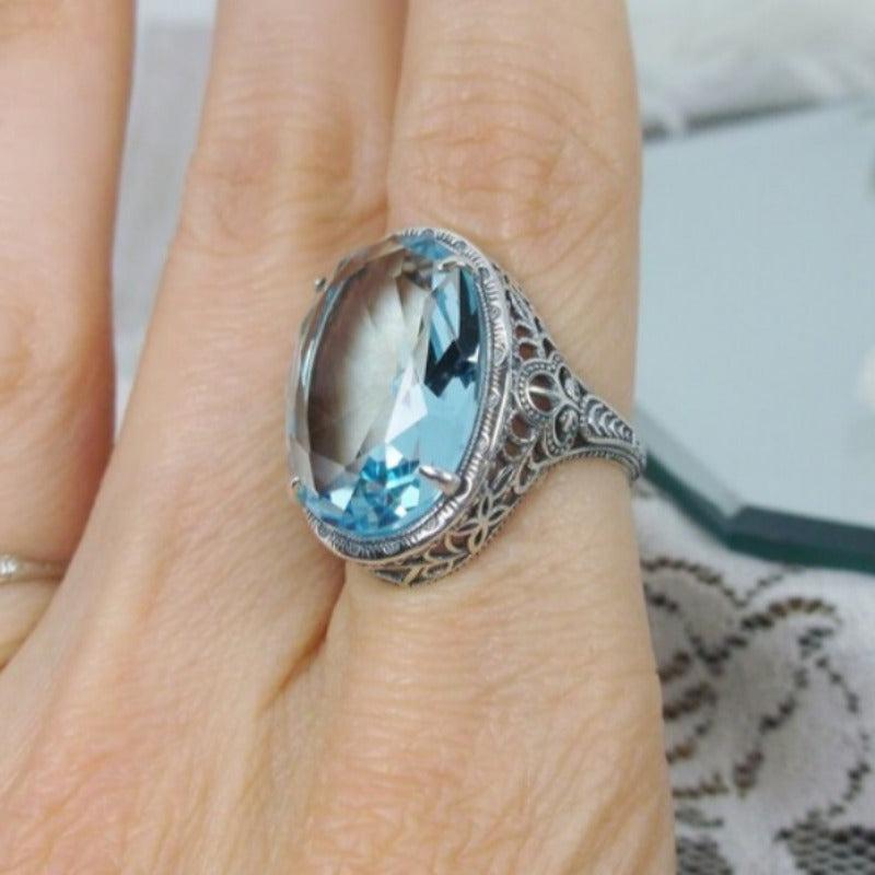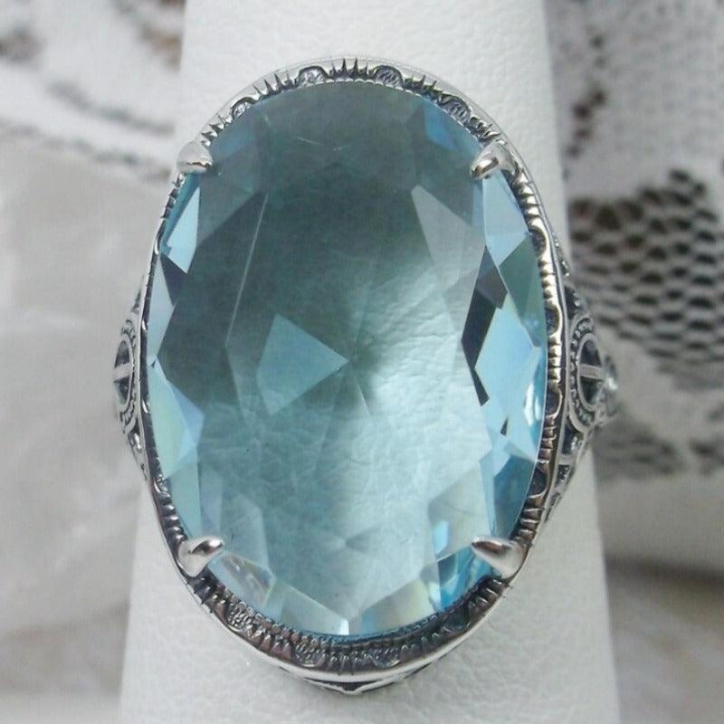 Elegant vintage style ring featuring an oval simulated aquamarine gemstone set in a beautiful filigree design. This Art Deco inspired ring is perfect for adding a touch of timeless beauty to any outfit.