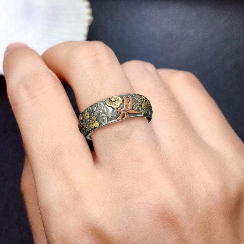 This vintage Bohemian ring features intricate floral designs of dragonflies and sunflowers with a synthetic gemstone. It is golden plated, making it an ideal gift for weddings, anniversaries, or as a mother's gift for women who appreciate unique jewelry pieces.