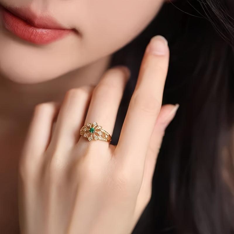 This vintage-style ring features a hollow design with synthetic emerald gemstone inlay. Perfect for daily wear or special occasions like weddings or anniversaries.