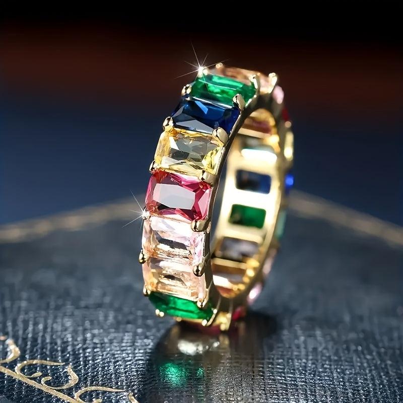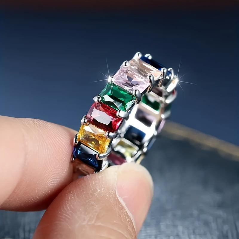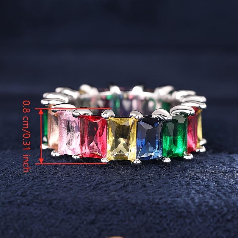 Glamorous eternity ring featuring multicolor cubic zirconia stones on a wide band. Perfect for daily wear, parties, banquets, and as a gift. Made of copper base with a glittery style.