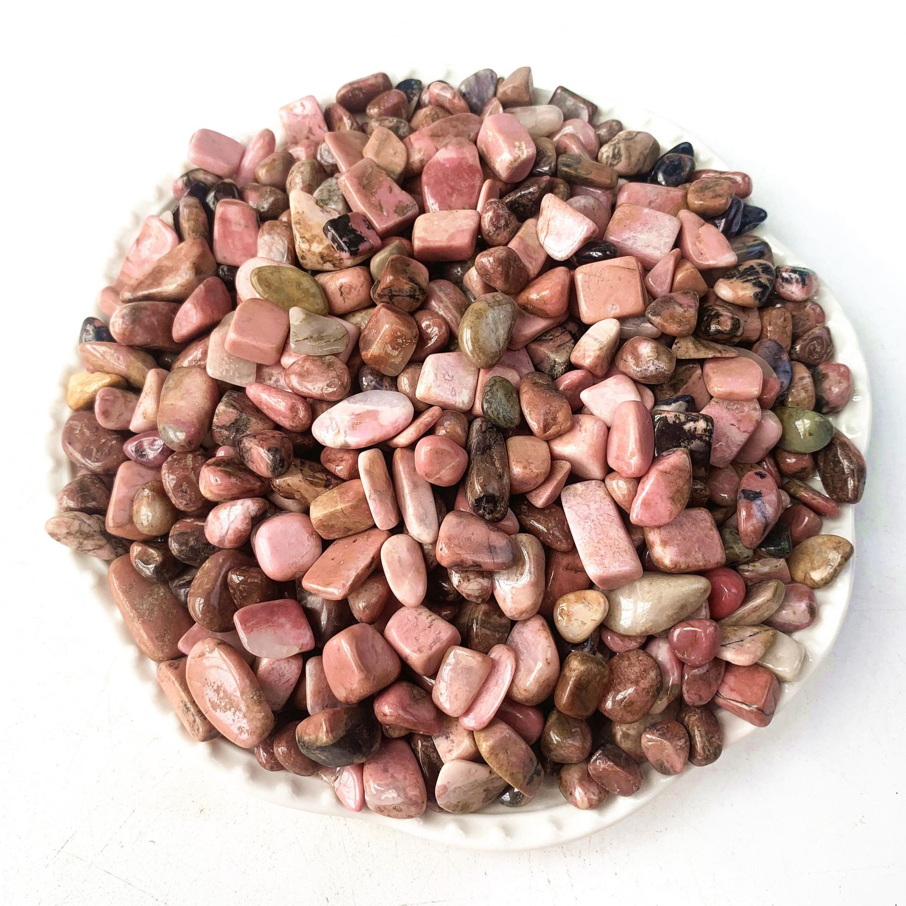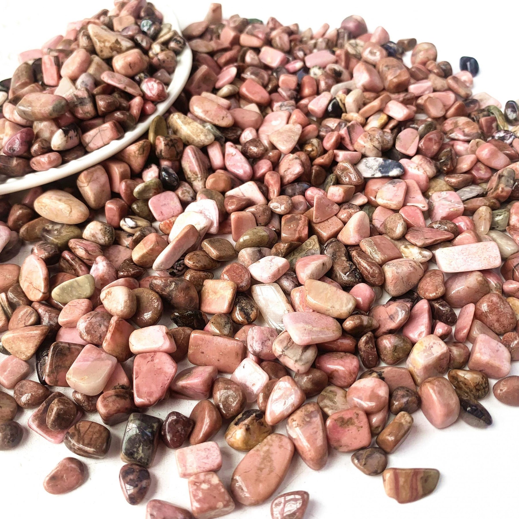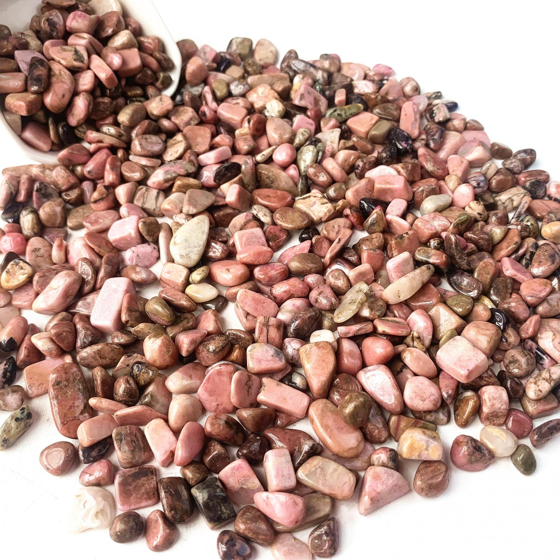 Experience the healing power of Rhodonite with these polished stone crystal chips. Ideal for Reiki, yoga, energy therapy, and more.