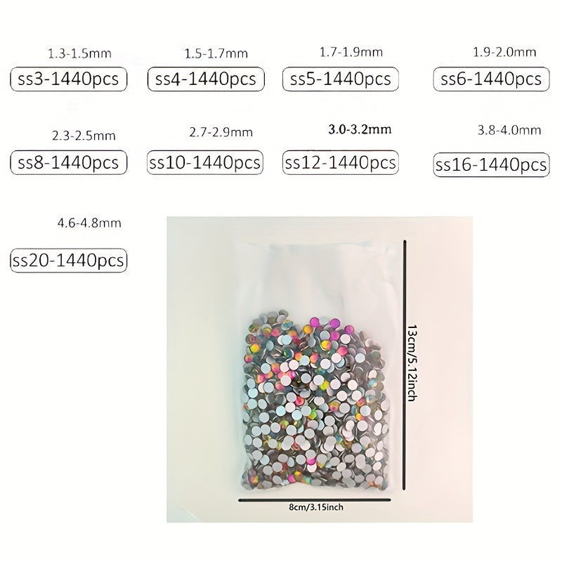 Enhance your DIY jewelry projects with this pack of 1440pcs colorful flat bottom rhinestones. Perfect for adding sparkle and style to your creations.