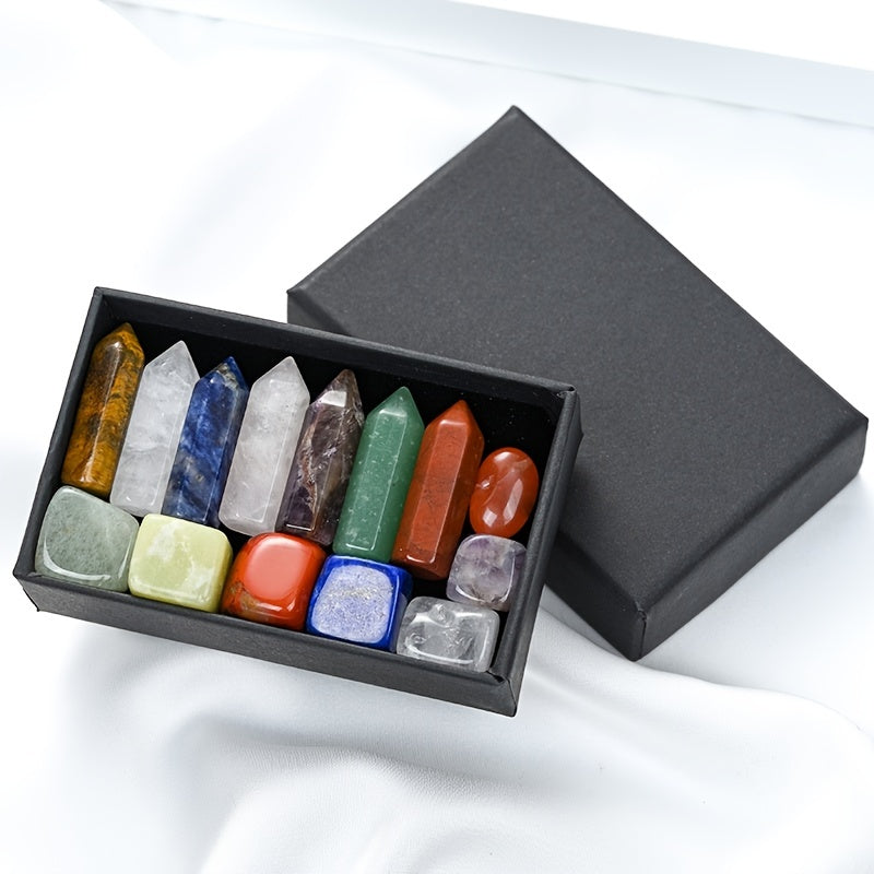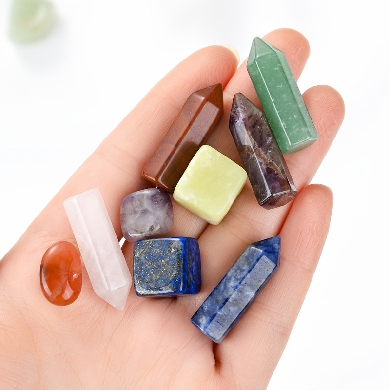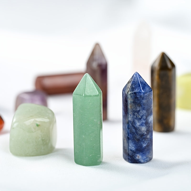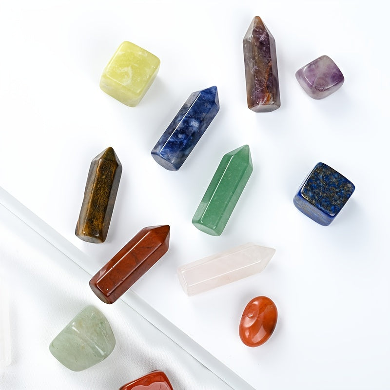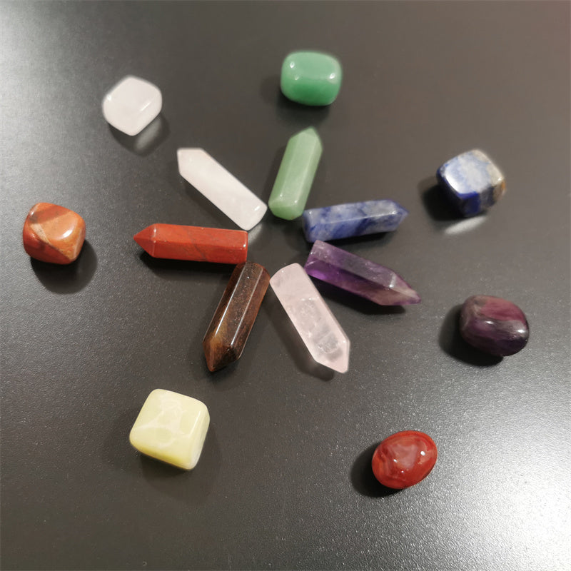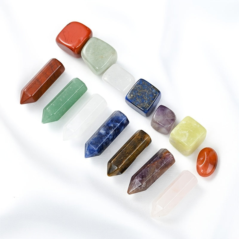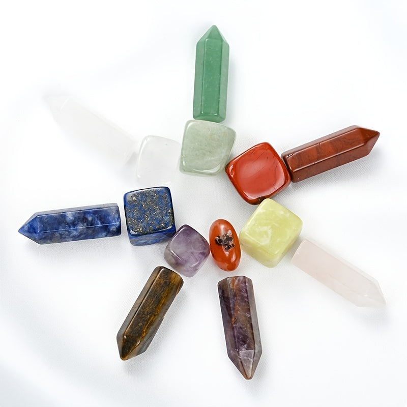This set includes 7 hexagonal crystal jade cylinders and 7 irregular natural stones, perfect for crystal healing and energy work.