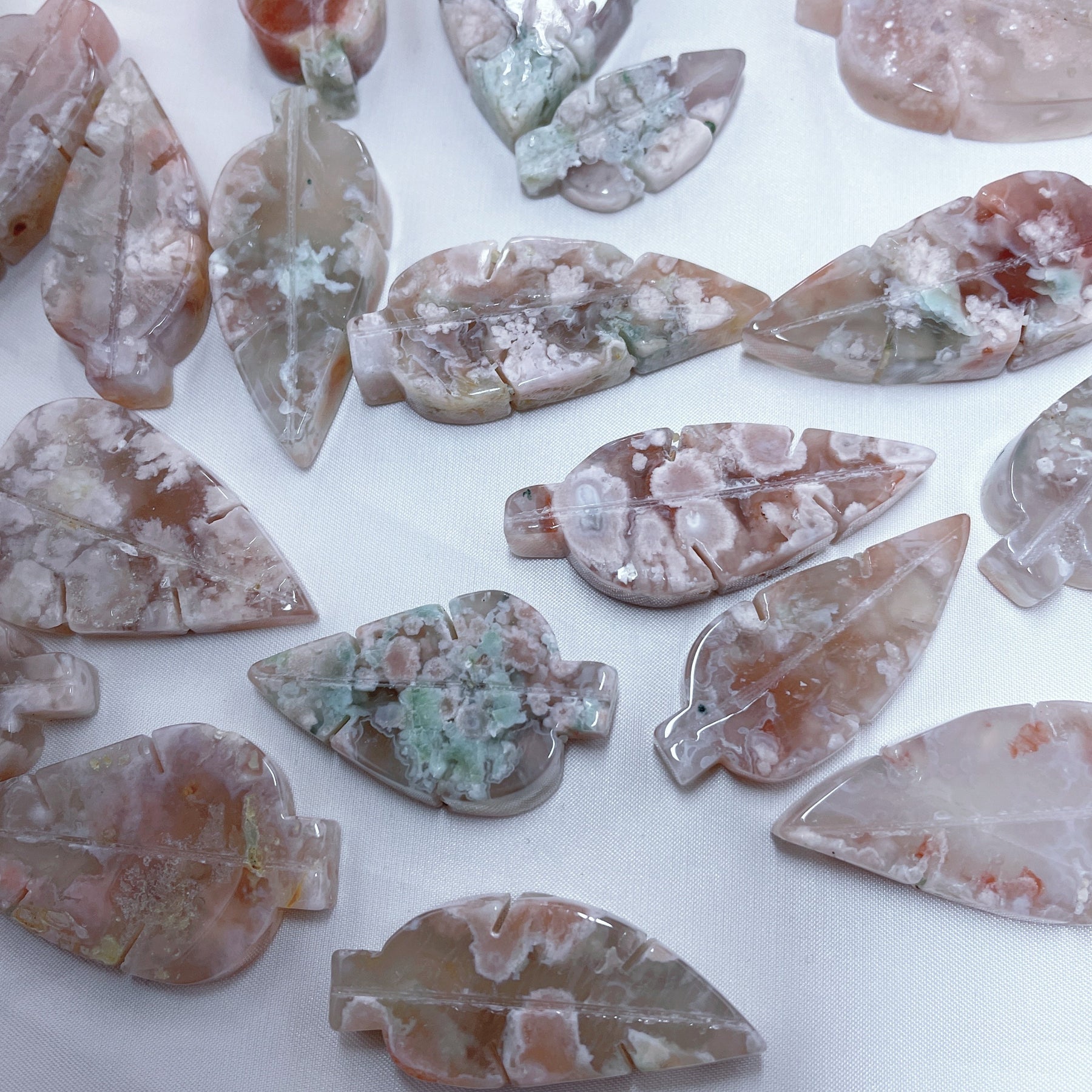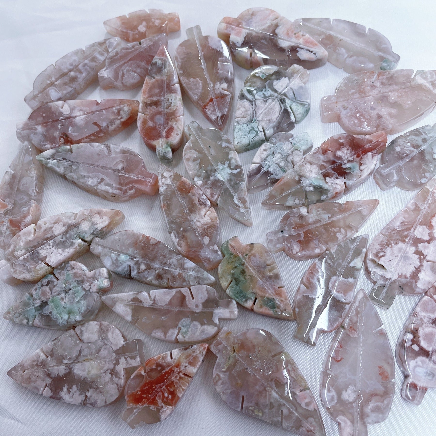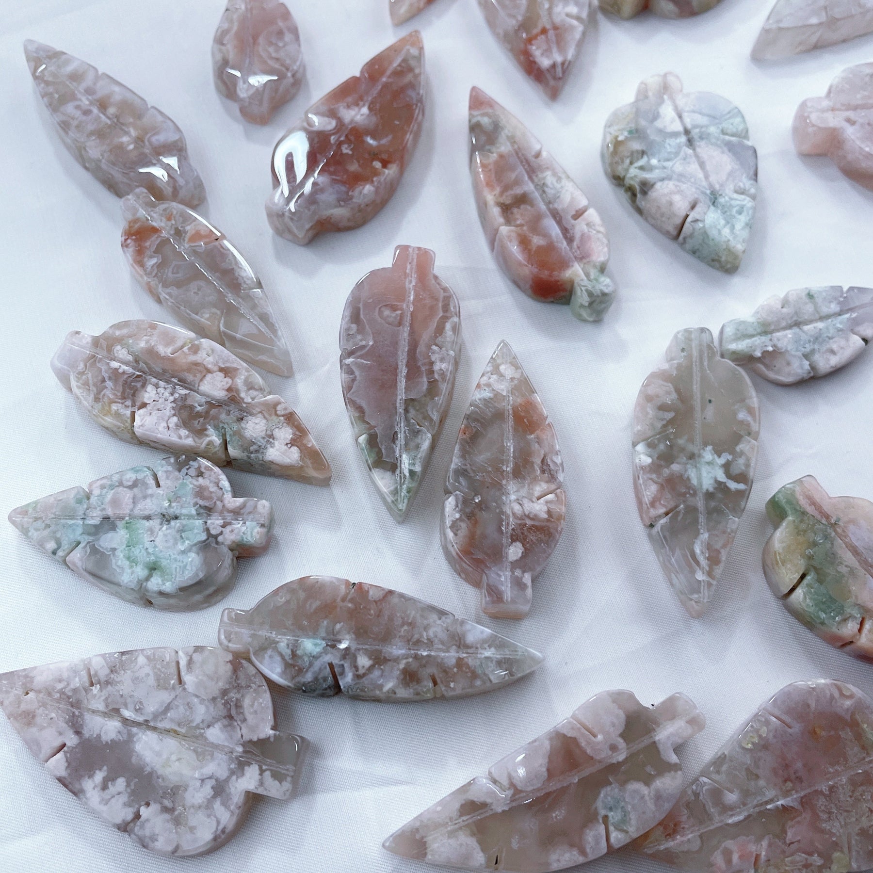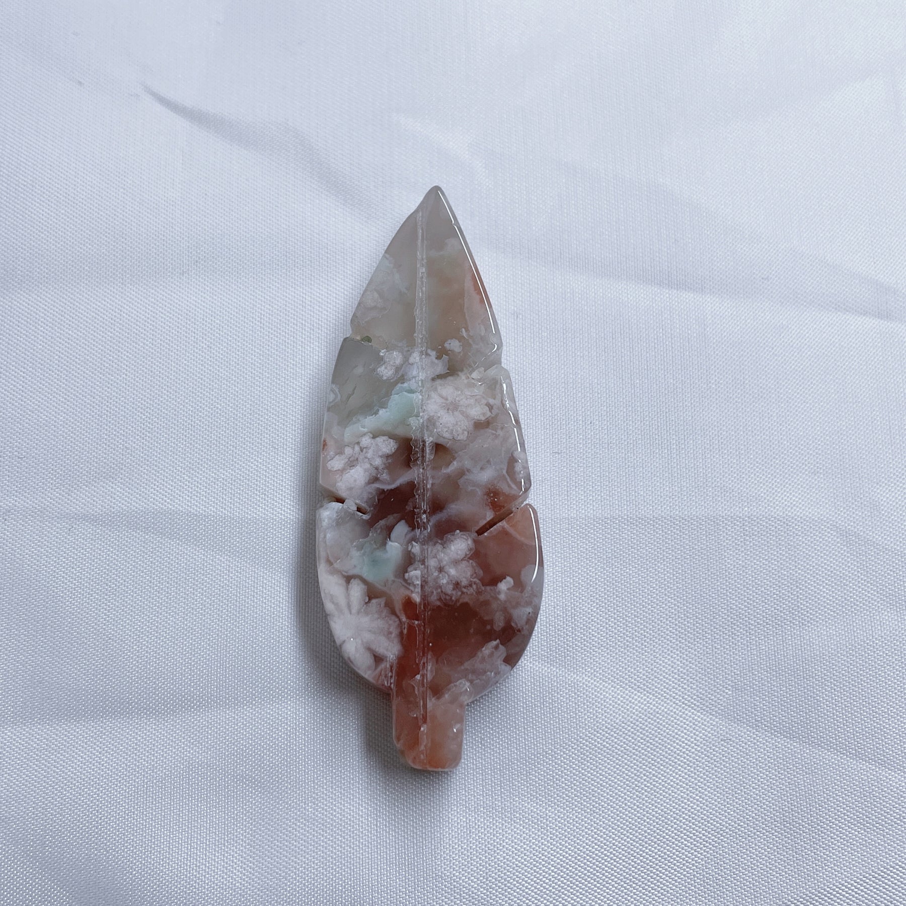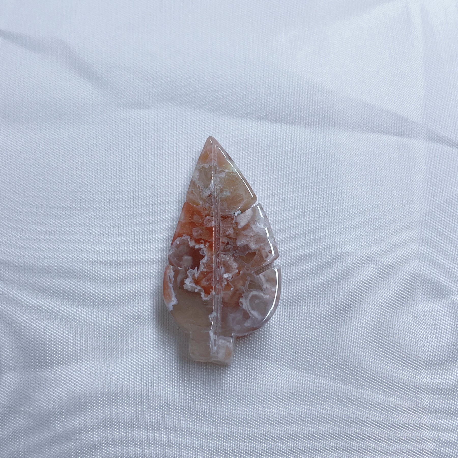 This beautiful Flower Agate Carved Leaves Agate is hand carved to bring positive energy into your home. Perfect for reiki healing and crystal energy in any room.
