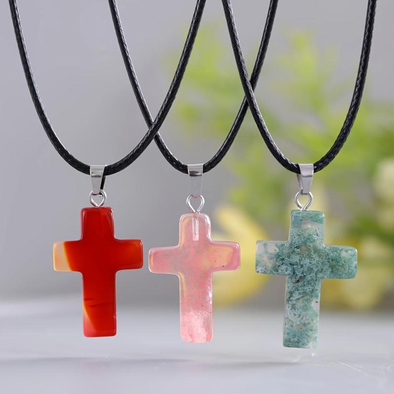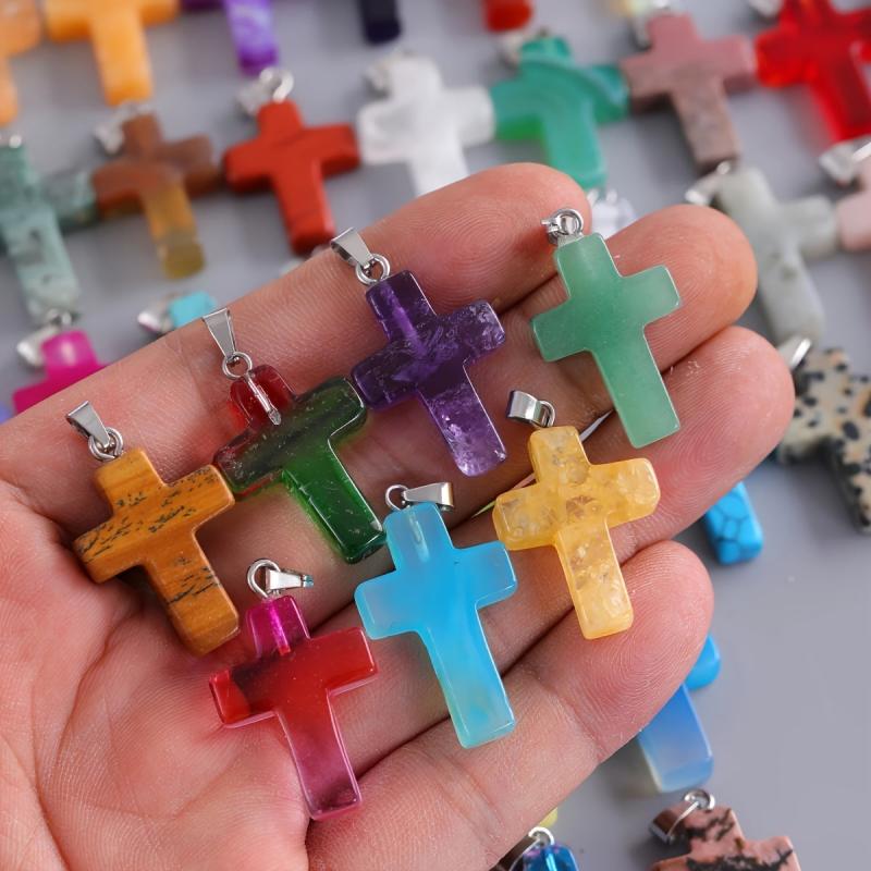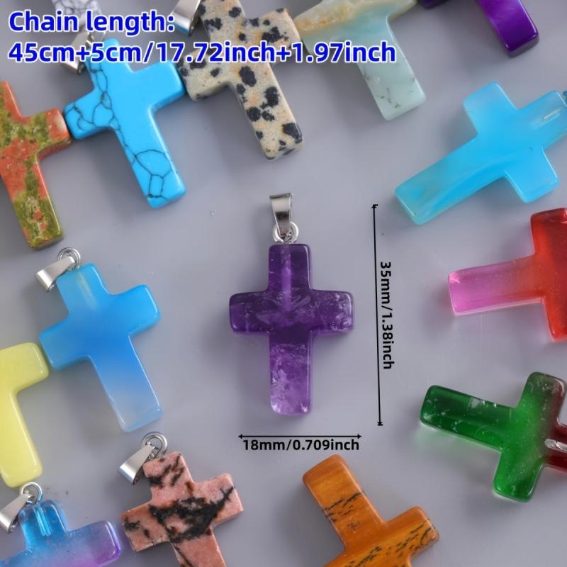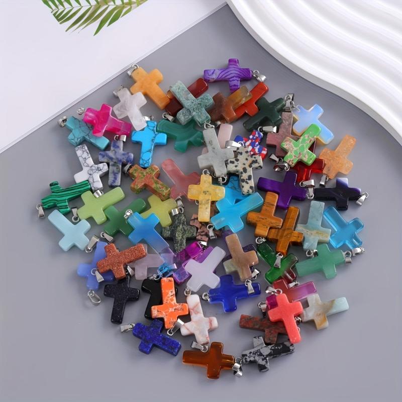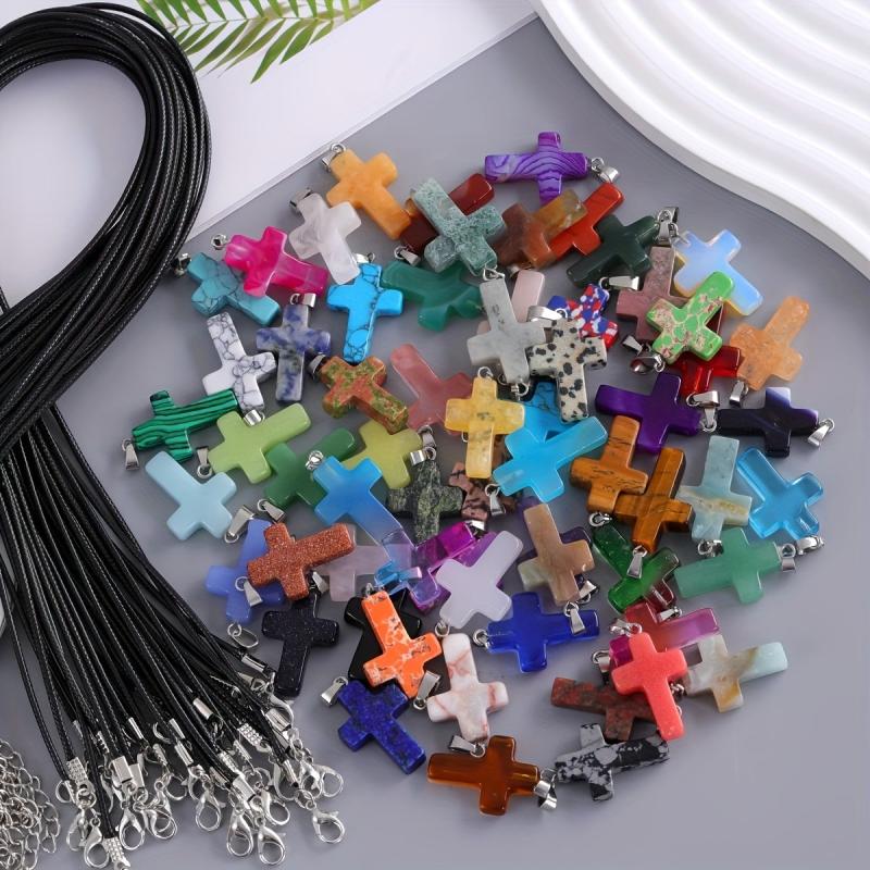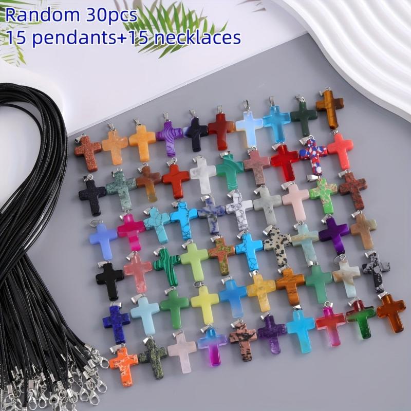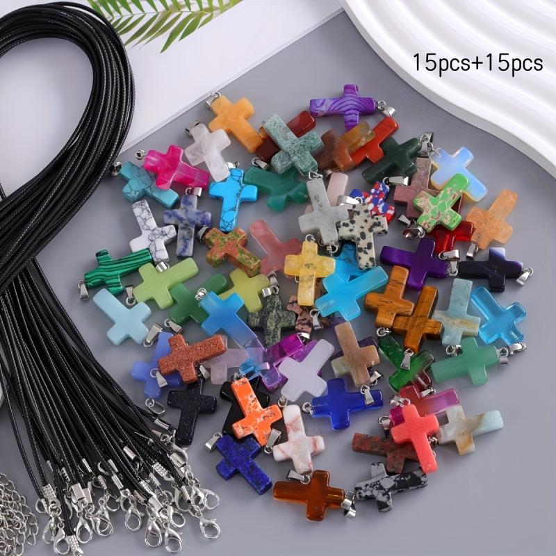 Create your own unique jewelry with this set of 30 mixed natural and synthetic stone cross pendants. The kit includes a variety of quartz, synthetic, and artificial gemstones, along with cords for making necklaces and bracelets.