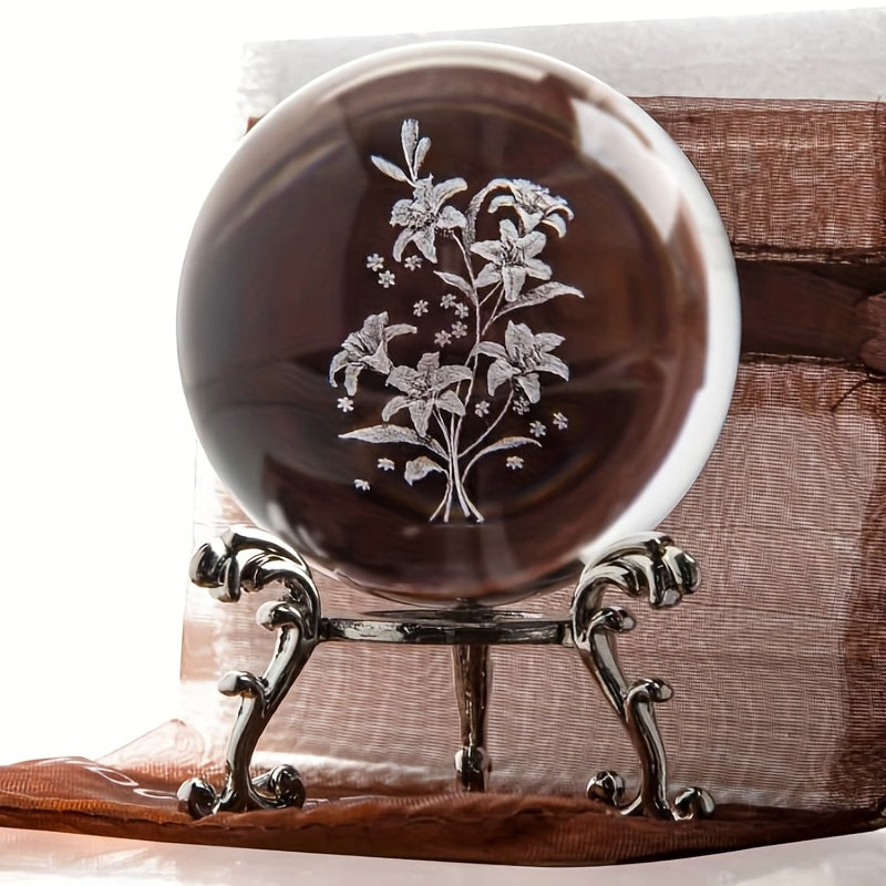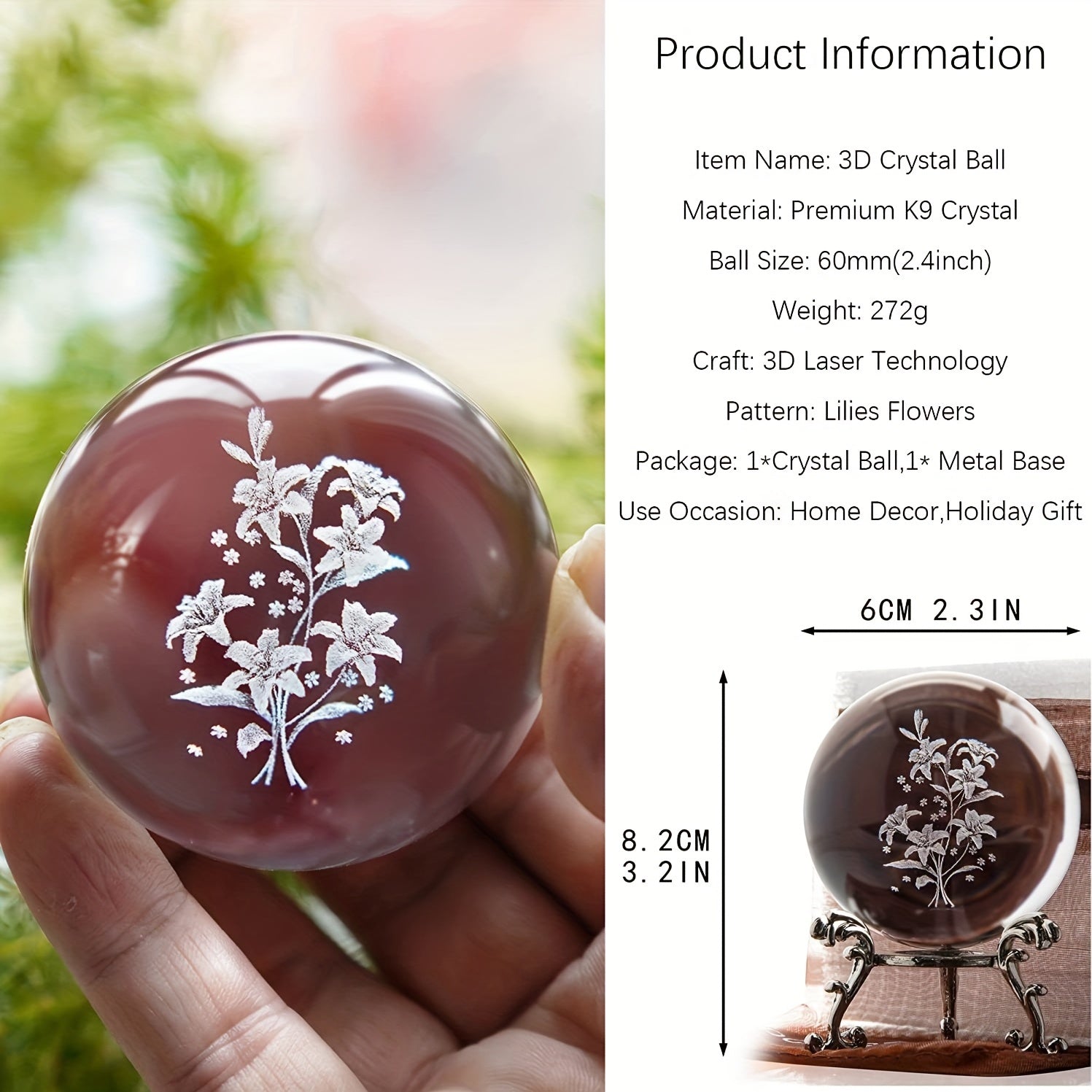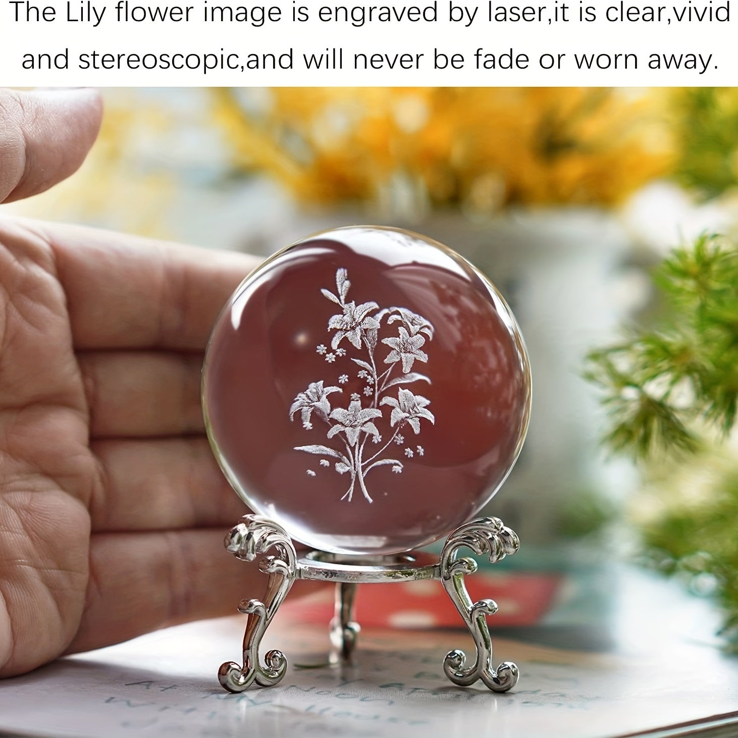 Add an elegant touch to your decor with this crystal ball featuring a 3D Lily Flower carving. Perfect for home or office decoration.