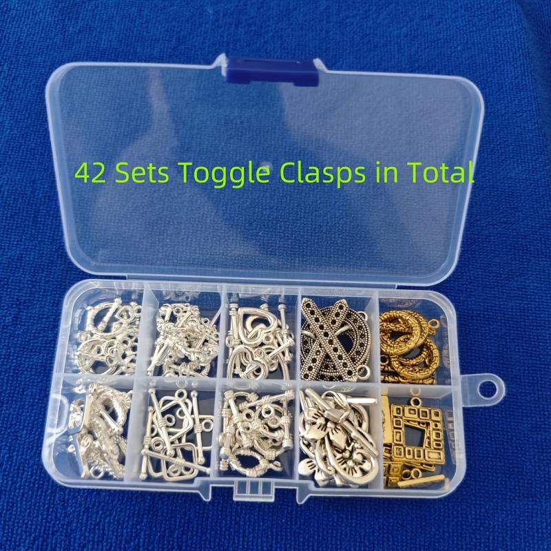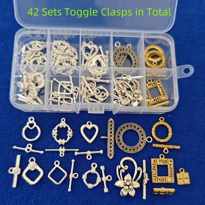 Get this set of 42 mixed colors of heart, square, and flower toggle clasps in a convenient storage box. Perfect for all your jewelry making needs.