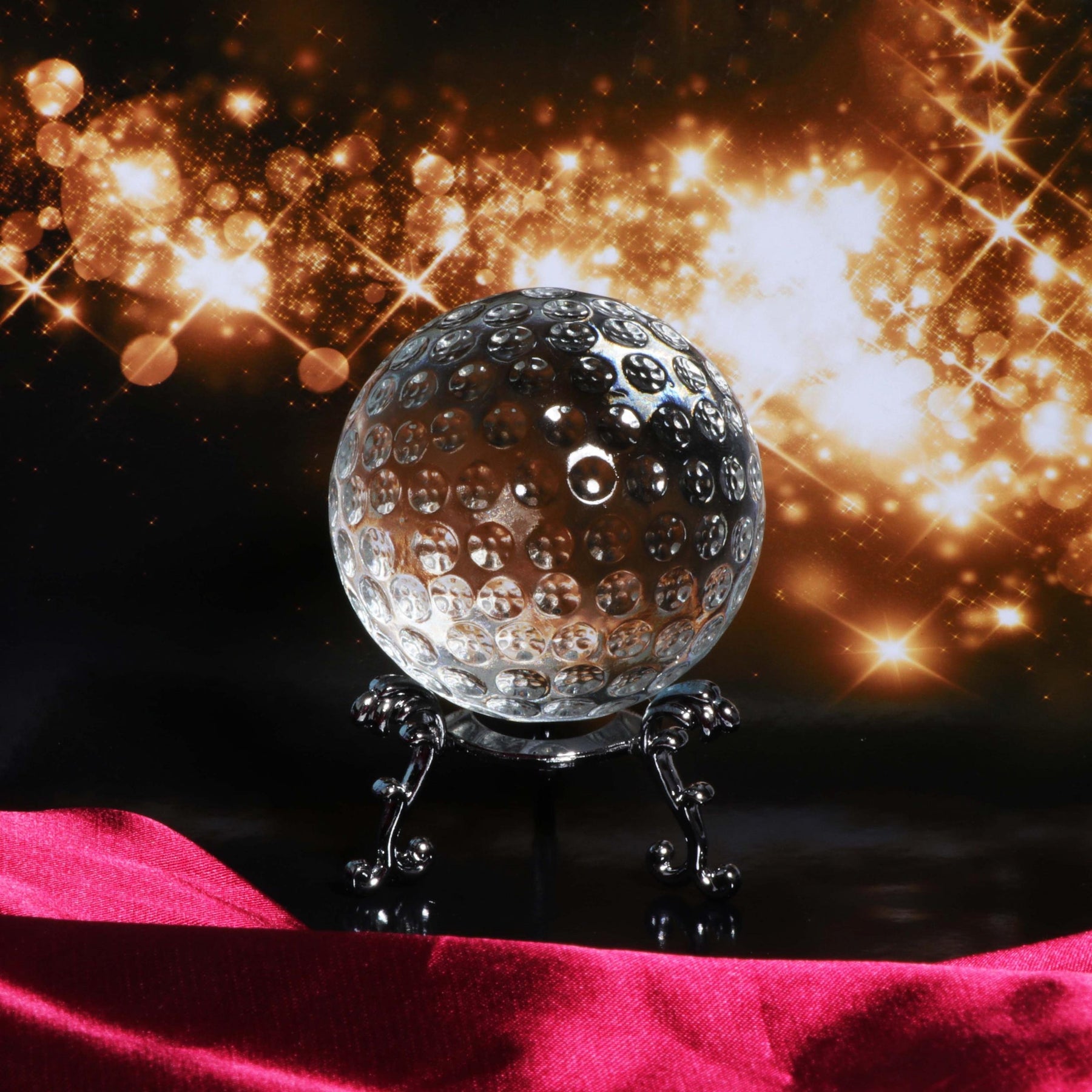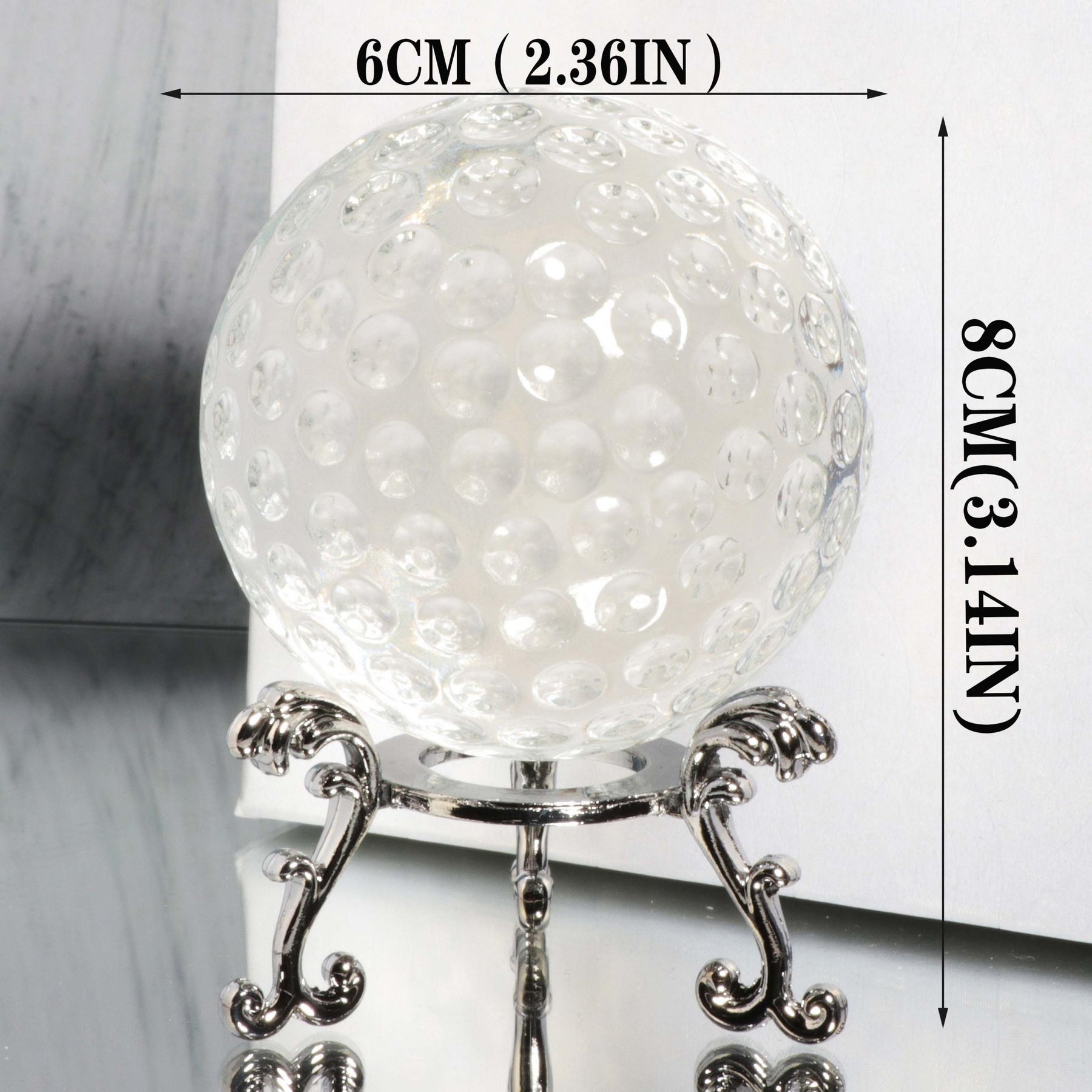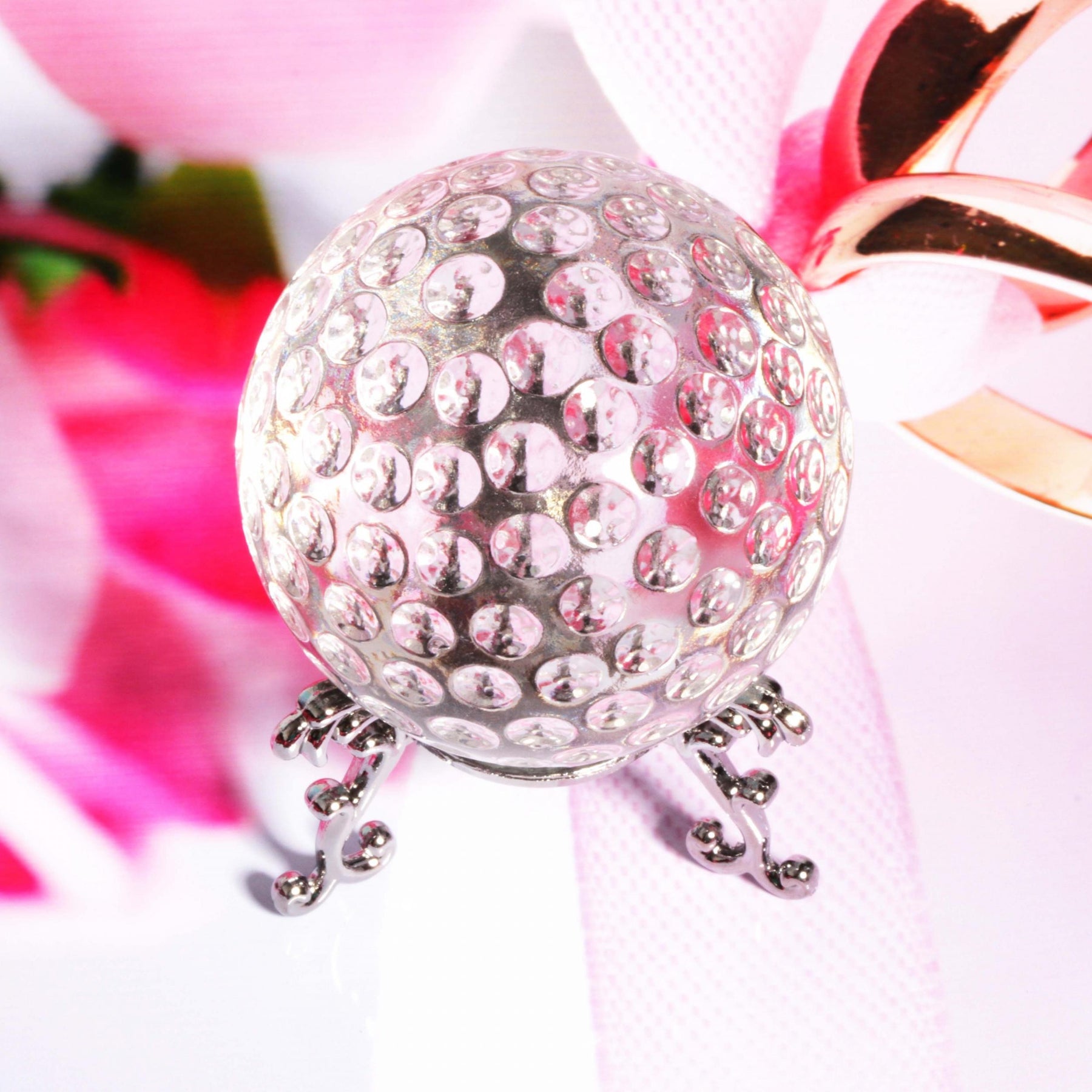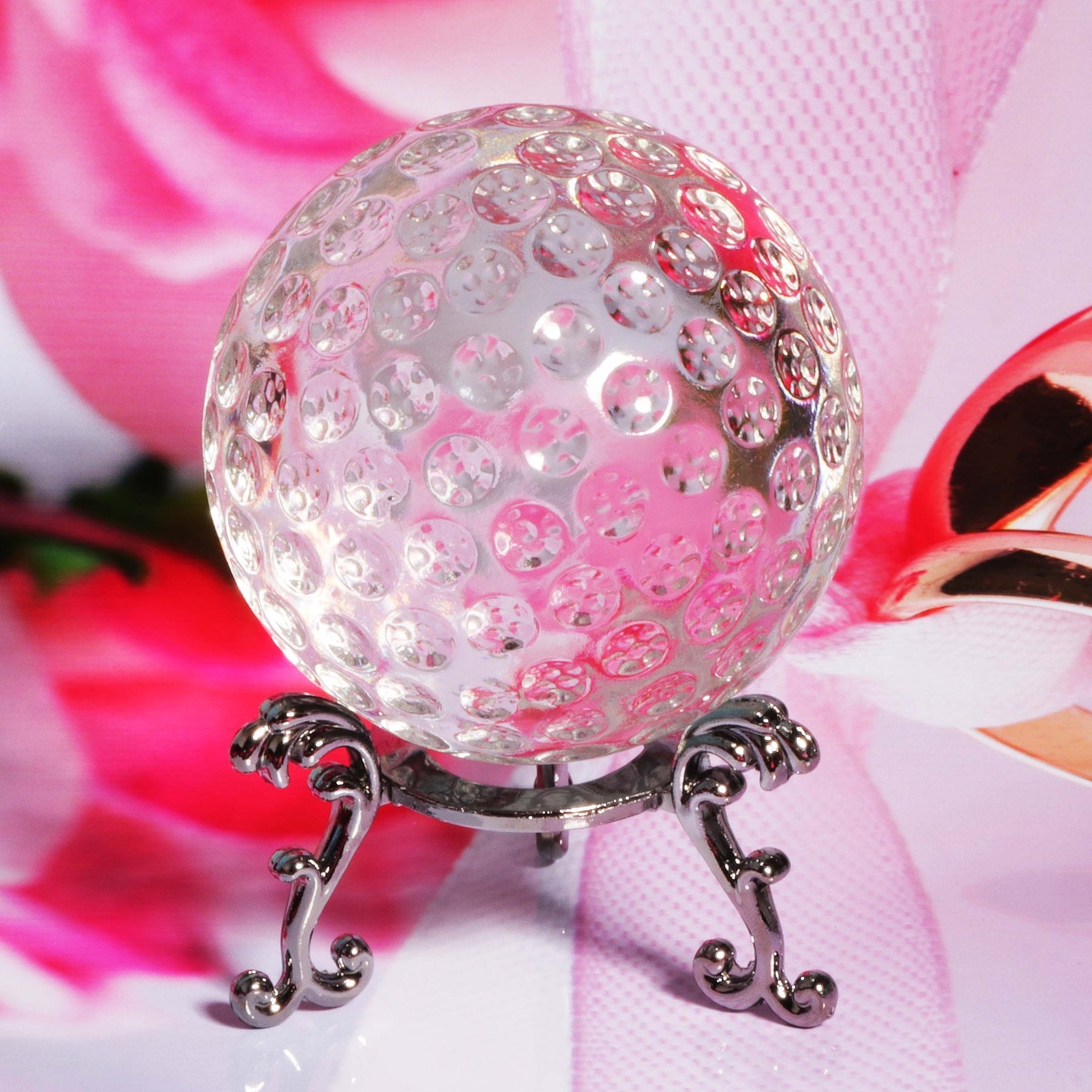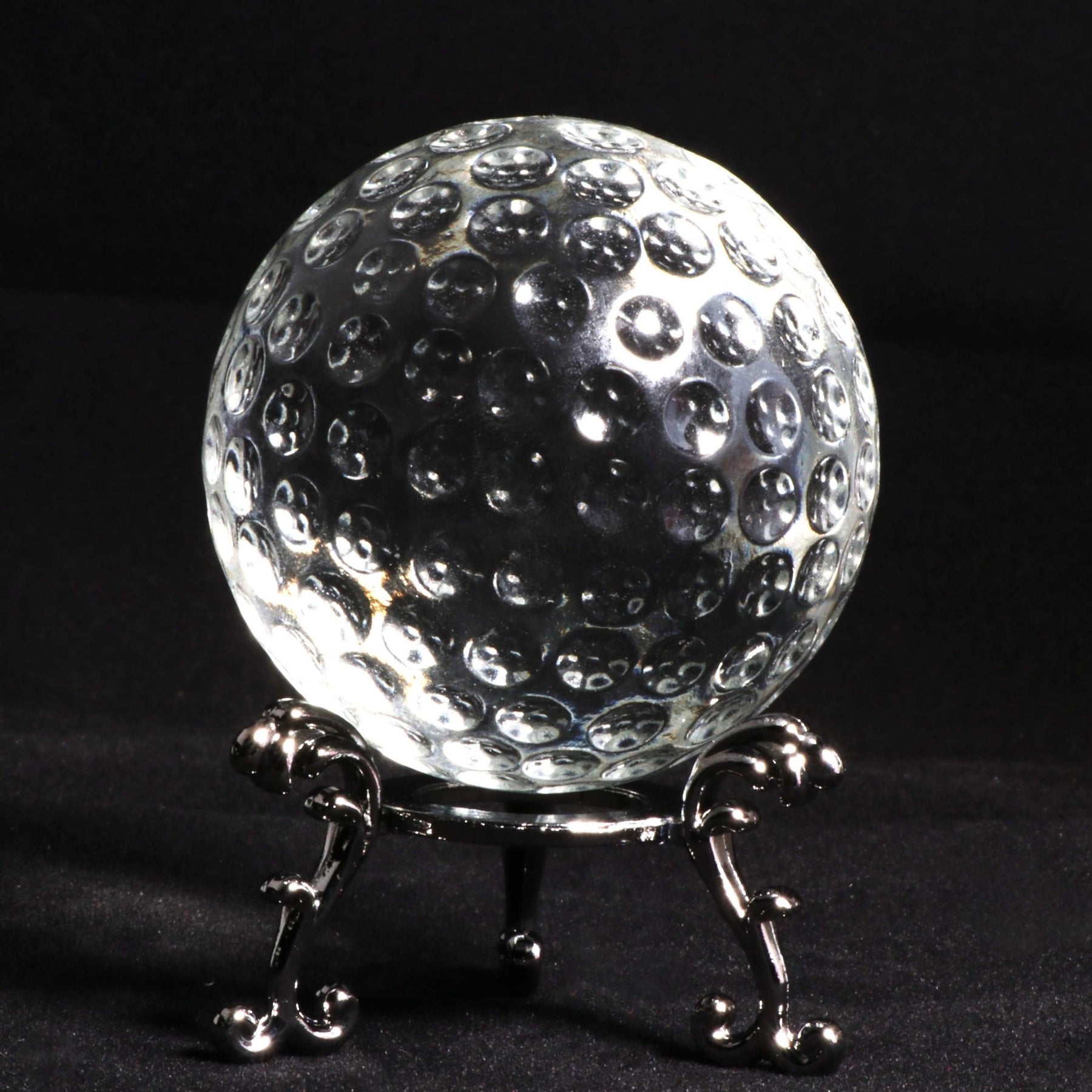 Add a touch of elegance with this crystal golf ball paperweight. The clear glass sphere comes with a stand to display it perfectly. Ideal for home decor, fengshui practices, or as a rockery ornament.