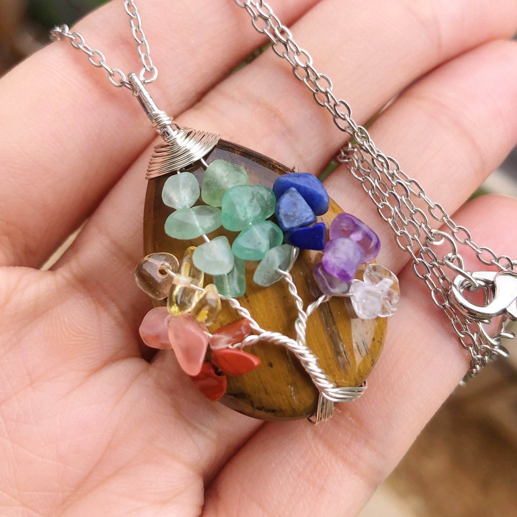 This beautiful necklace features a Tree of Life design with 7 chakra agate gemstones in a water drop shape. It is a powerful chakra healing amulet that brings balance and positive energy.