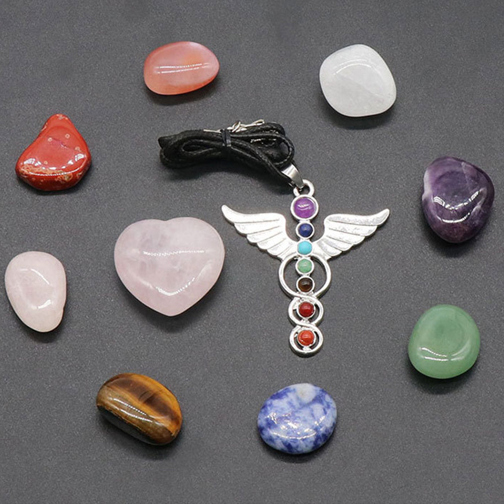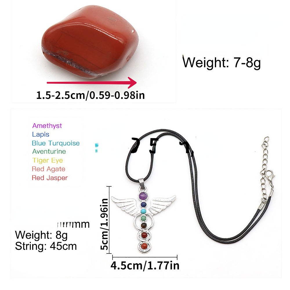 Experience the healing energy of the 7 chakras with this angel wing pendant set featuring heart-shaped rose quartz stones. The perfect gift for yourself or a loved one.