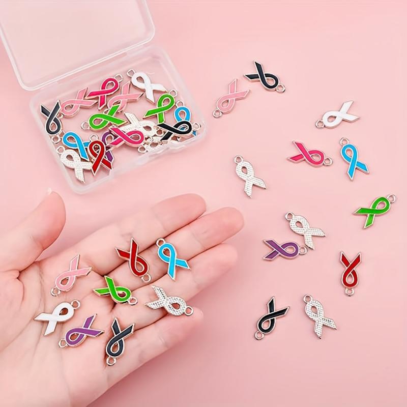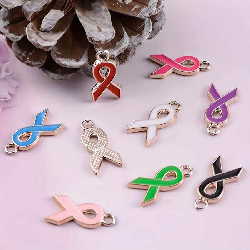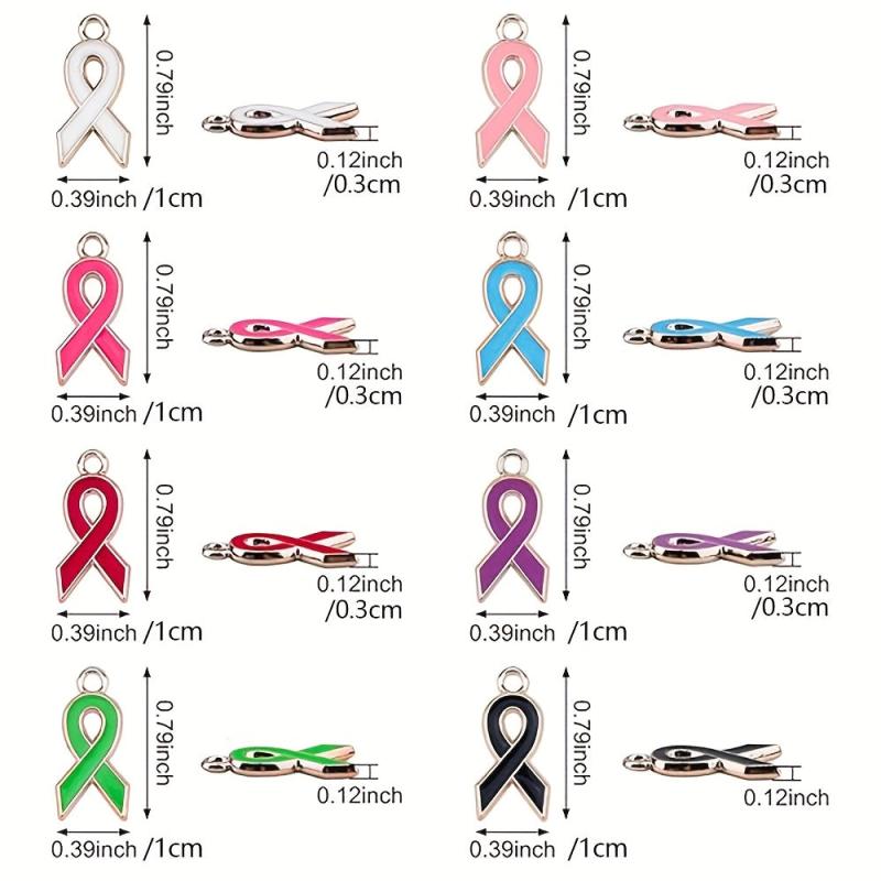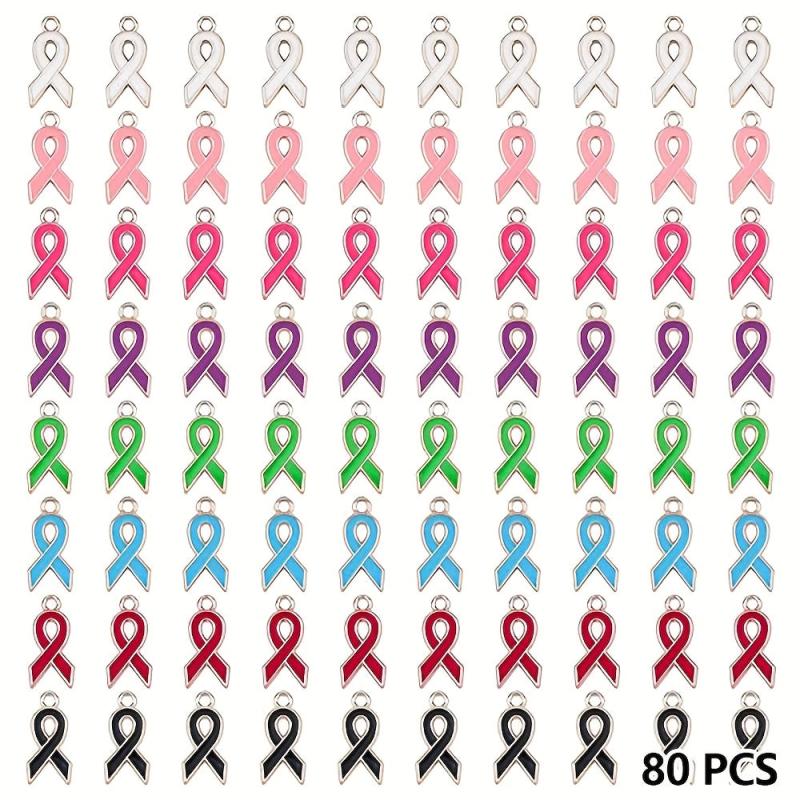 Get a set of 80 mixed ribbon charms in 8 different styles for your DIY jewelry making projects. These enamel awareness ribbon pendants come in pink, red, green, purple, and more.