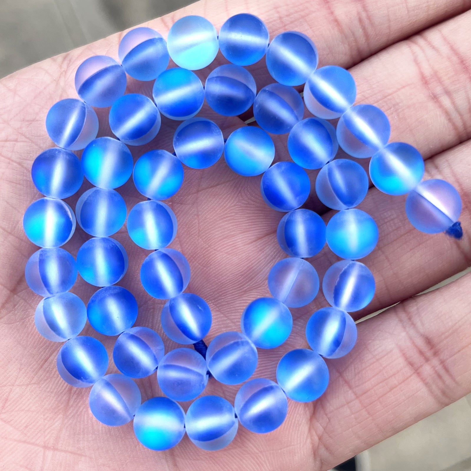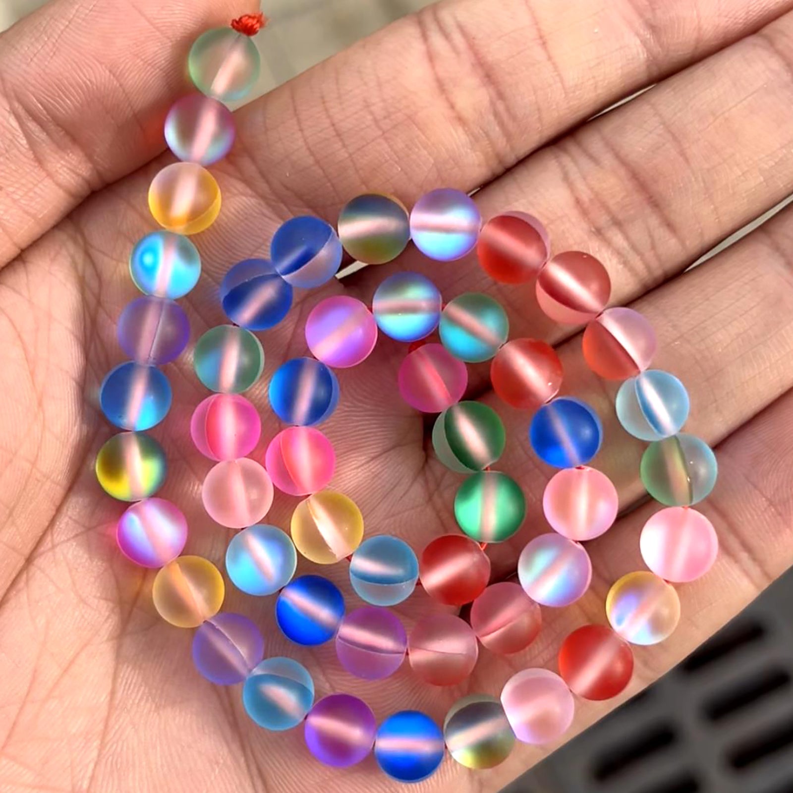 Create stunning jewelry with these 8mm frosted aurora crystal glass beads. The mixed glitter moonstone beads add a rainbow effect to your designs. Perfect for making bracelets, necklaces, and earrings.