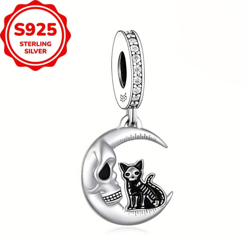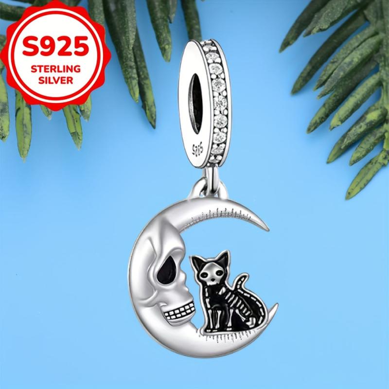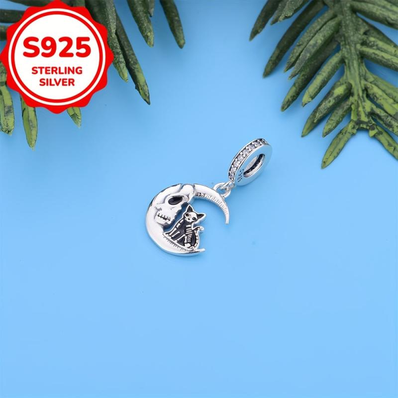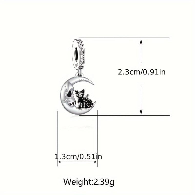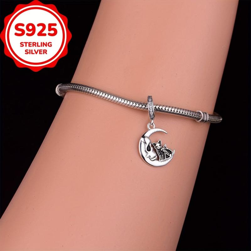 Elegant cat moon pendant made of 925 sterling silver with synthetic zircon, perfect for DIY jewelry making projects.