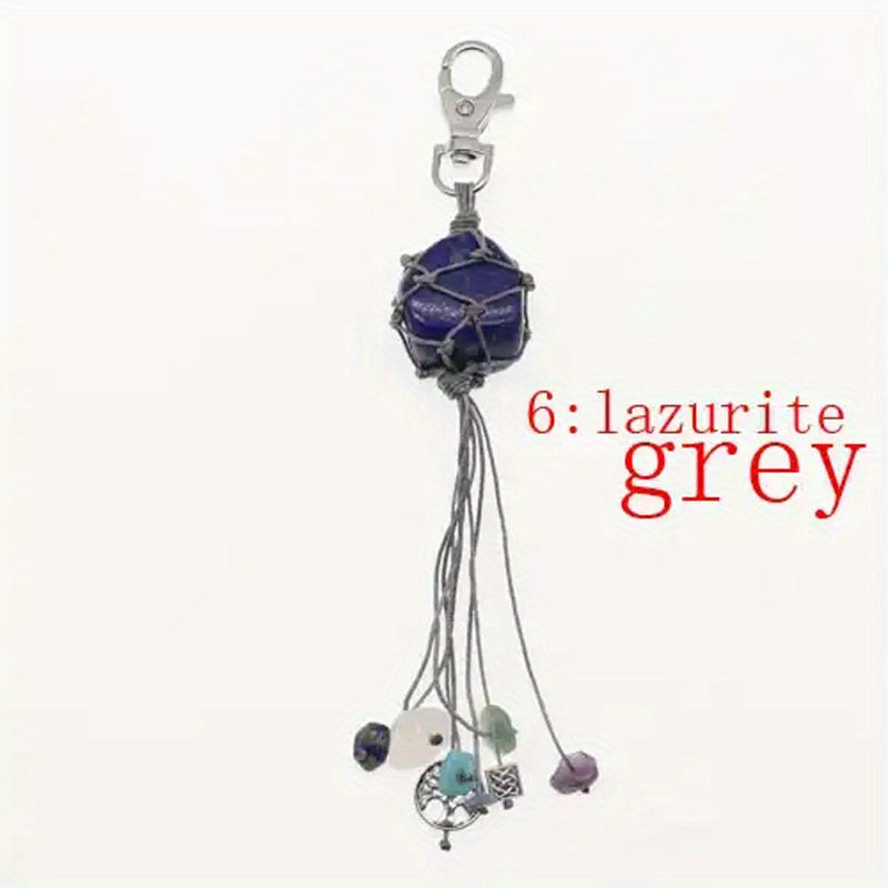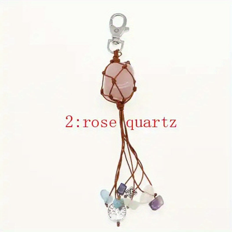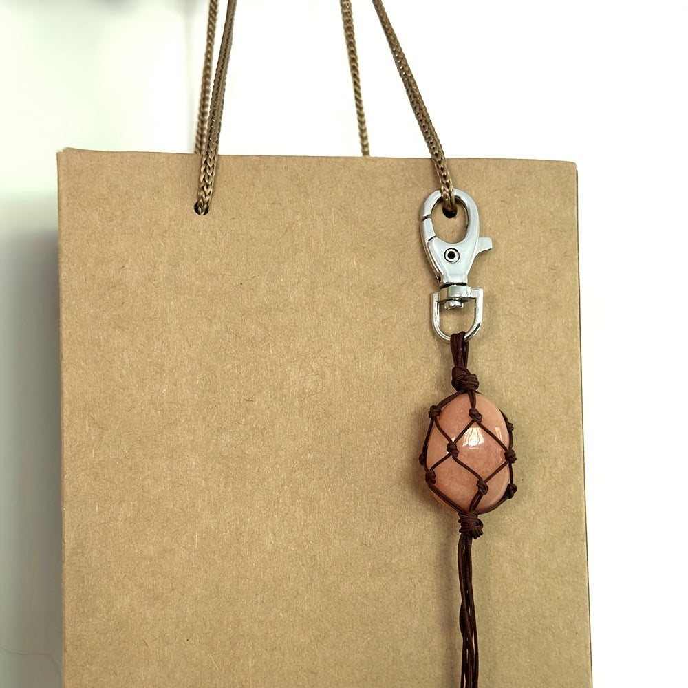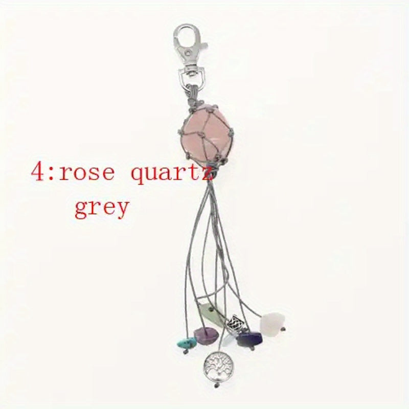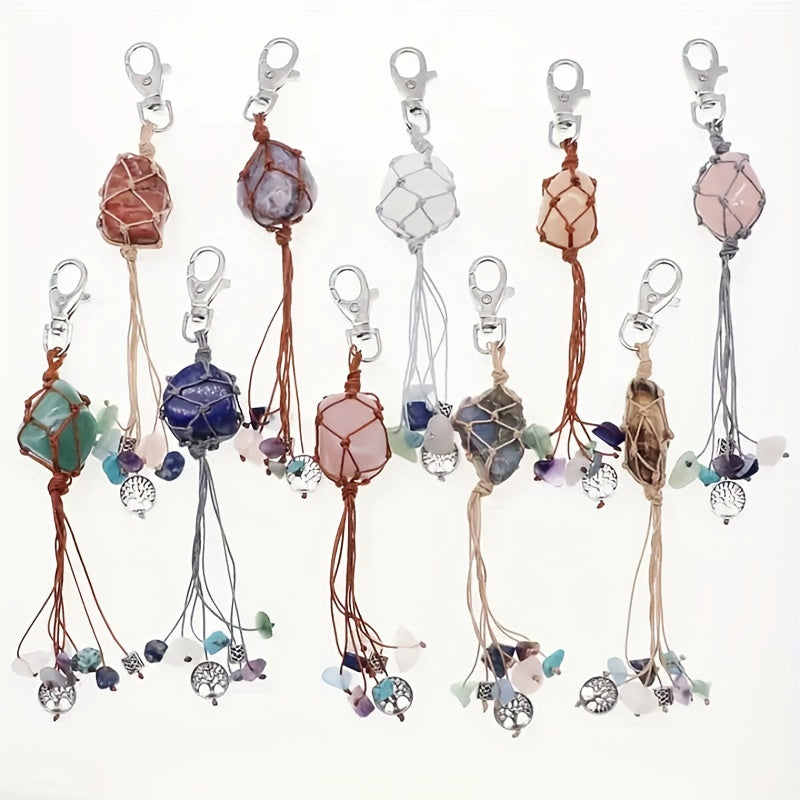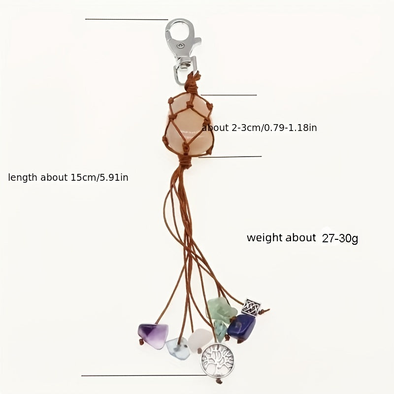 Add a touch of boho charm to your accessories with this macrame tumbled crystal healing gemstone keychain. Crafted with intricate details, this keychain is perfect for bag hanging or as an ornament.