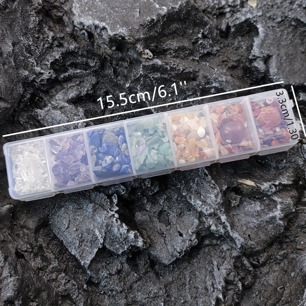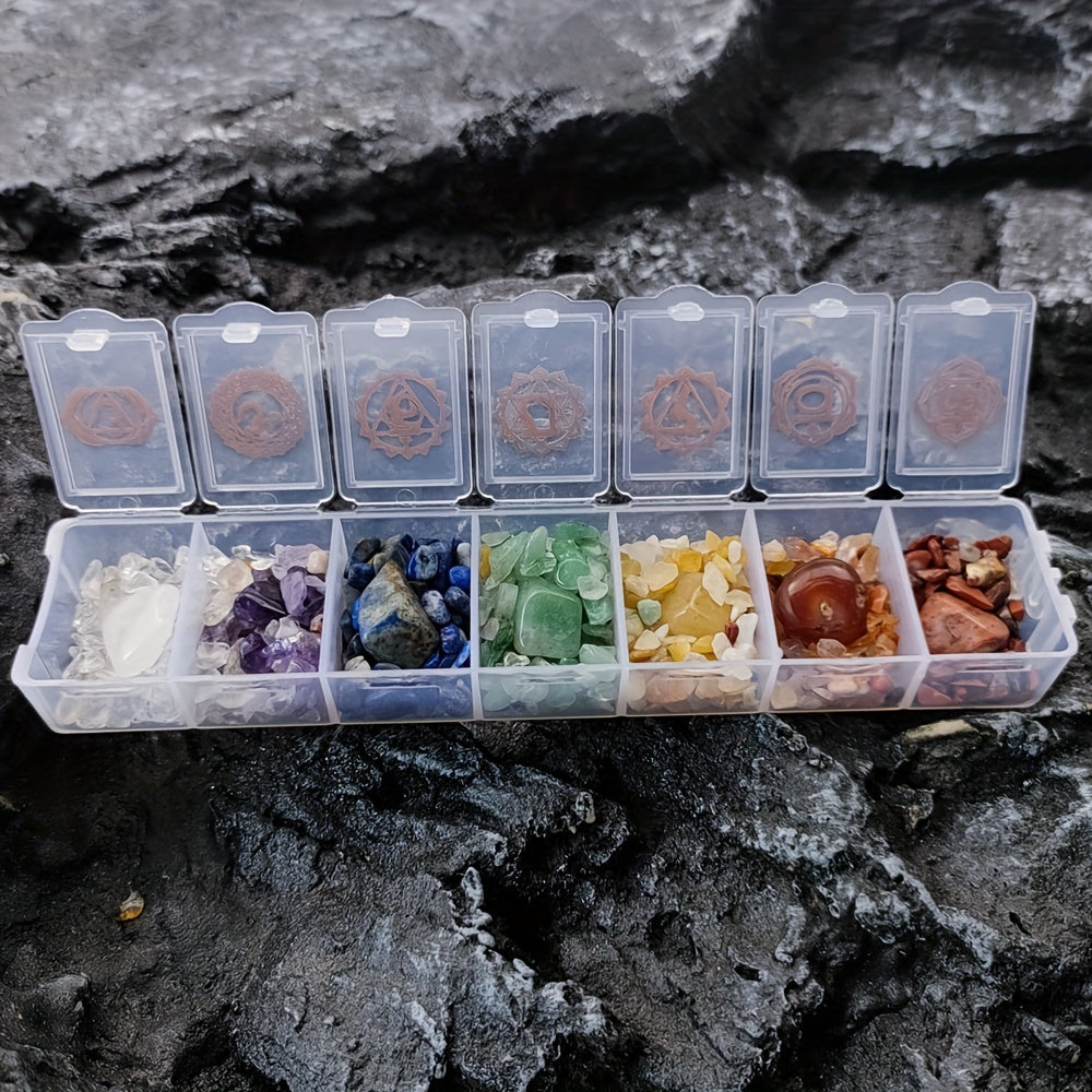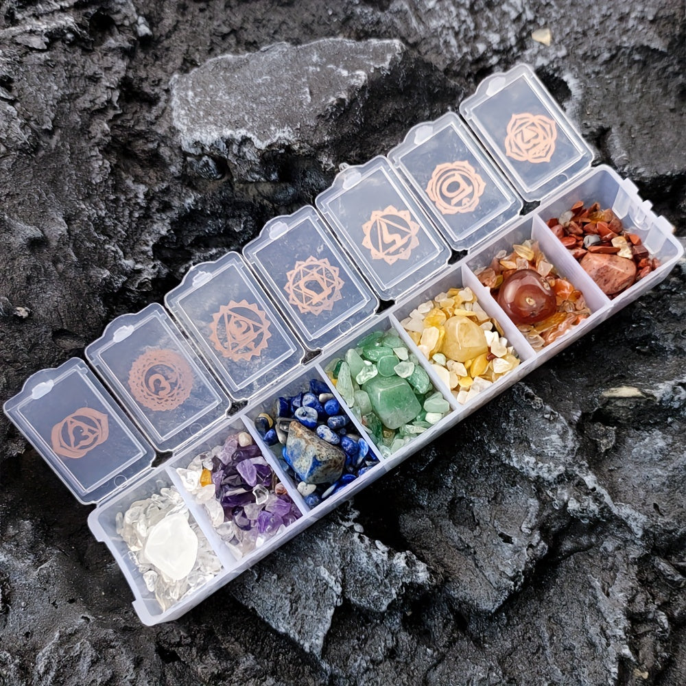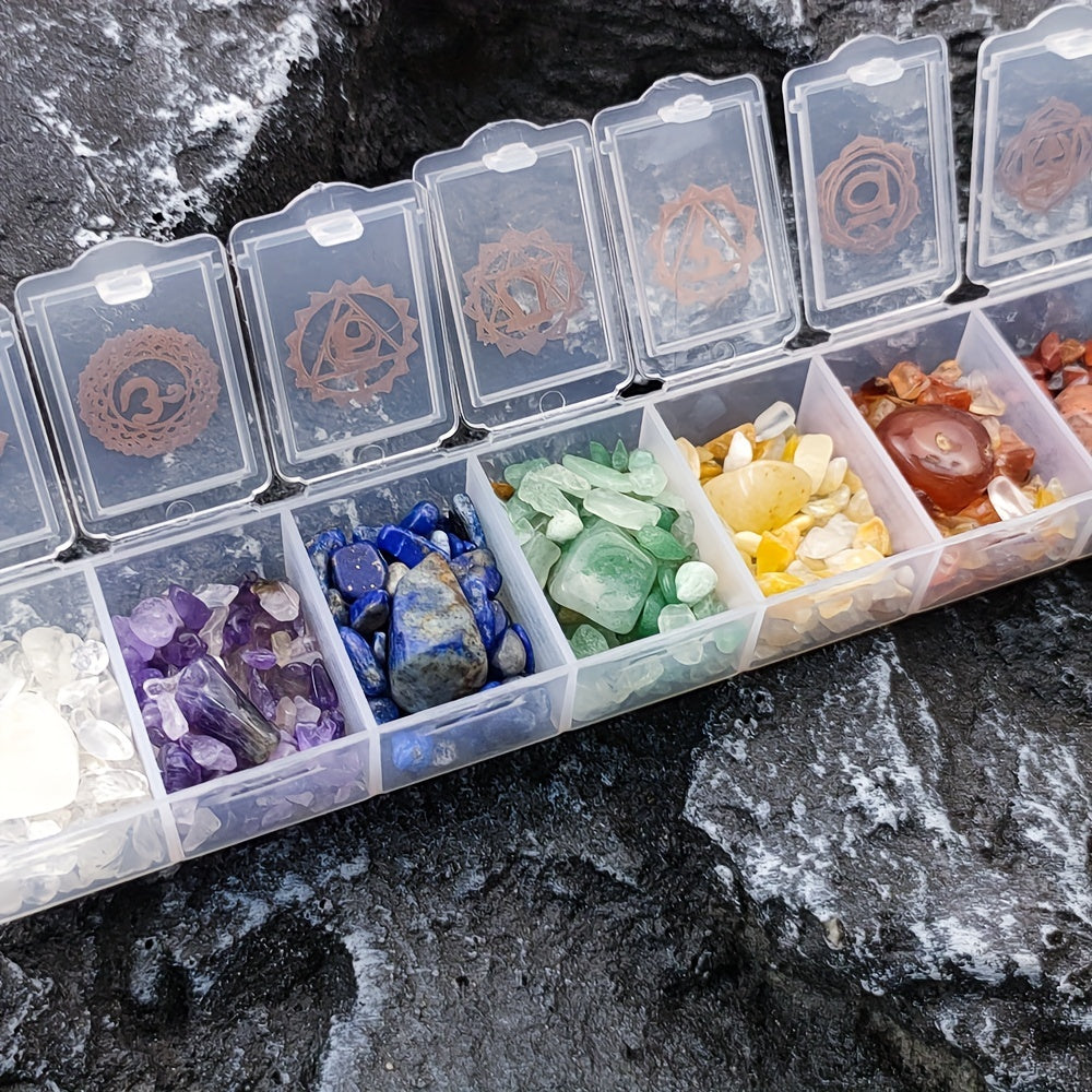 This chakra crystal set includes natural healing stones in a box for chakra therapy. Each crystal corresponds to one of the seven chakras, promoting spiritual balance and well-being.