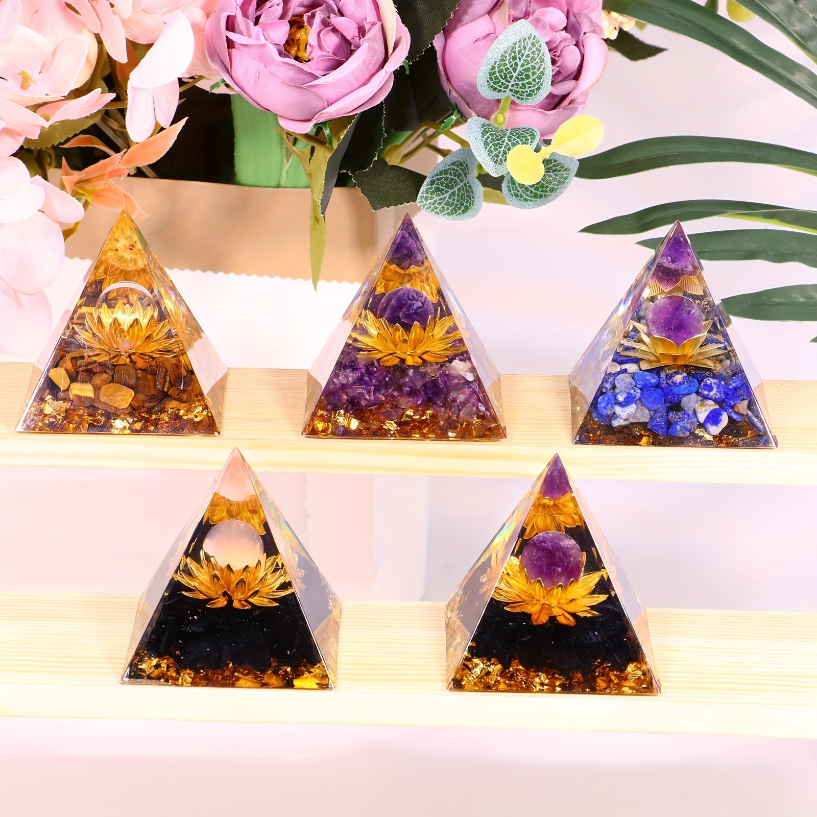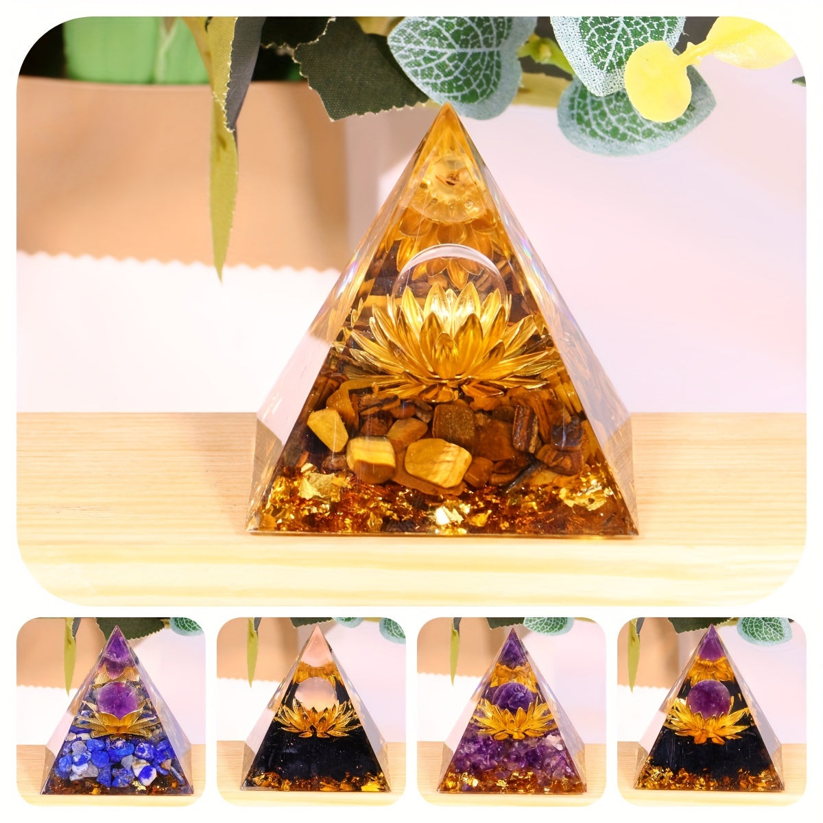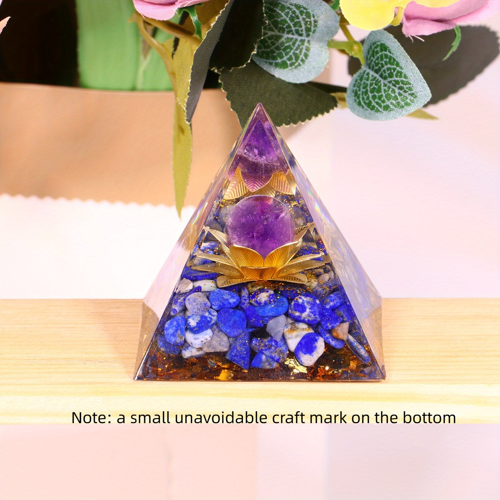 Enhance your space with this stunning orgonite pyramid featuring a mix of crystal stones. Perfect for work, home decor, birthday gift, and meditation. Crafted with resin for a unique touch.