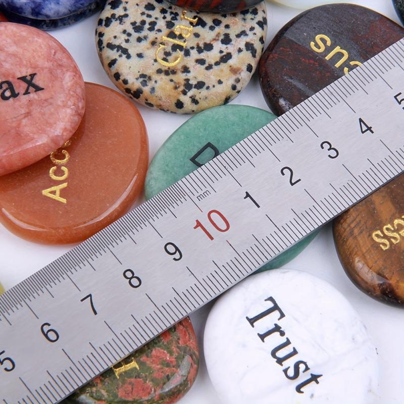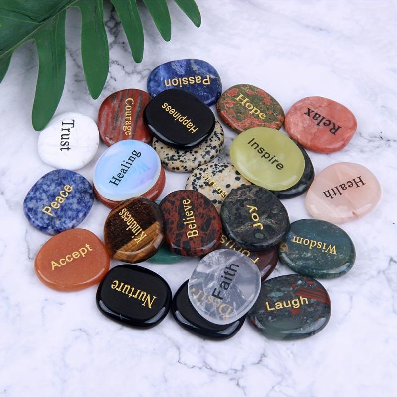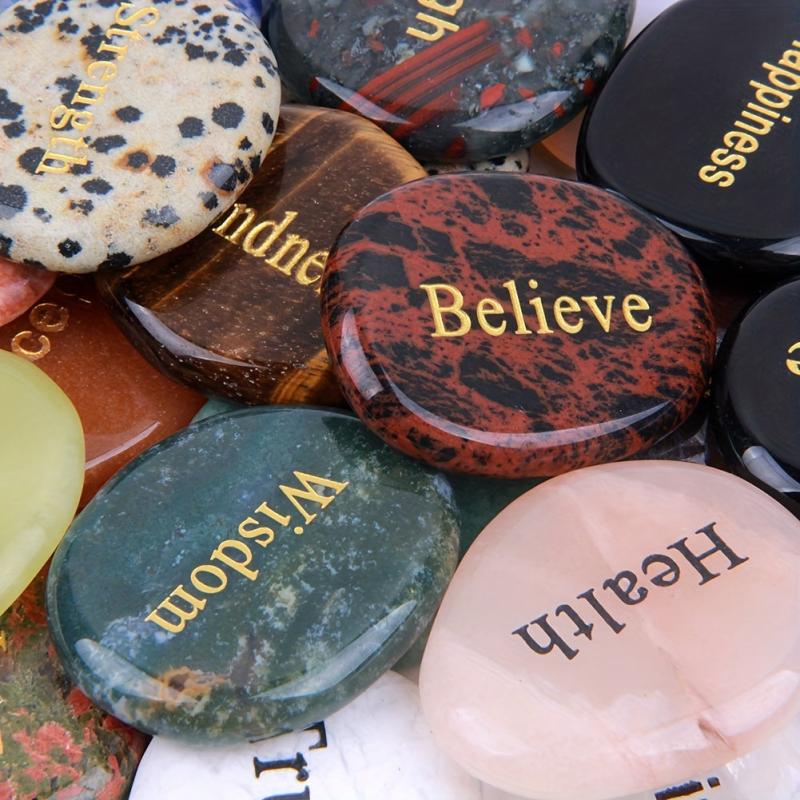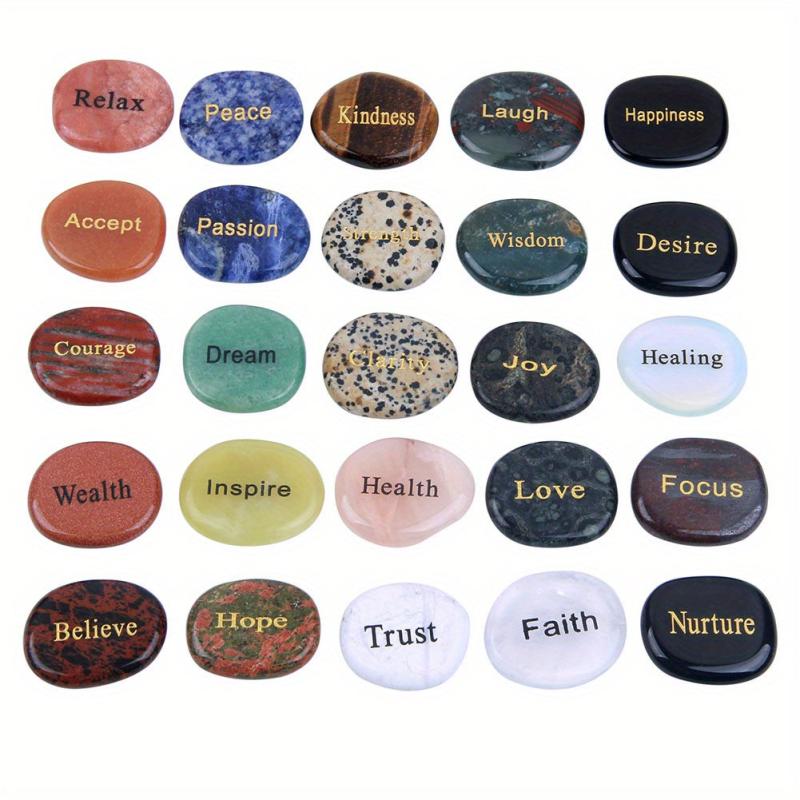 This set includes 25 natural mixed stones with different English words of inspiration engraved on them. Perfect for carrying in your pocket or placing around the home for a daily dose of motivation.
