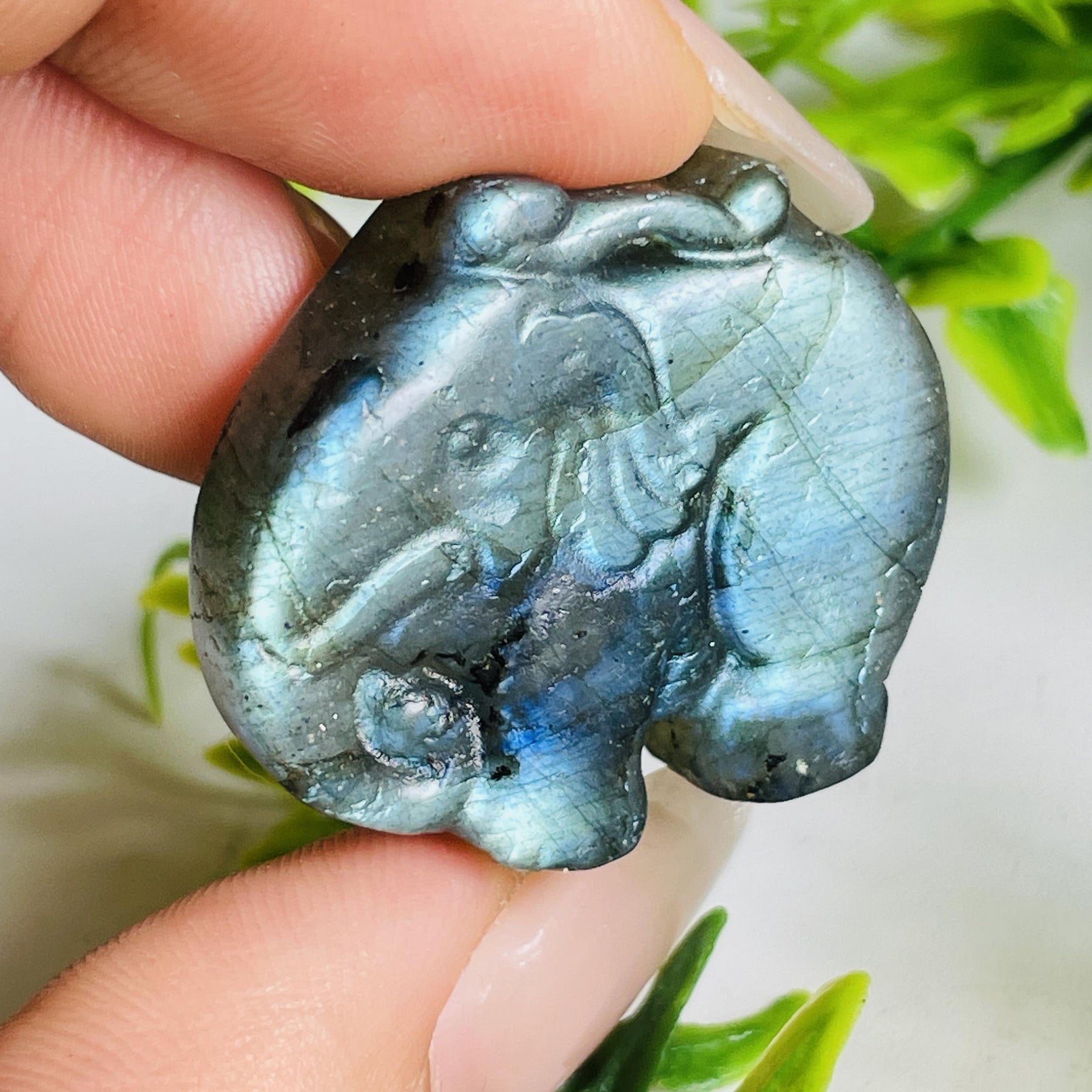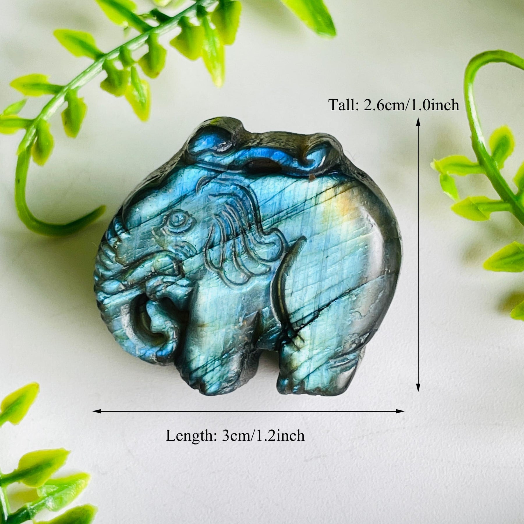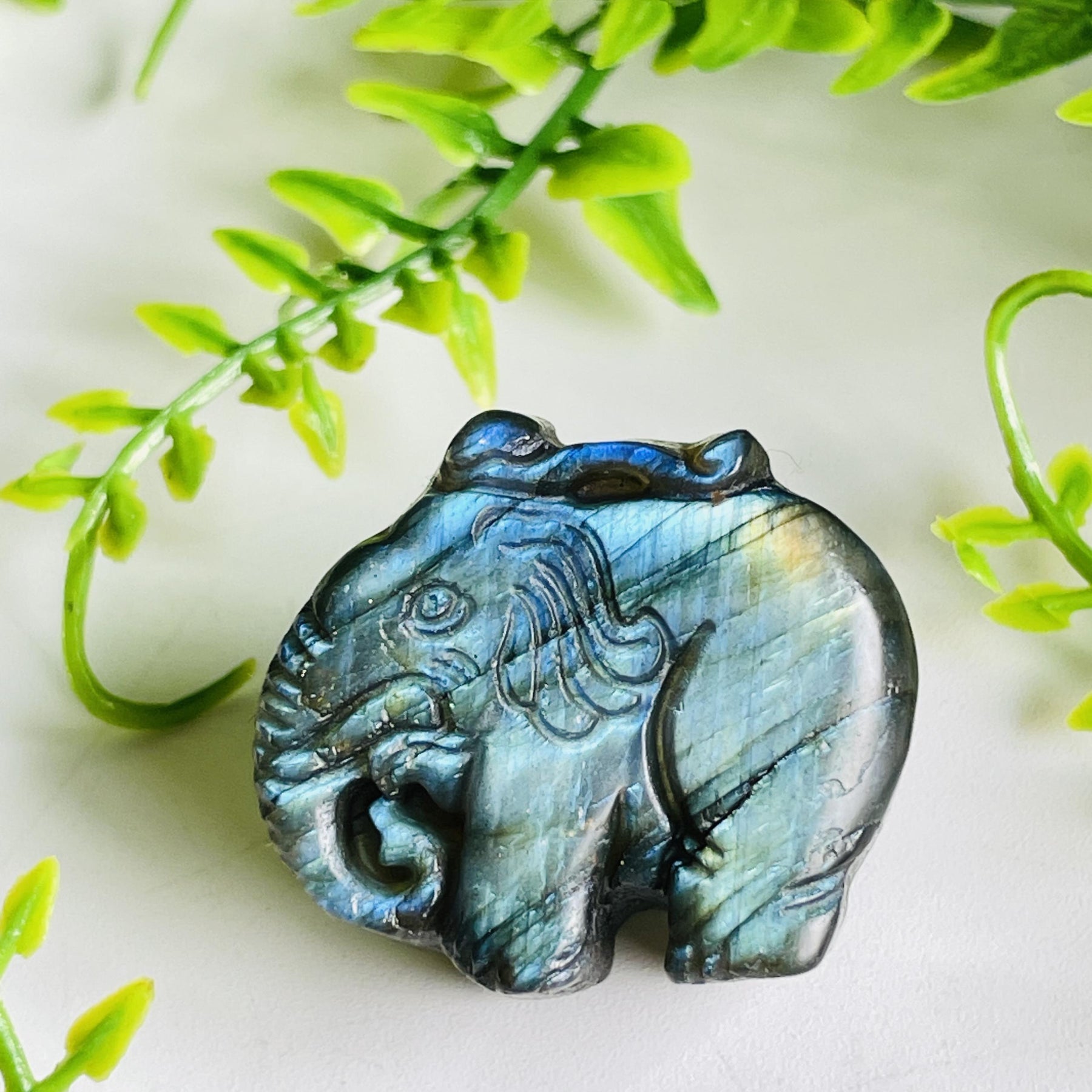Enhance your space with this exquisite Labradorite elephant carving. The flash of colors in this natural stone makes it a unique and eye-catching decoration.