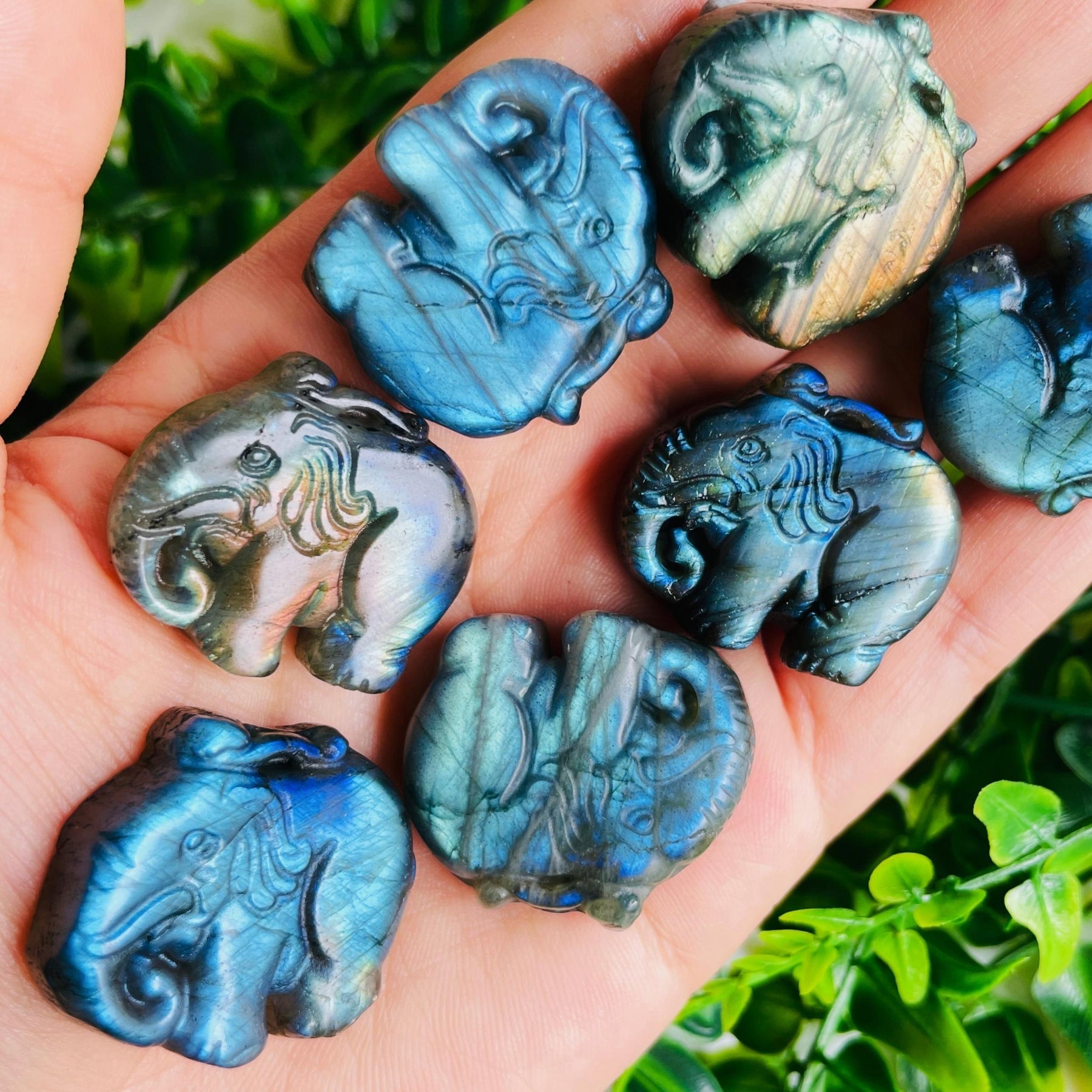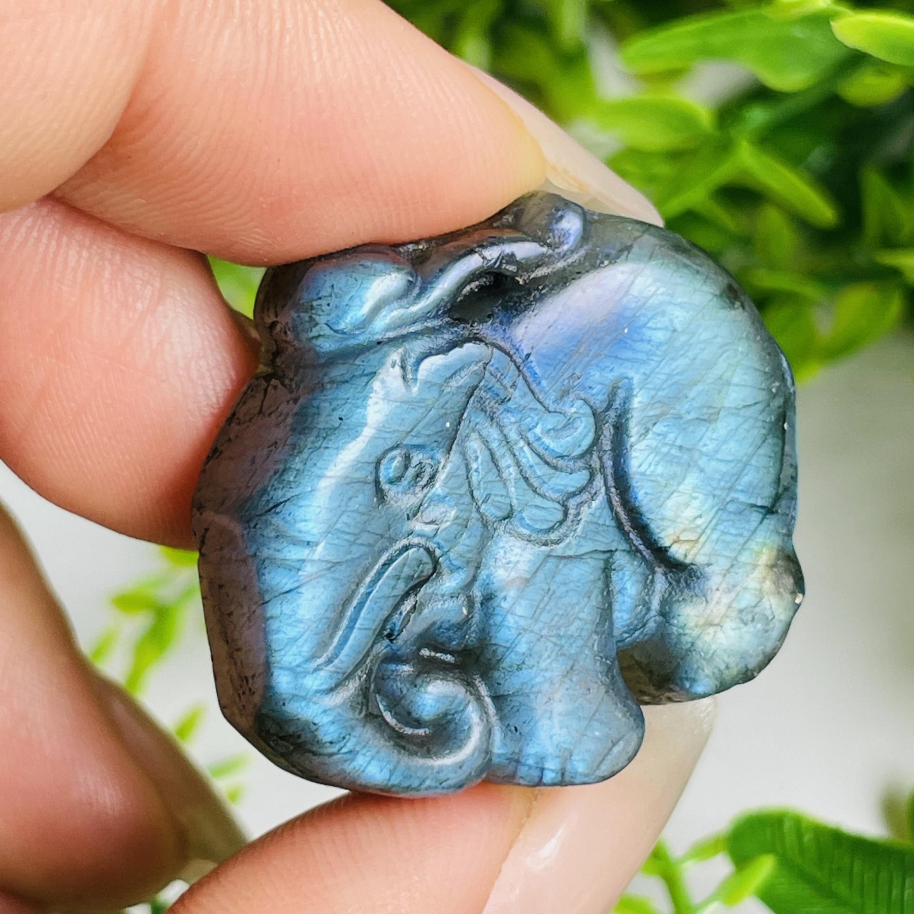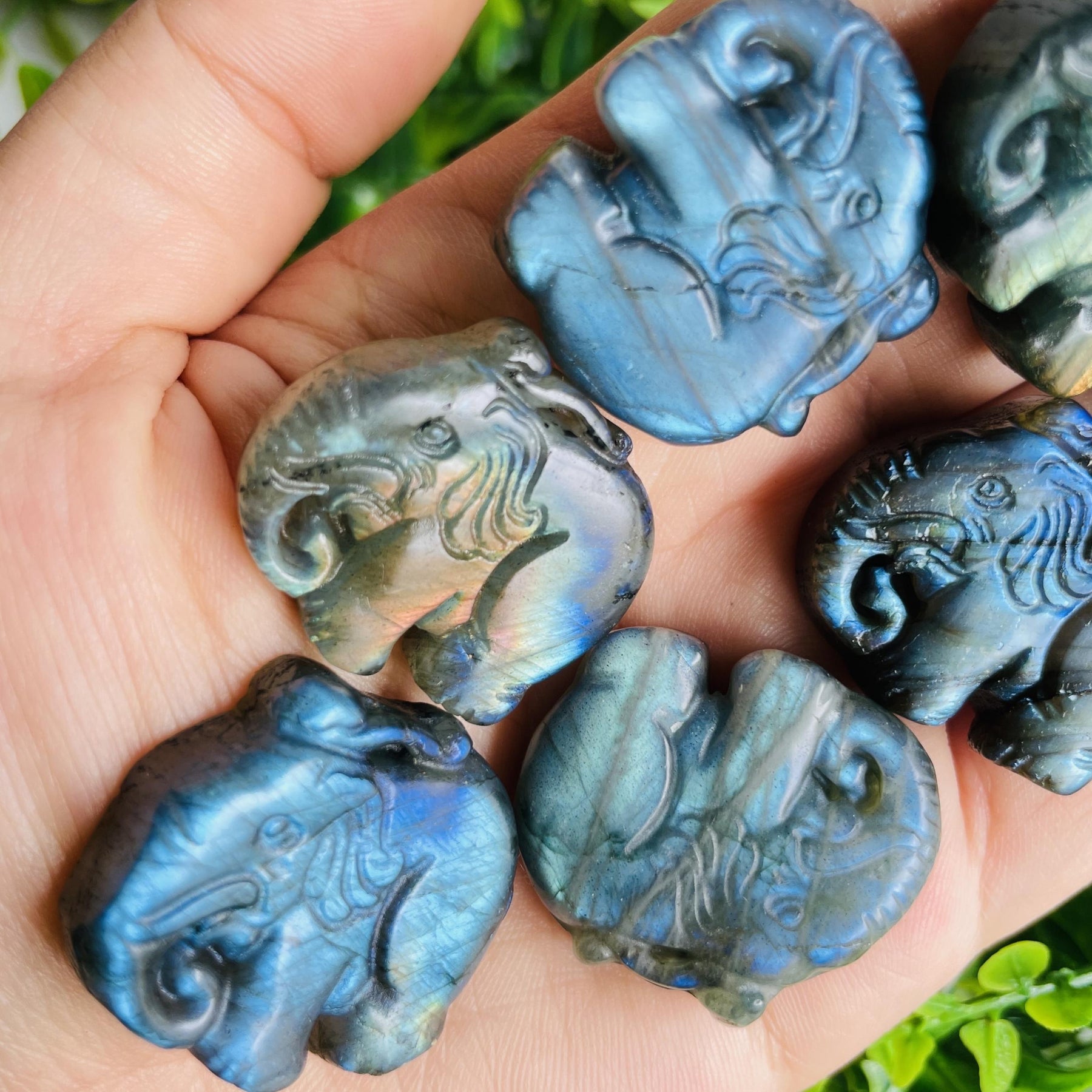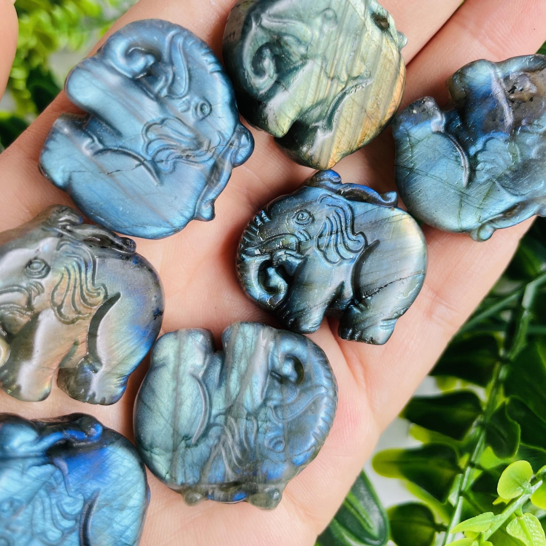 Enhance your space with this exquisite Labradorite elephant carving. The flash of colors in this natural stone makes it a unique and eye-catching decoration.