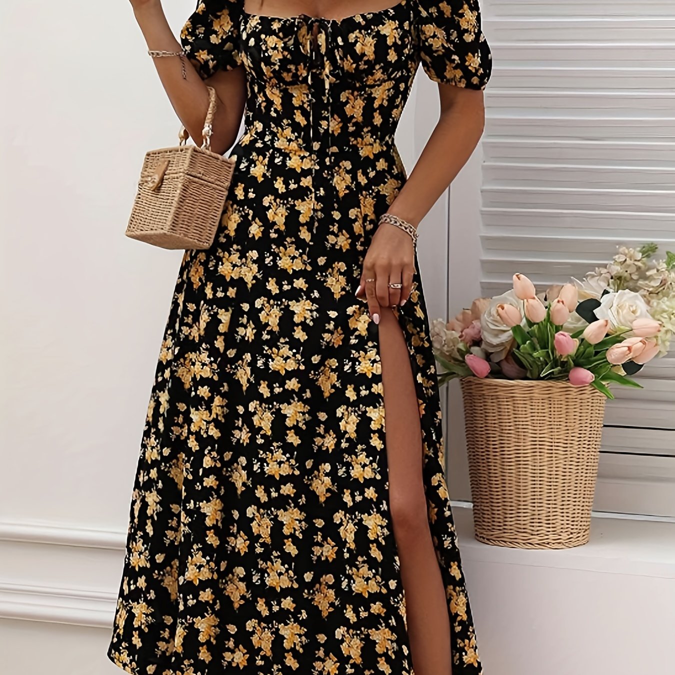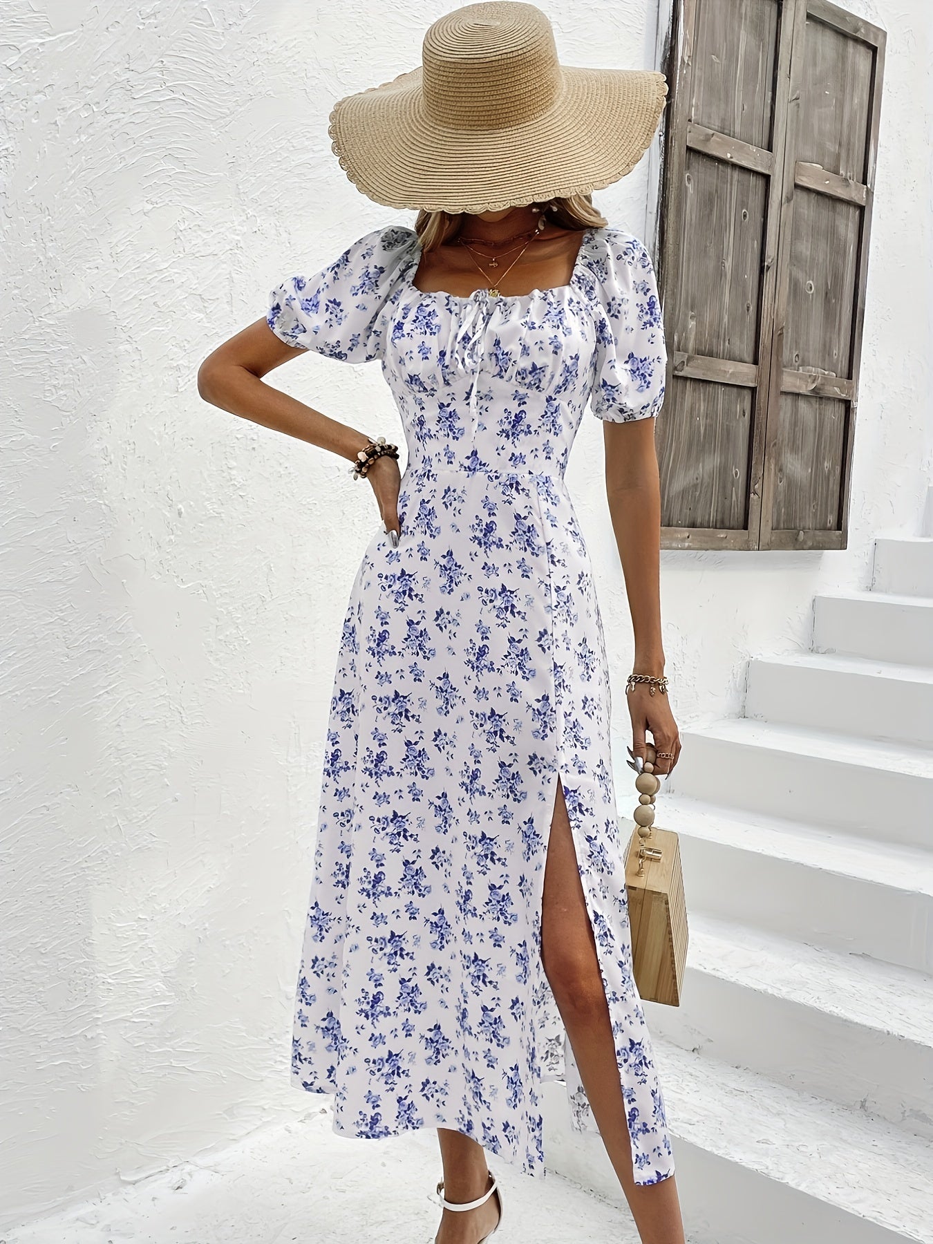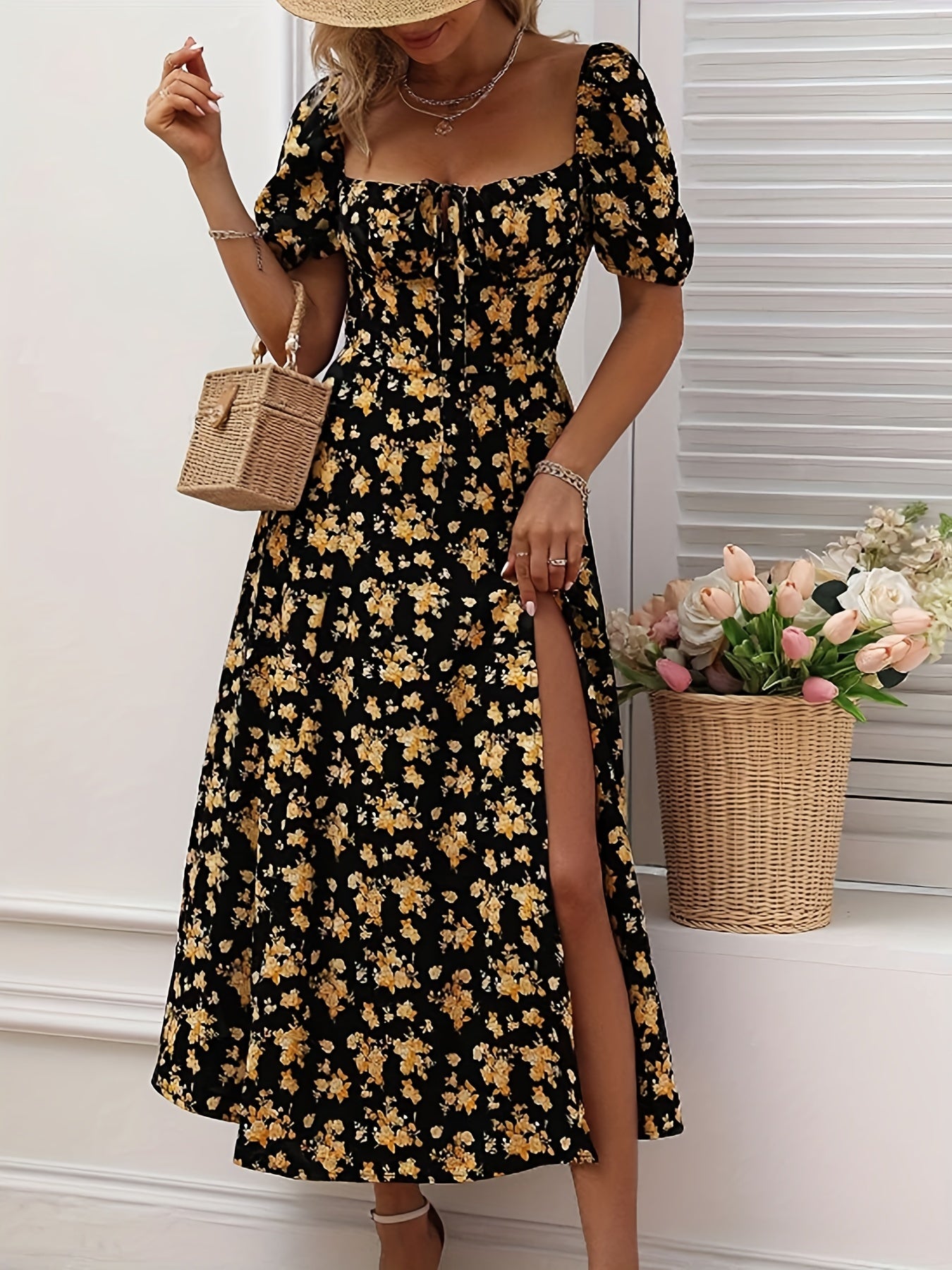 Floral Split Dress Square Neck Puff Sleeve Women's Clothing