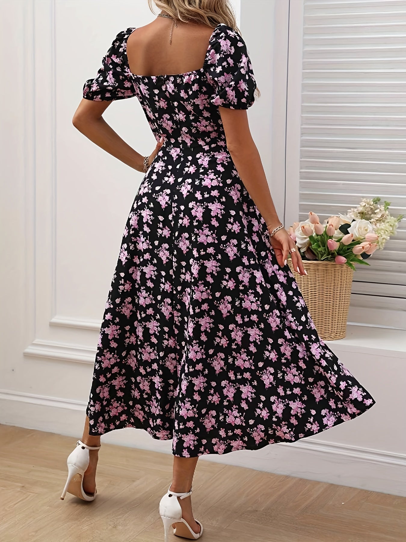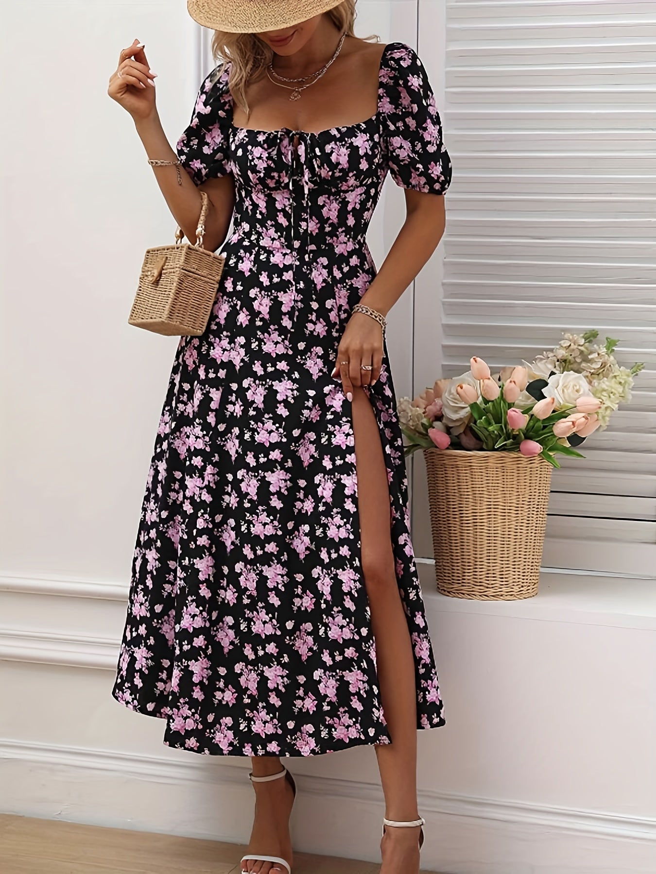 This stylish dress features a floral print design with a split detail and square neck. The puff short sleeves add a touch of elegance to the look.