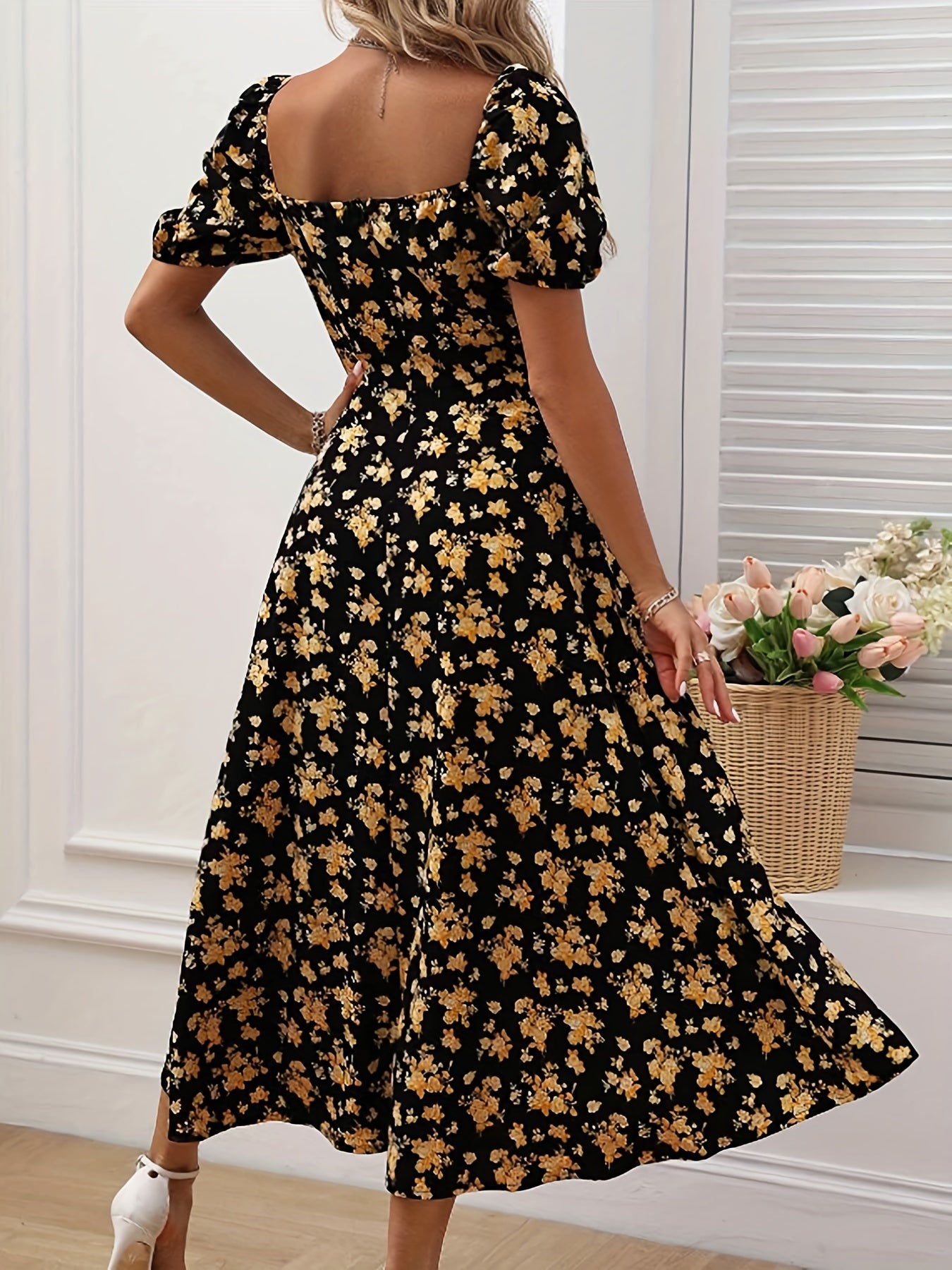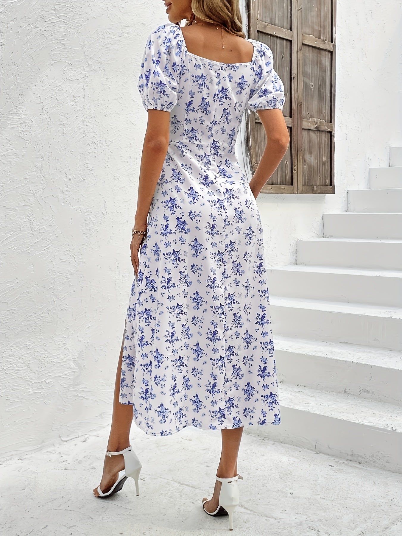 Floral Split Dress Square Neck Puff Sleeve Women&