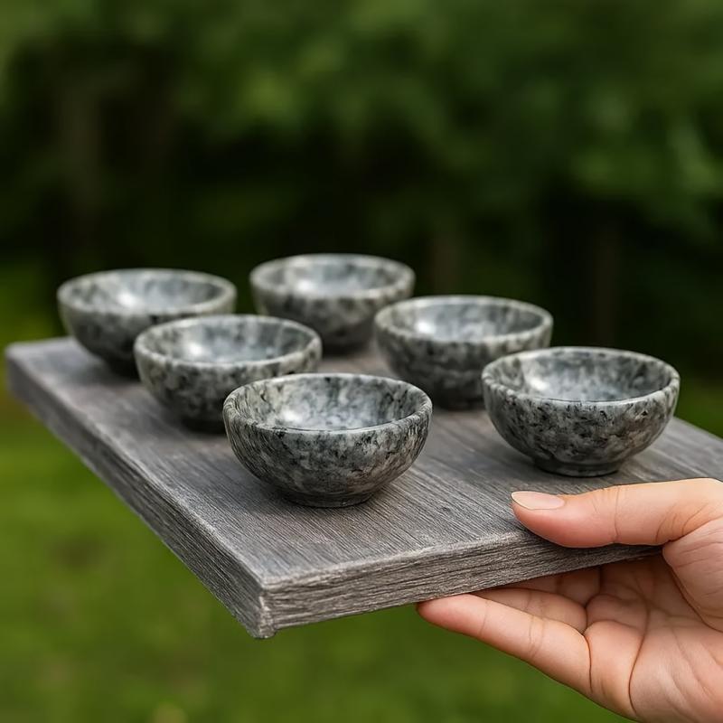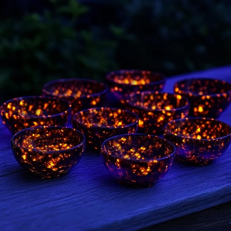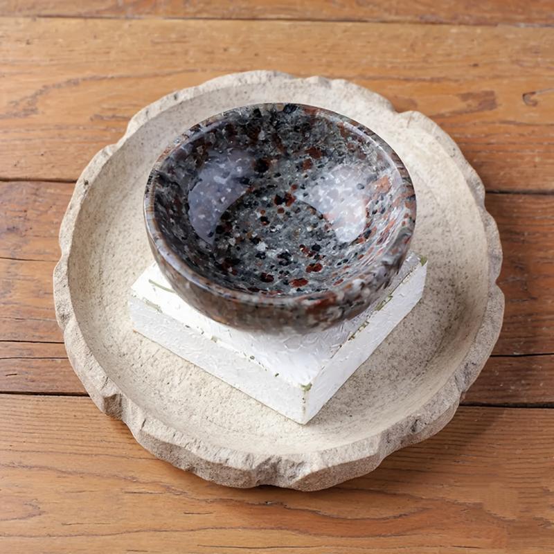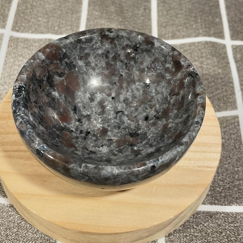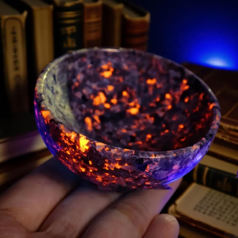 These unique bowls are crafted from natural flame stone and polished to a shine. When exposed to ultraviolet light, they react thanks to the fluorescent sodium feldspar, creating a stunning decorative effect.