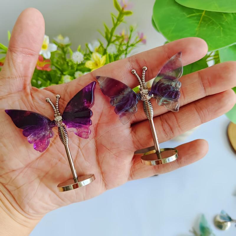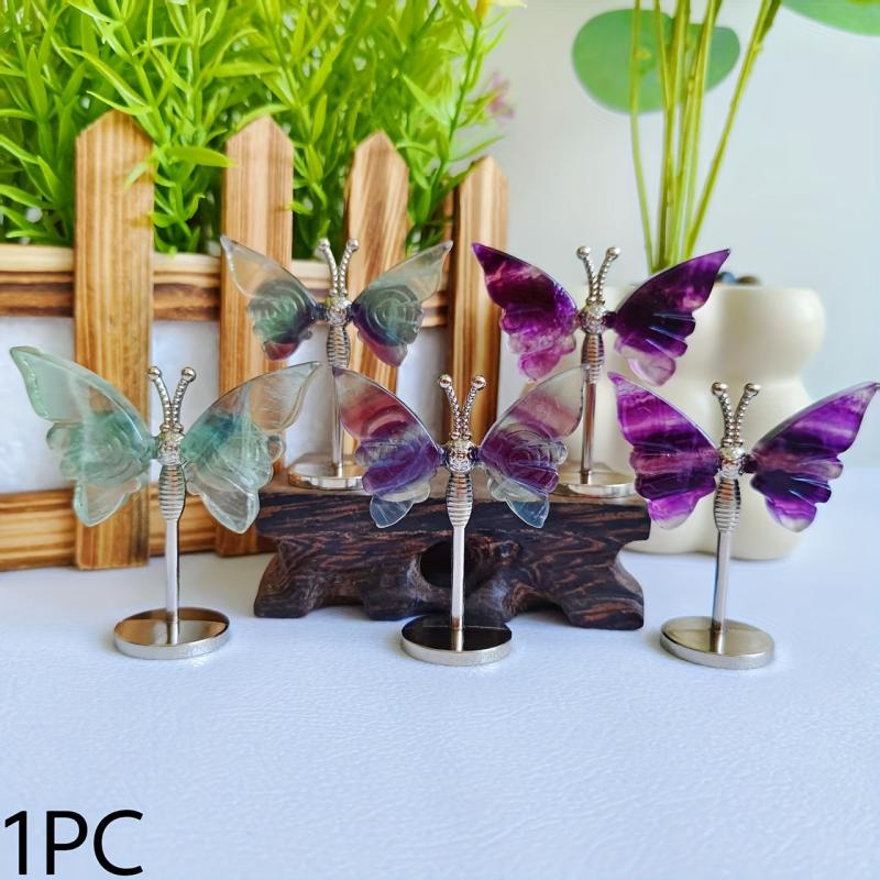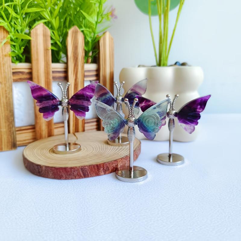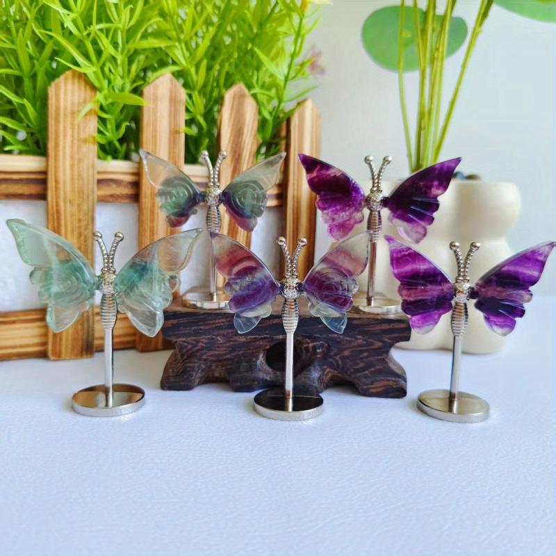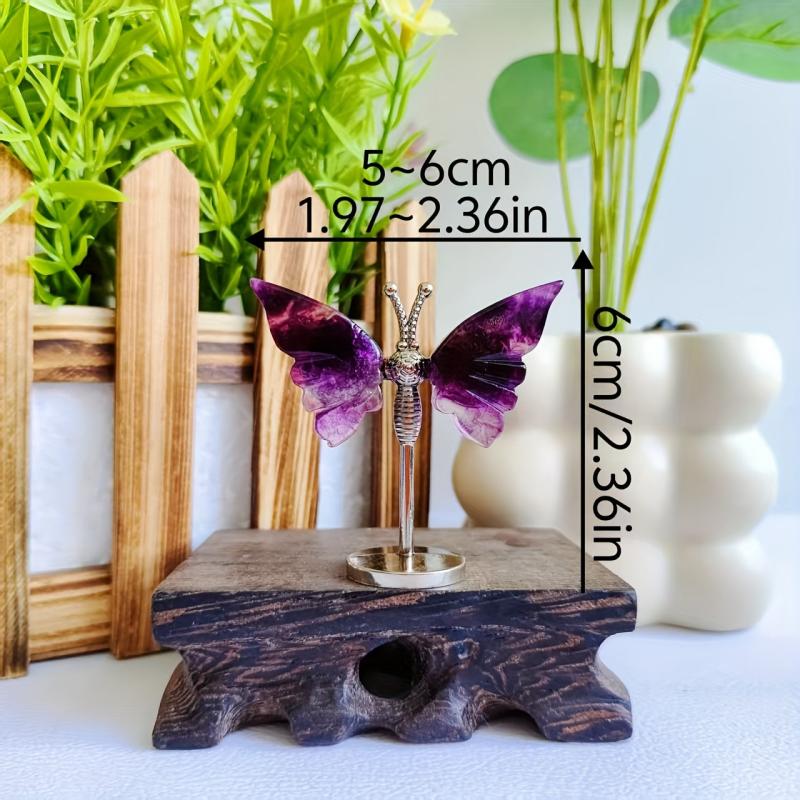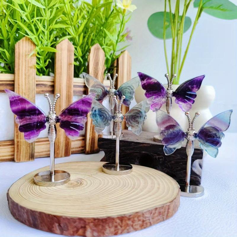 Add a touch of bohemian charm to your space with this stunning natural Fluorite Crystal Butterfly Ornament. The piece features a beautiful gradient of purple and pink hues, adding a pop of color and positive energy to any room.