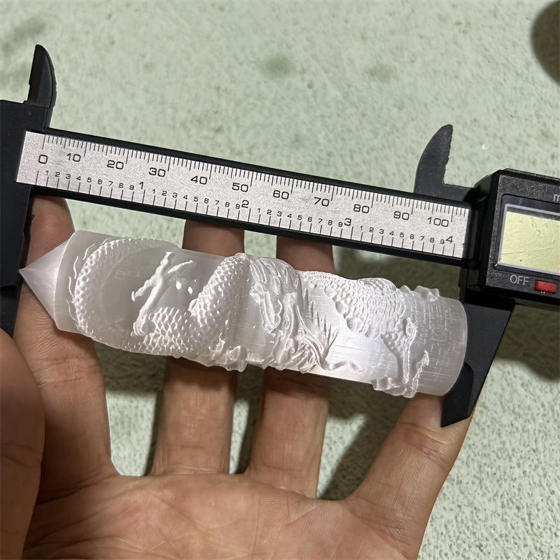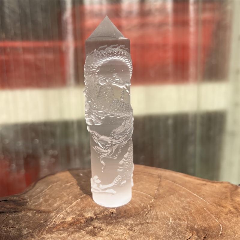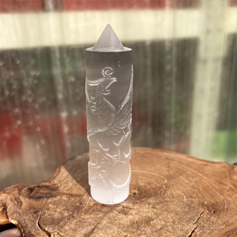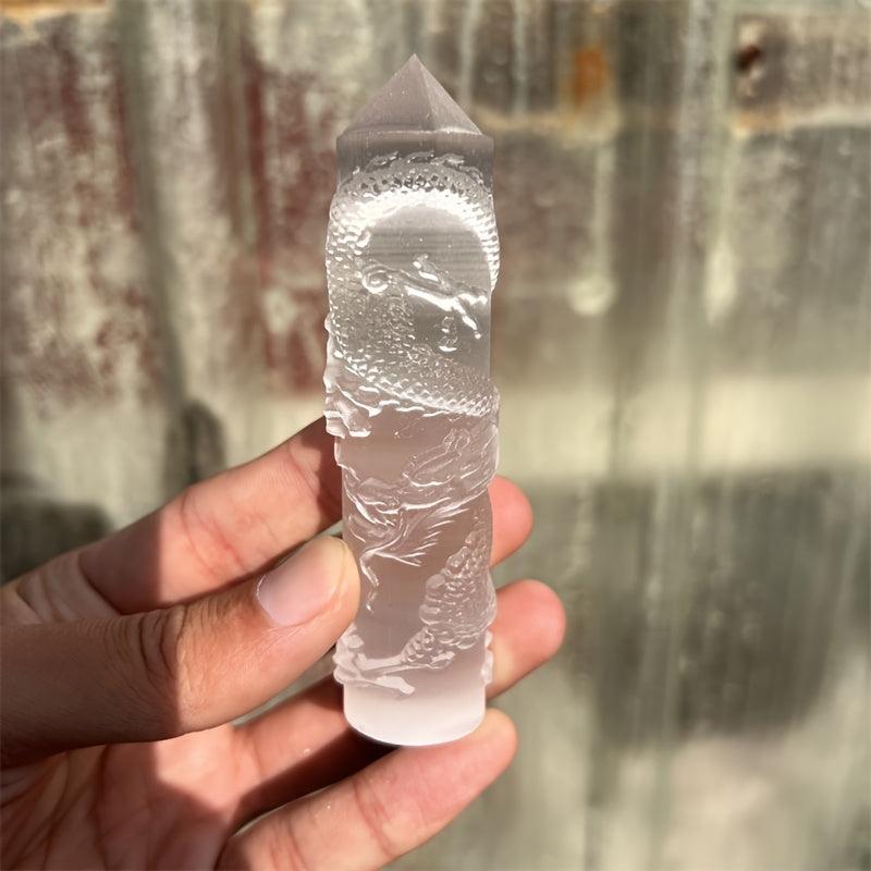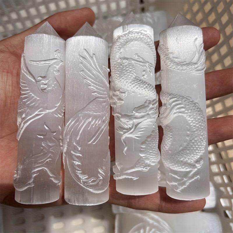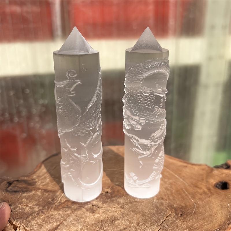 Stunning natural selenite tower featuring a dragon and phoenix pattern with good flash. Perfect for crystal healing and decoration.