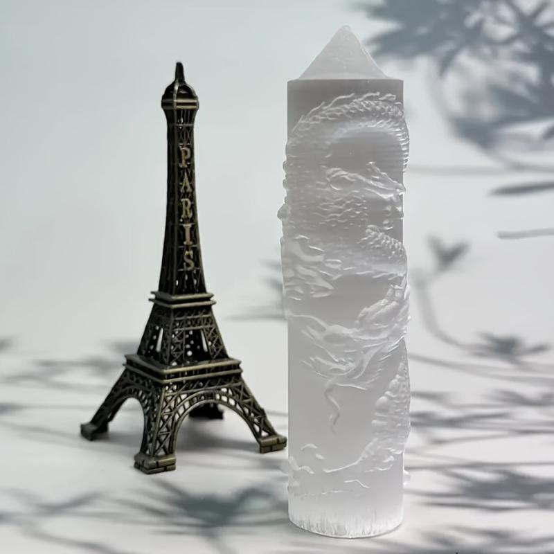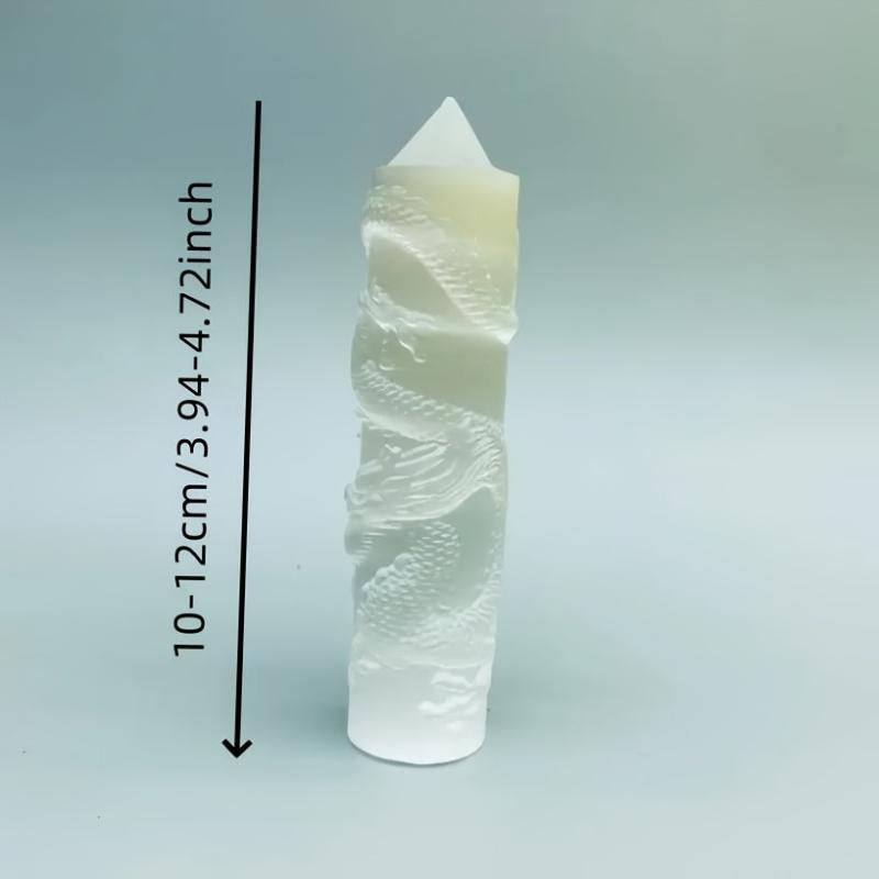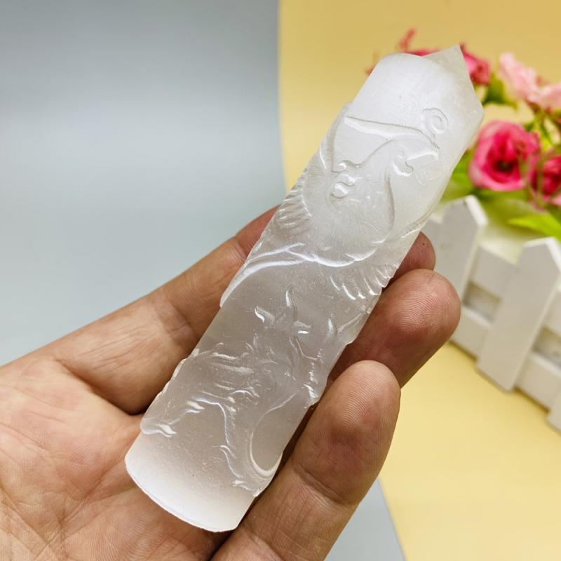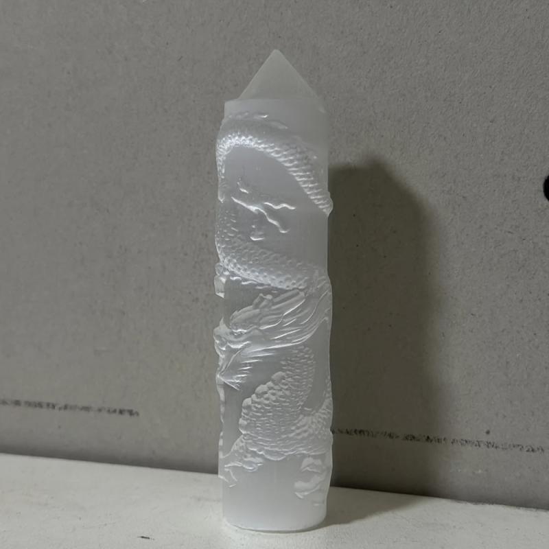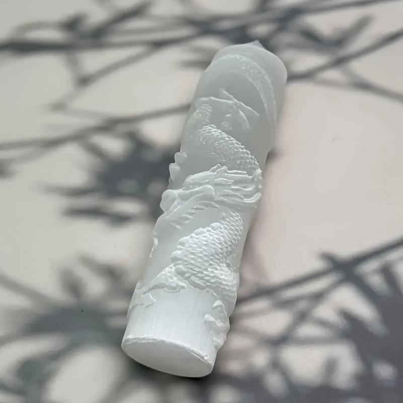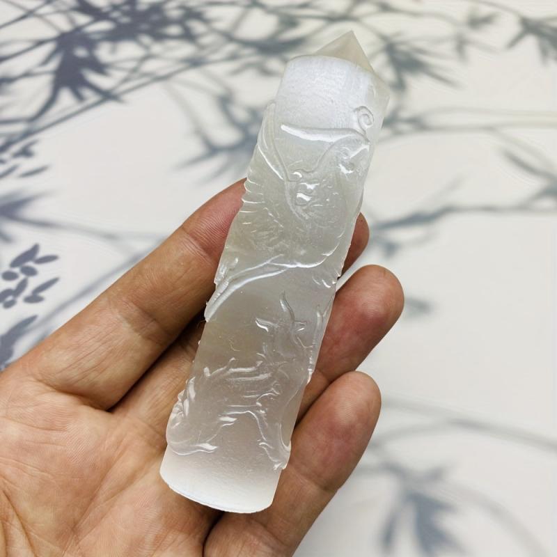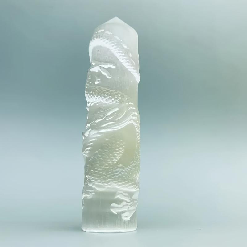 Beautifully hand-carved bohemian style selenite tower featuring a dragon and phoenix design. This natural stone gypsum jewelry accessory is perfect for Father's Day gifting.