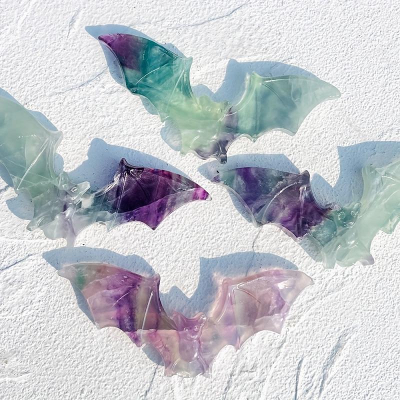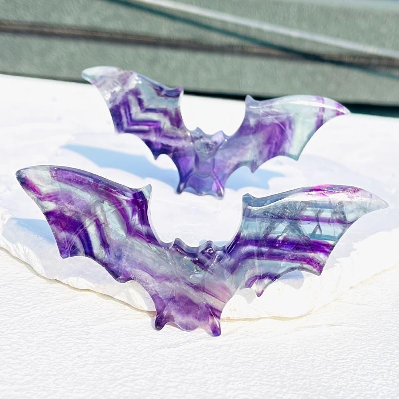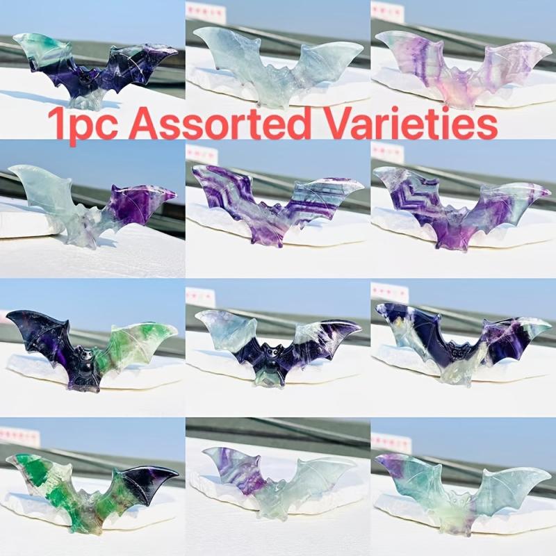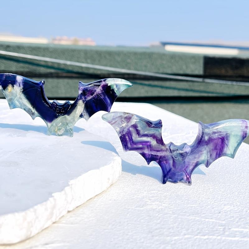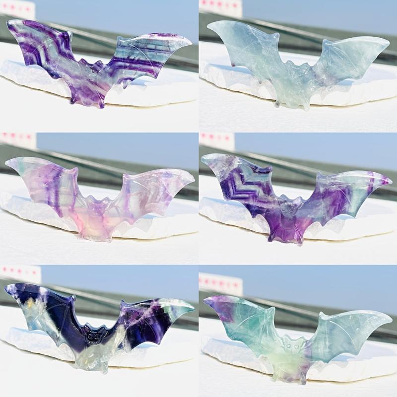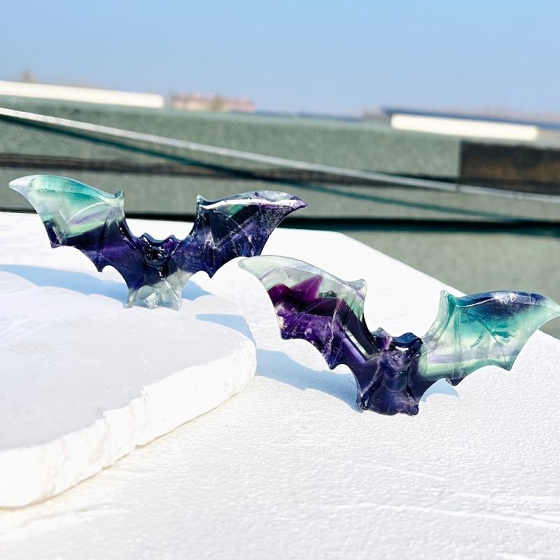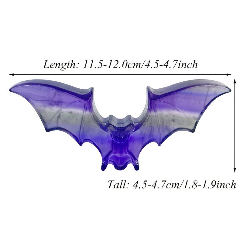 This unique crystal skull is handcrafted from natural fluorite, featuring a bat carving and colorful design. It makes a perfect Halloween decor or home gift collectible.