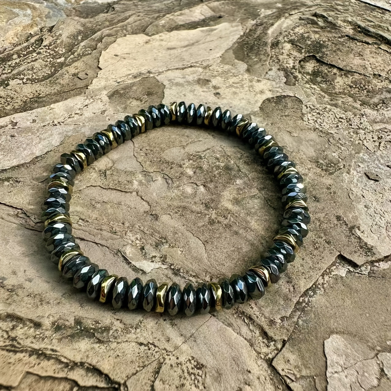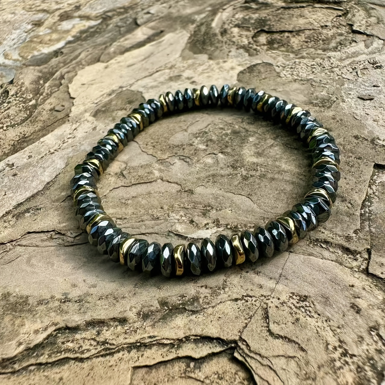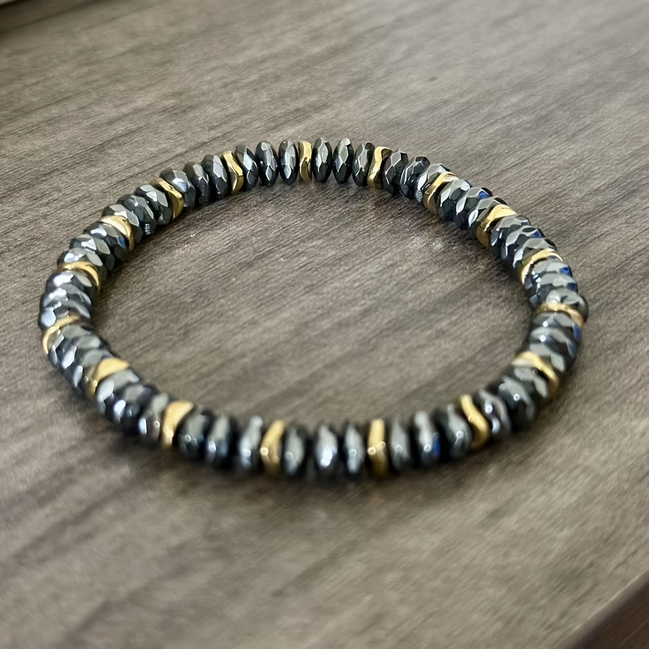 This bohemian style bracelet is designed with hematite beads and golden accents, perfect for success and grounding. It is suitable for men and women as durable everyday jewelry.