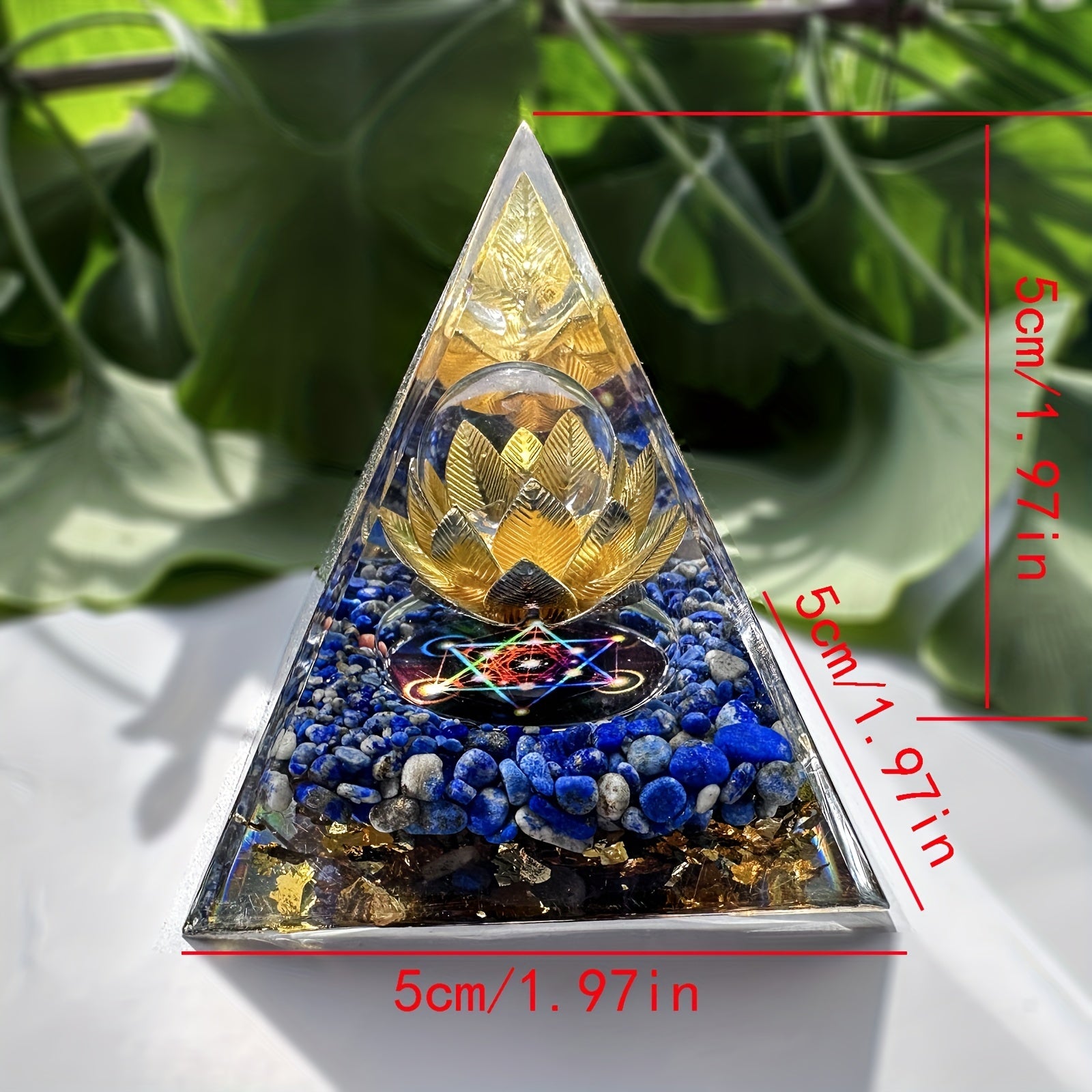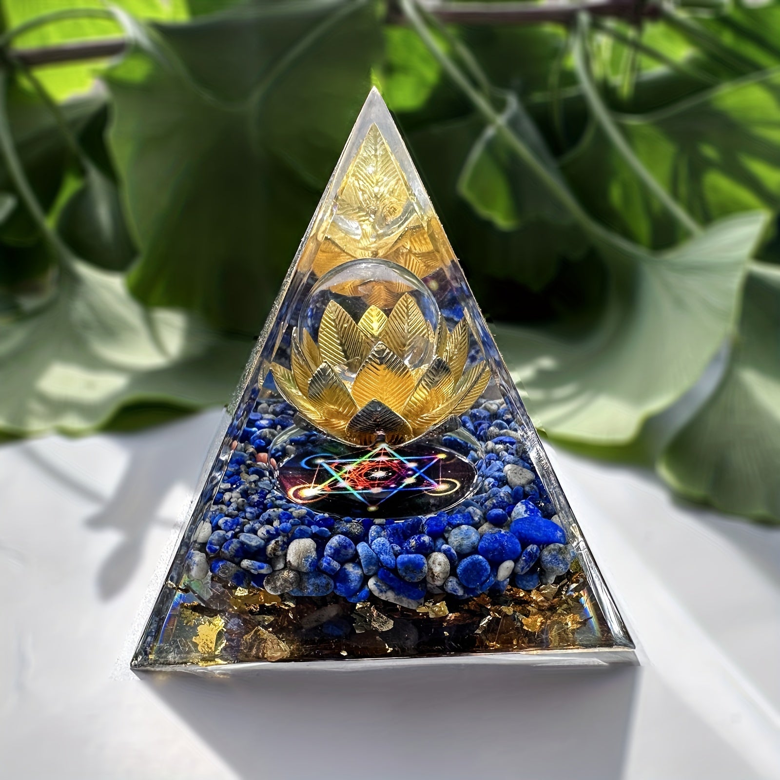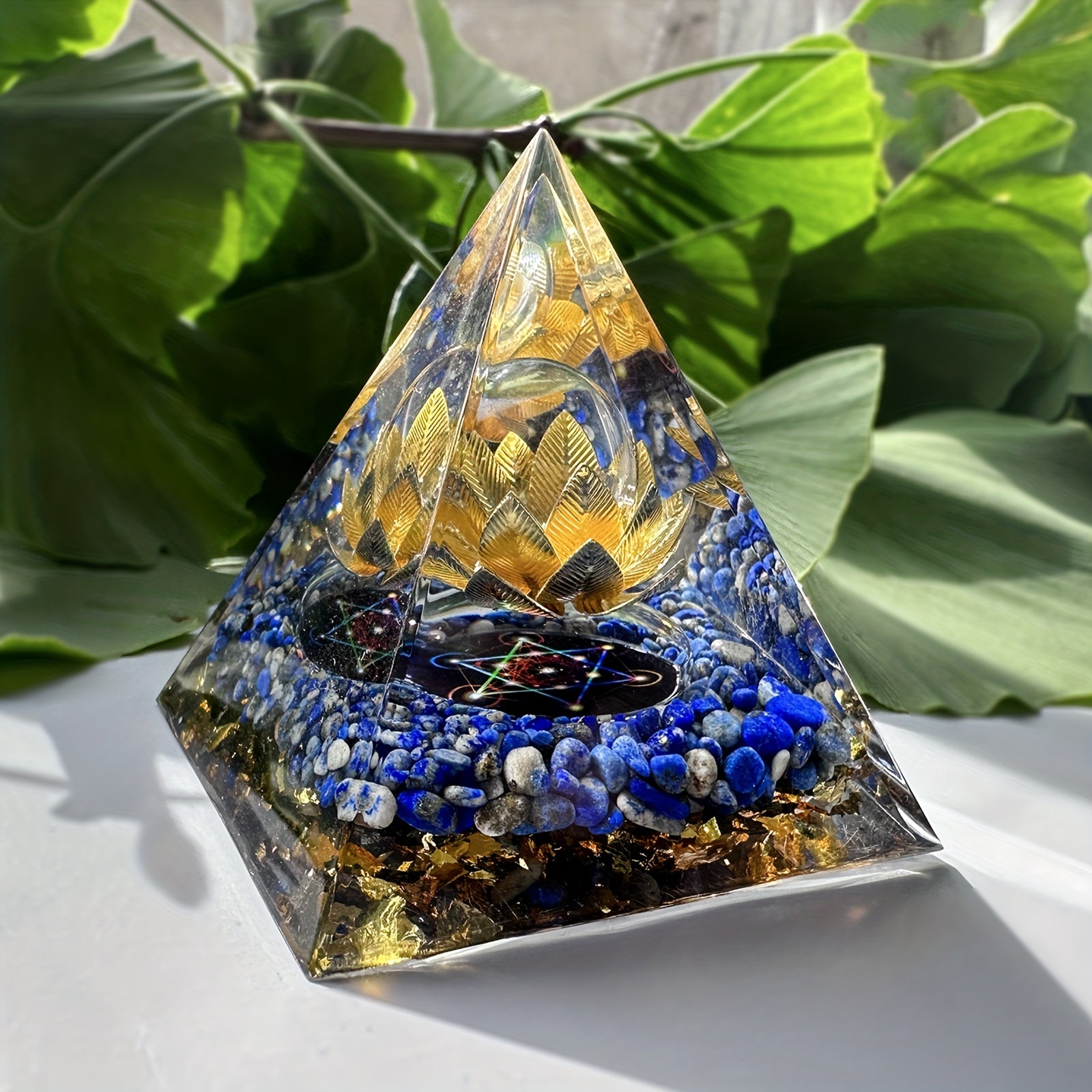 Harness positive energy with this orgonite pyramid featuring quartz and lapis. Experience healing benefits and balance your space.