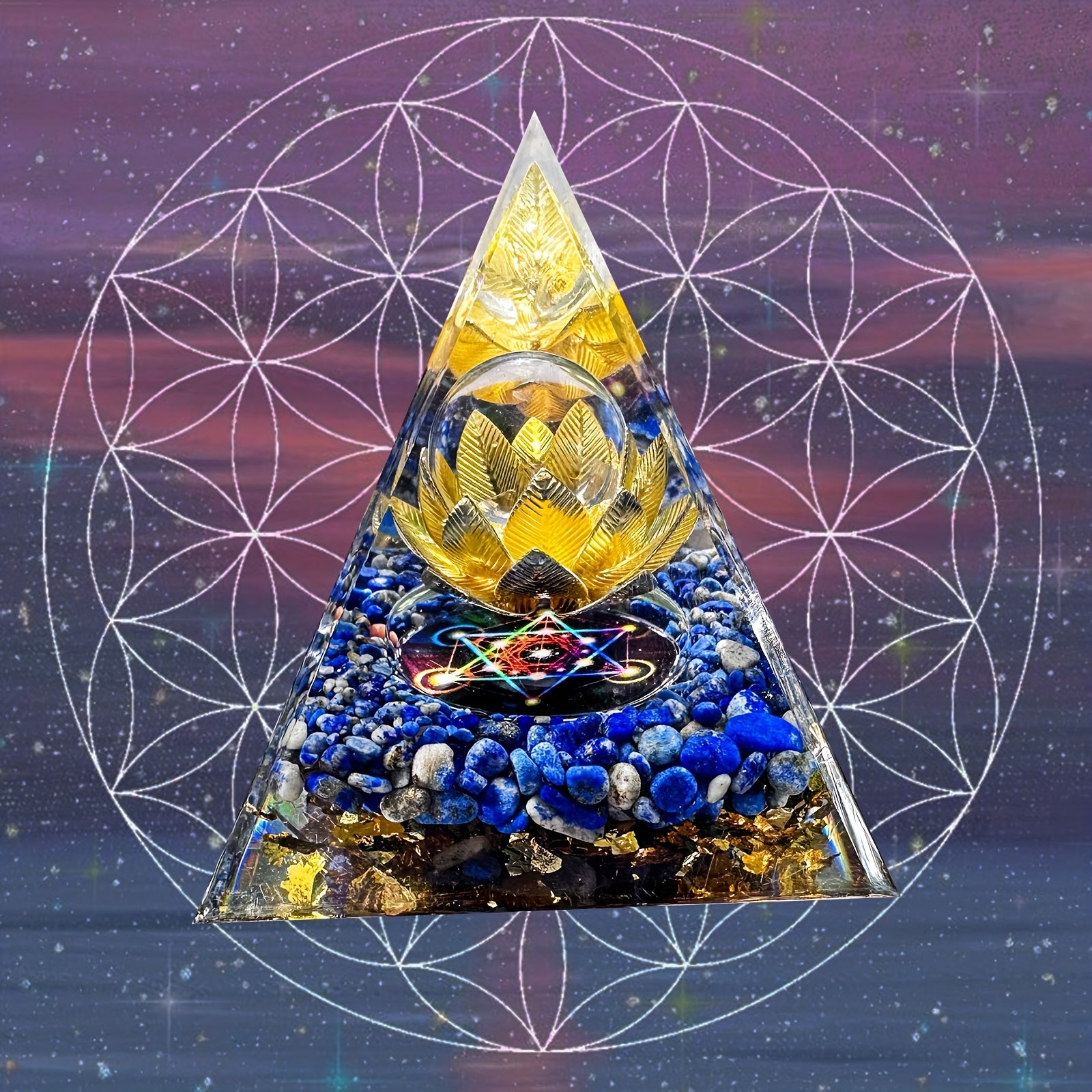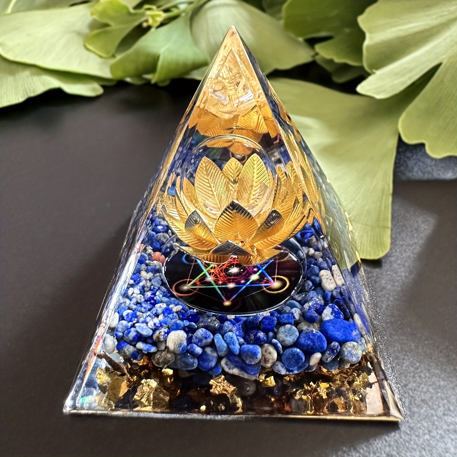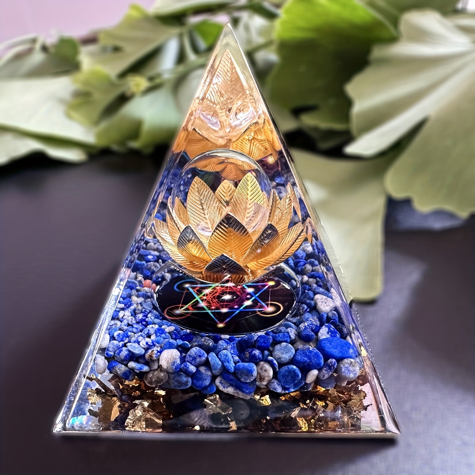 Harness positive energy with this orgonite pyramid featuring quartz and lapis. Experience healing benefits and balance your space.