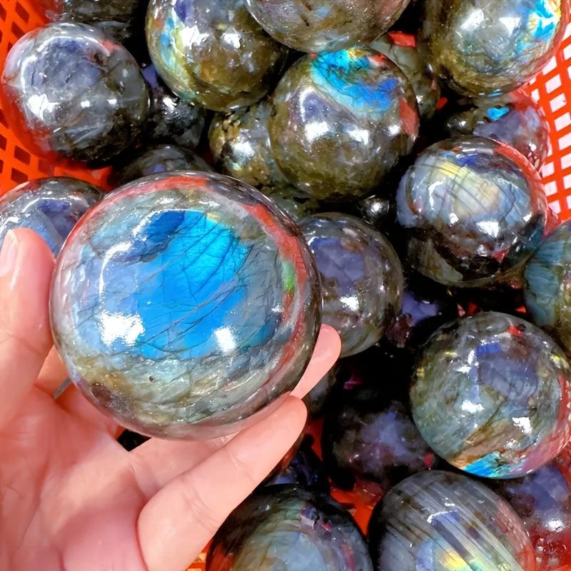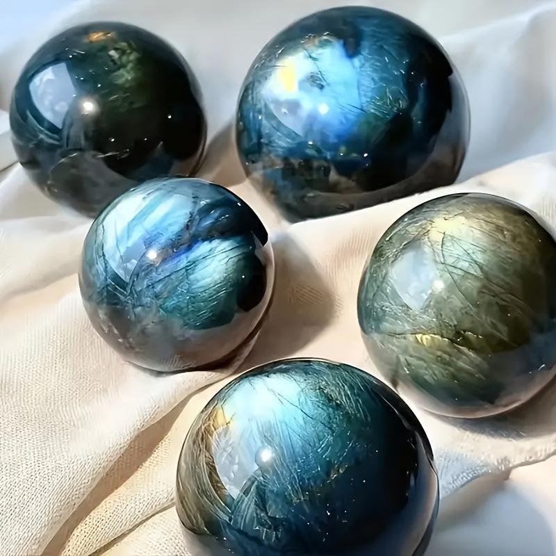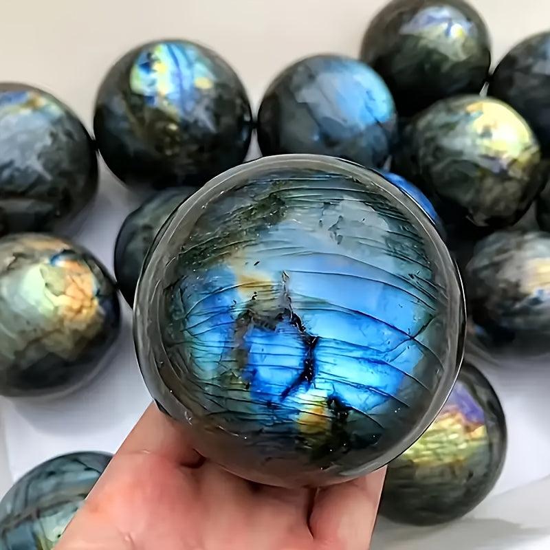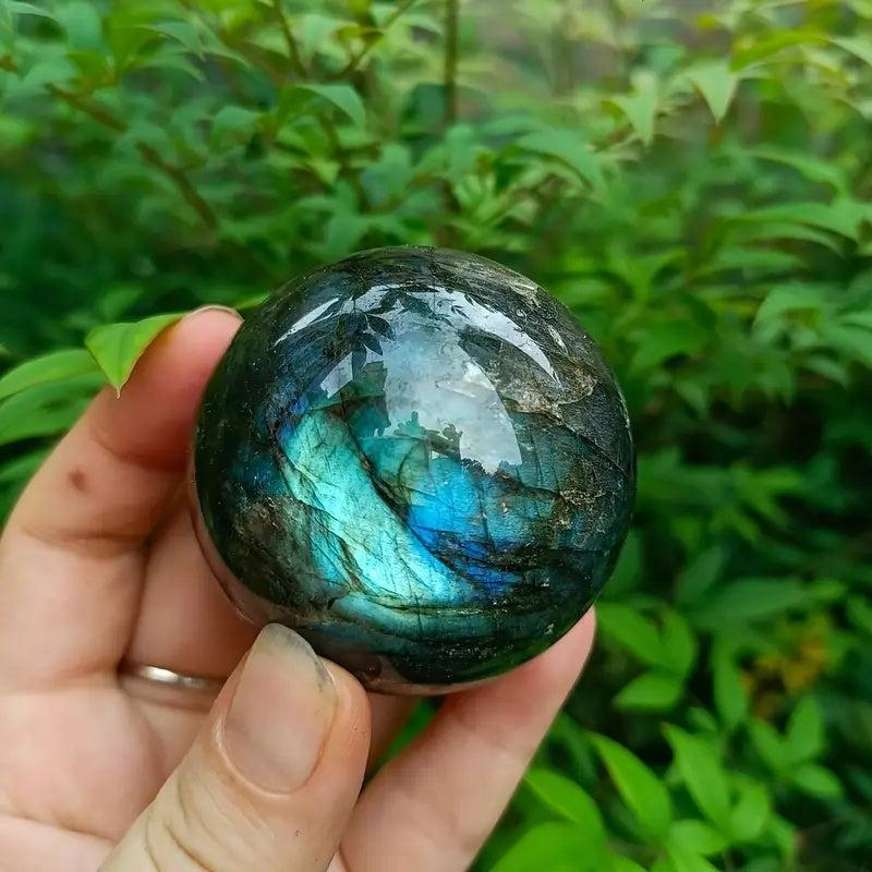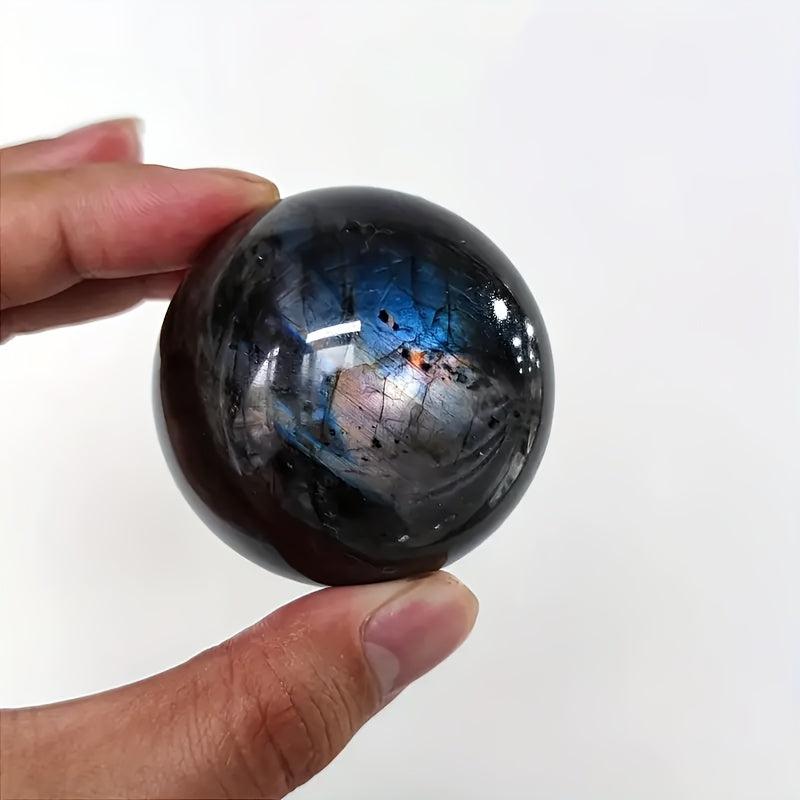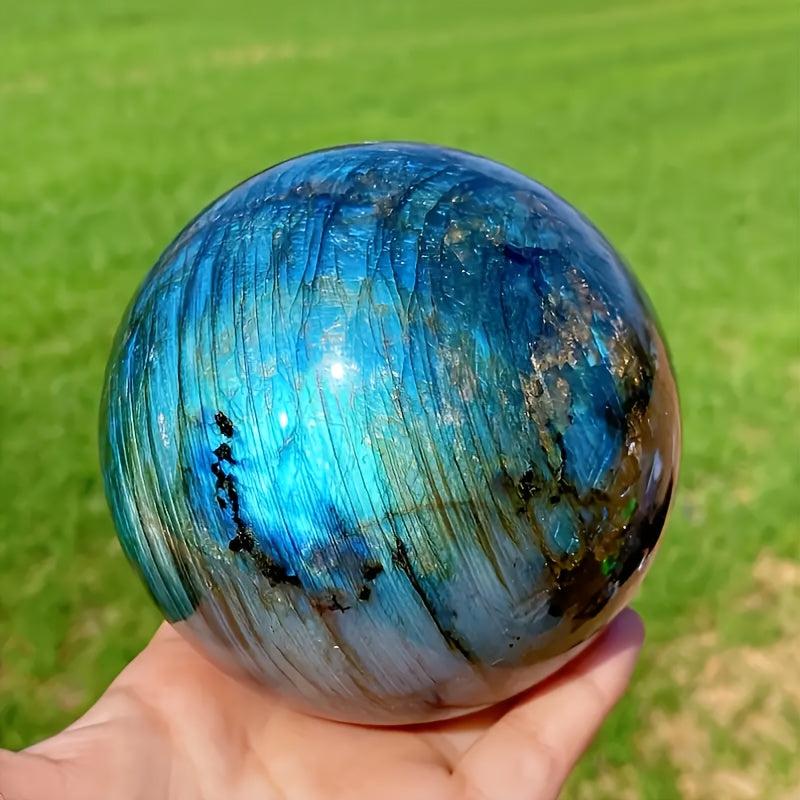 Add a touch of modern elegance with this unique Labrador crystal ball. Featuring vibrant green, red, and golden marbling, this polished stone is perfect for desktop display or home decor.
