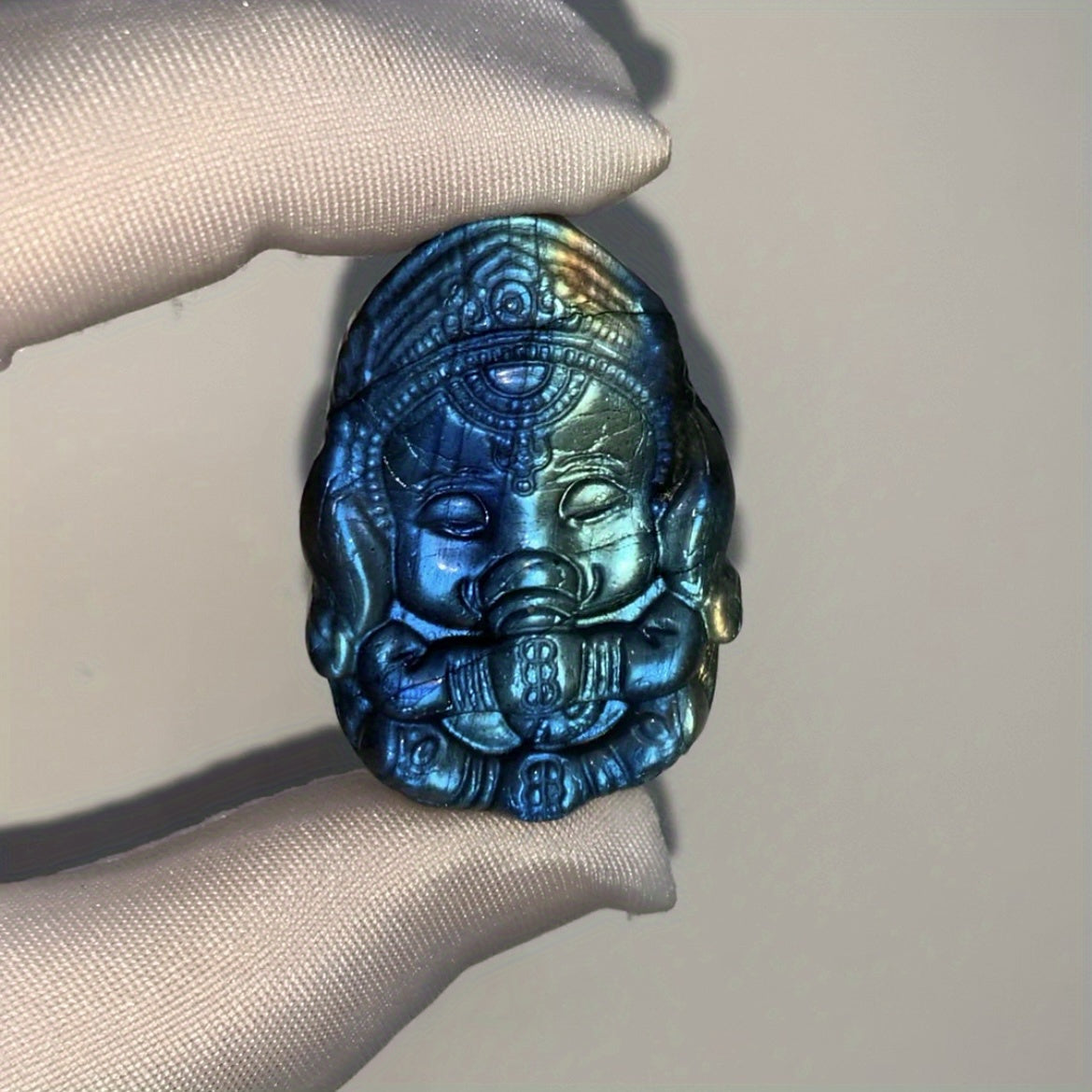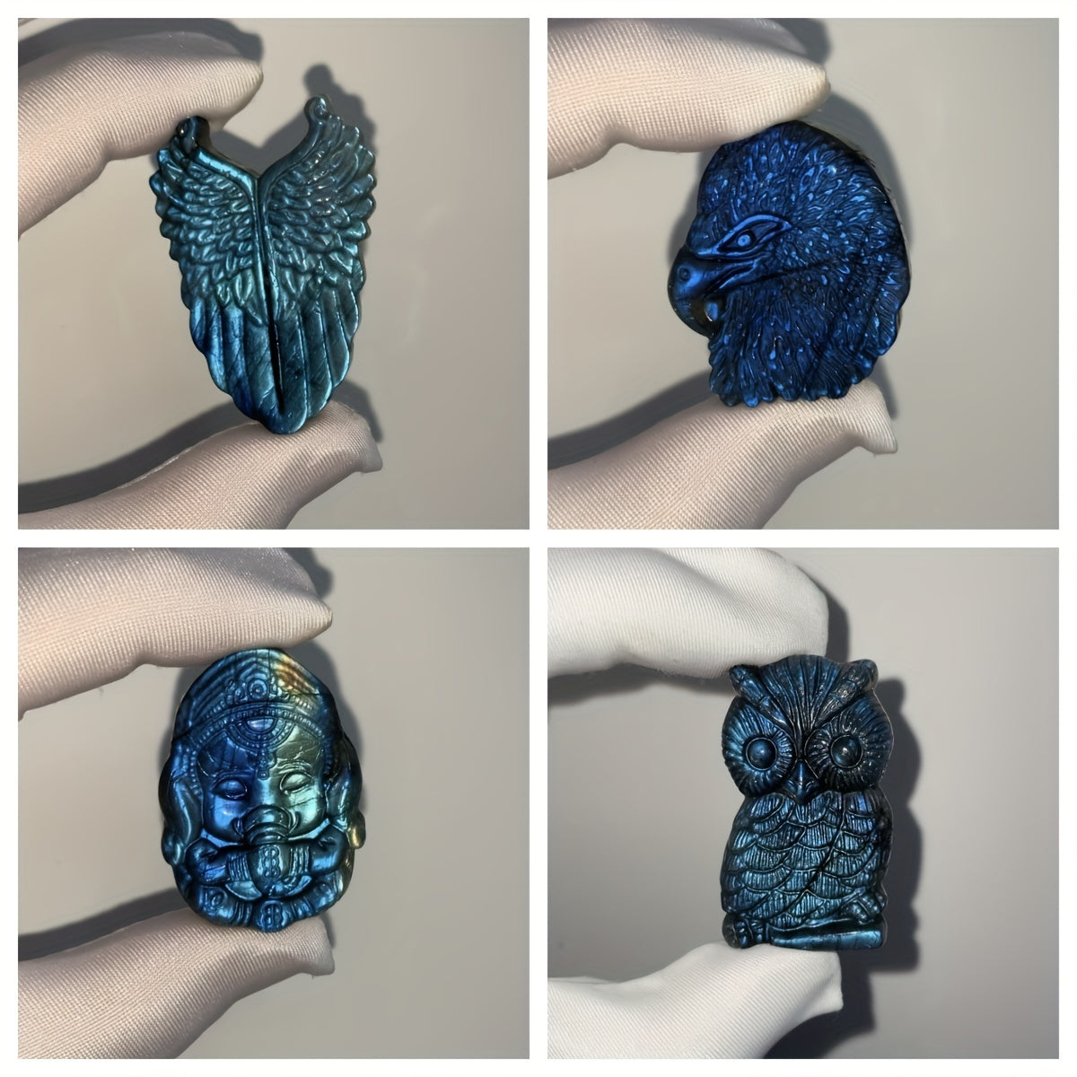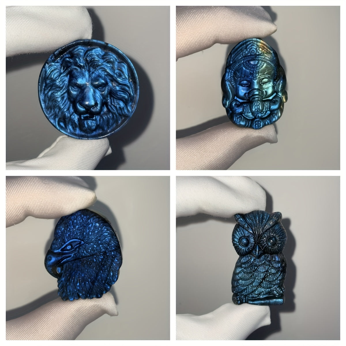 This natural Labradorite carving features various animal and celestial designs suitable for DIY projects or as a glittering crystal ornament.